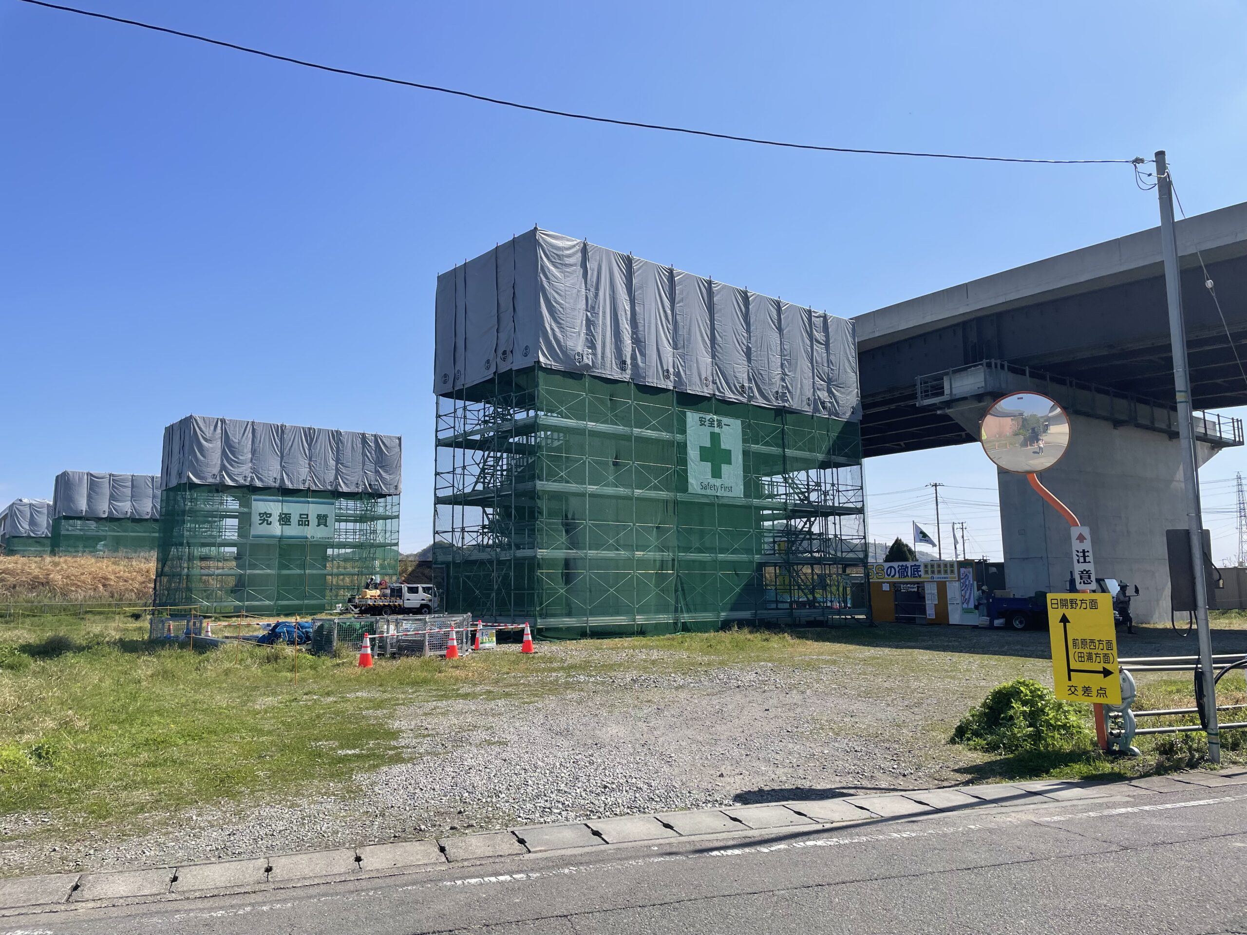 さて、橋を渡ったら遍路道を右折である。太い県道に別れを告げて住宅地へと入っていくと、雰囲気のある煉瓦造のJRの高架が出てきた。2時間ほど前、文化の森駅に戻る時にこの上を電車で通過したはずだ(ちょっと切ない)。高架をくぐってしばらくすると大規模な道路工事の現場があり、巨大な橋脚が何本も建てられていた。どうやら高速道路を建設中のようで、「国土強靭化対策工事、国土交通省」と書かれた看板に職業(過去)柄つい見入ってしまう。国の事業ともなると受注も大企業なんだなあ。