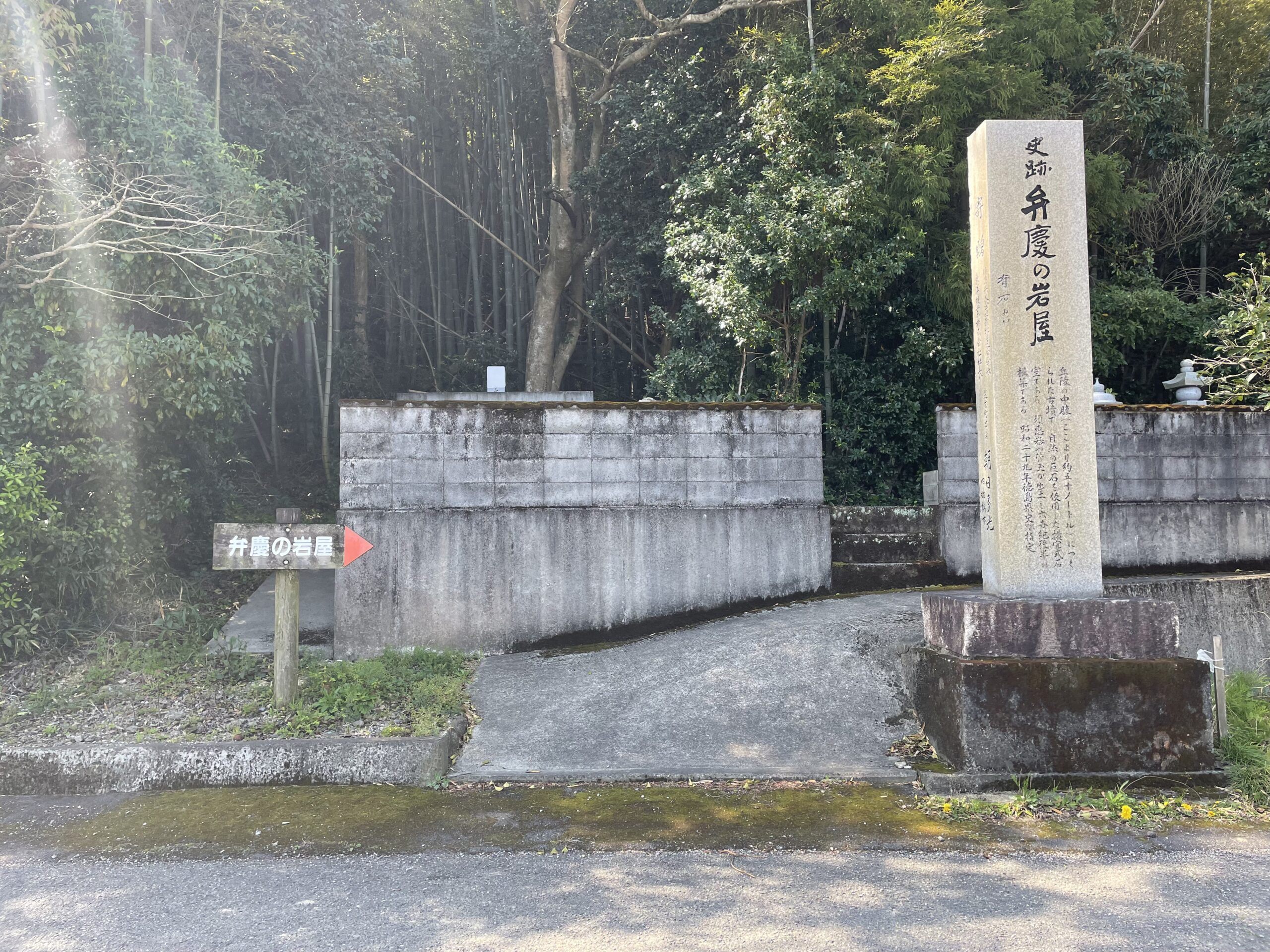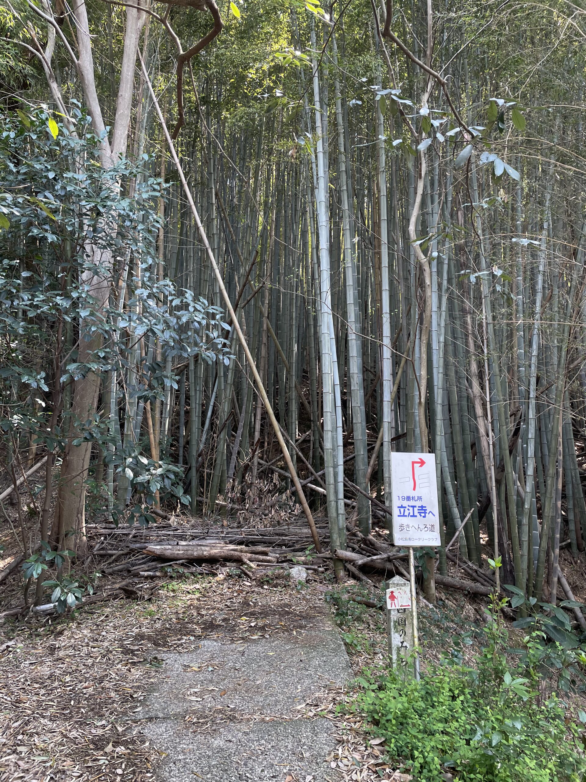 牛さんゾーンを過ぎた先の看板に従って右折すると、静かな竹林が続いていた。たけのこが皮を落としたばかりの若い竹が多いと見え、鮮やかな緑(まさに「若竹色」)が爽やかで、針葉樹や広葉樹の森よりも明るく感じる。恩山寺の山門のところから始まった「小松島南ロータリークラブ」の案内板はとても丁寧で分かりやすく、迷うことなく歩くことができた。この道も義経の道となっており、敵を警戒しながら登った「弦張坂」、もう大丈夫だと弓の弦を緩めて巻いた「弦巻坂」などの説明板があった。