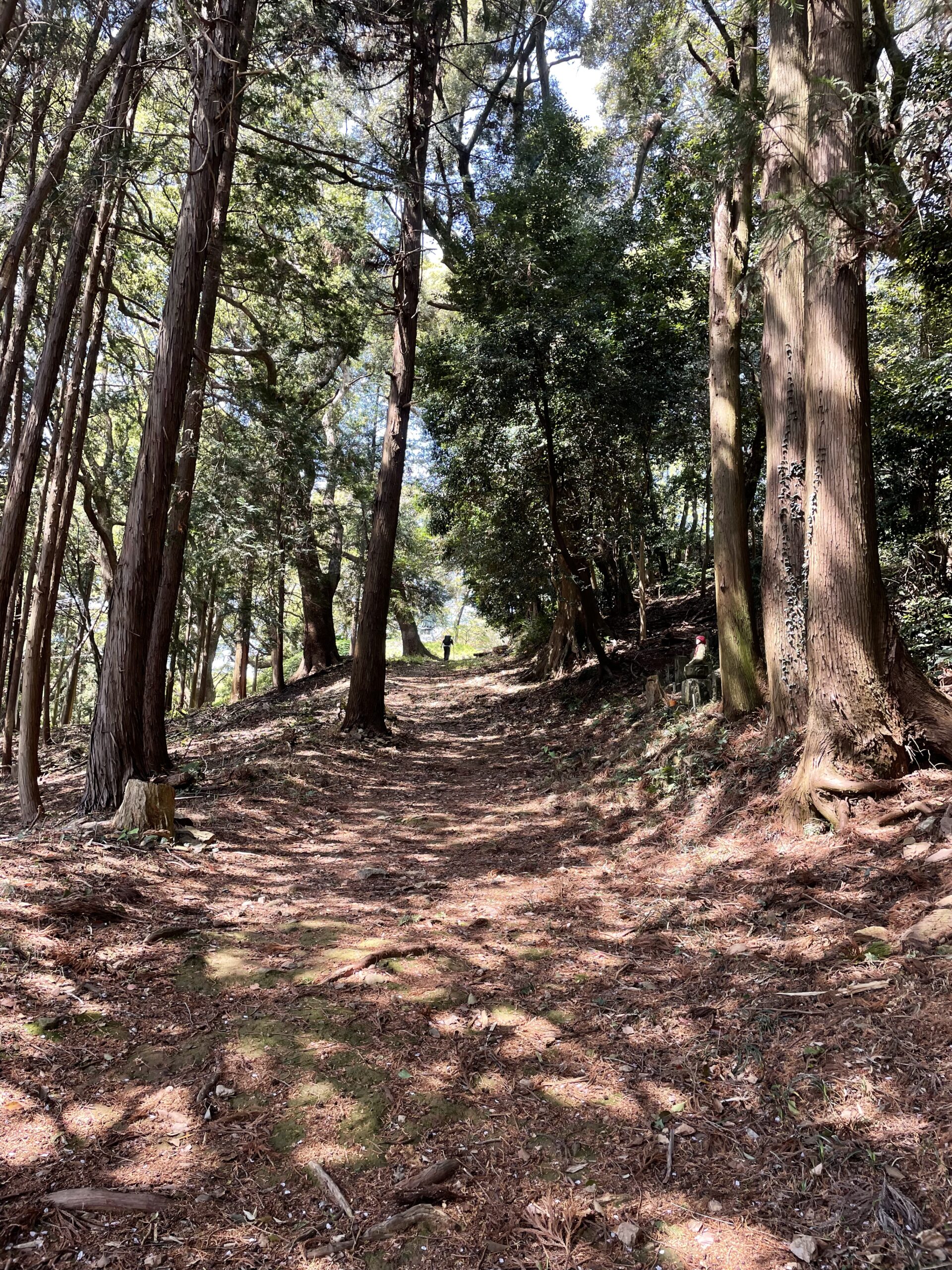 ・県道ルートより500mくらい長いが、車がほとんど通らないので快適に歩ける。竹林やみかん畑、田んぼの間を通っていくのどかな道で、江戸時代の真念さんのしるべ石やお地蔵さまもあり、古道の雰囲気を感じられる。小さな峠っぽいものをいくつか越えるが、特筆するほどのアップダウンはない。