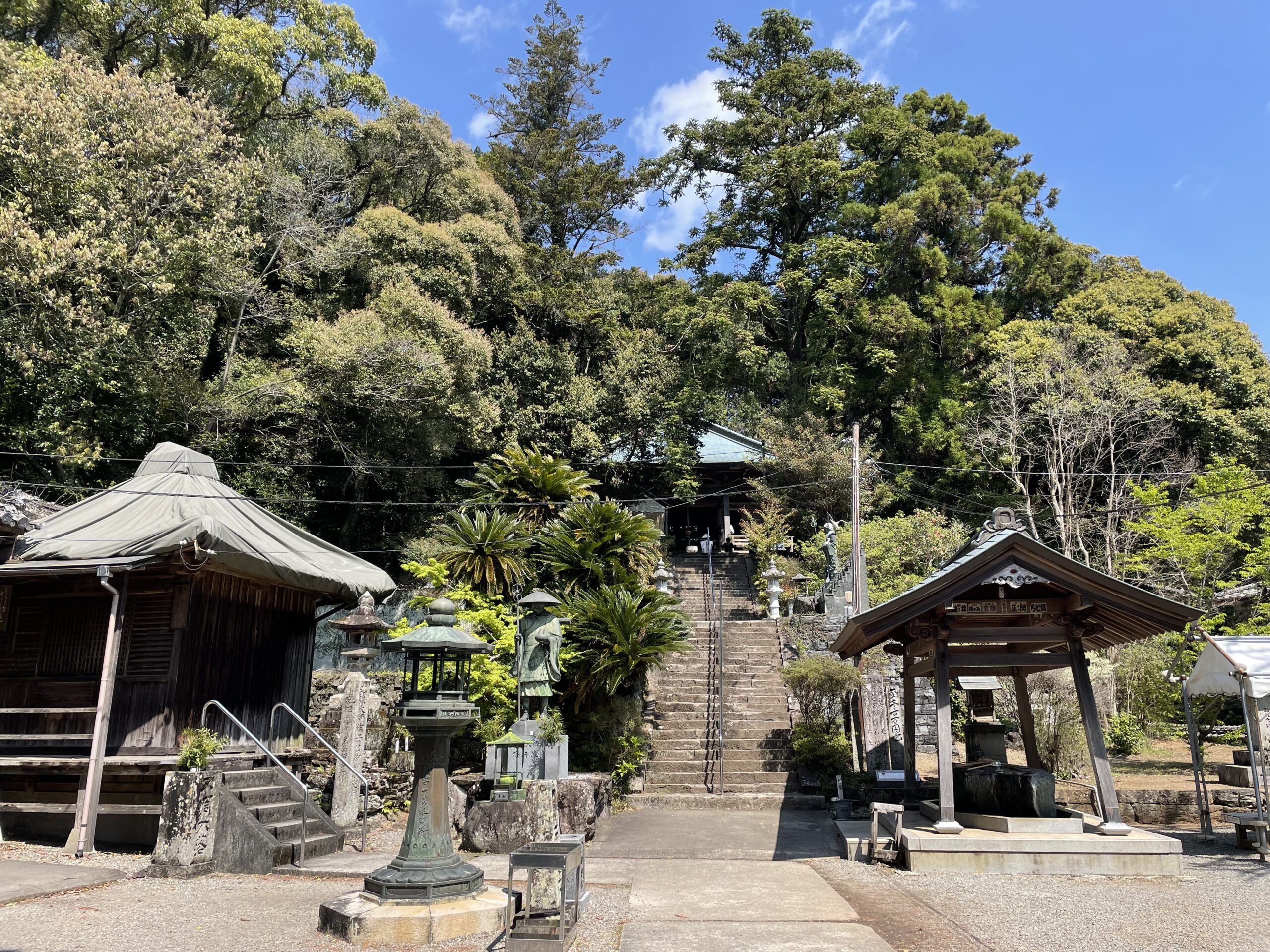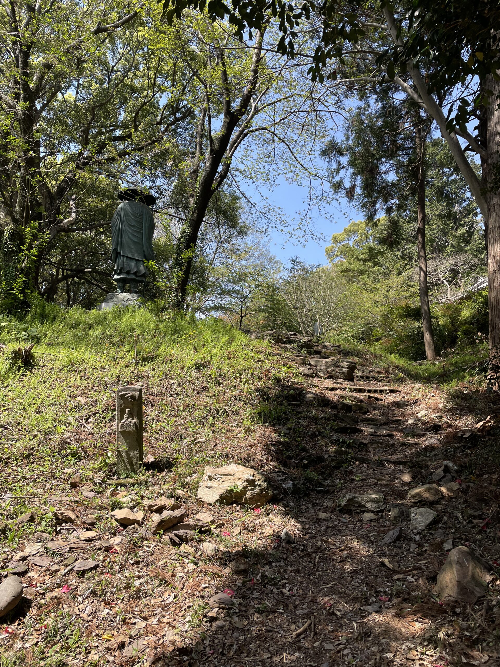 教えてもらったとおり山門を通って参道に入ると、しばらく車道と並走していた歩き遍路道は次第に山手の方へと離れていき、それに伴って傾斜もきつくなっていく。しばしの峠道気分だ。登りになると急激に歩みが亀になり、さっき山門のところで一緒になった若い男子はあっという間に小さくなってしまった。たくさんの仏さまやお地蔵さまに見守られながら5分ほど山道を登っていくと「修行大師像」の背中が見えてきて、境内に到着した。