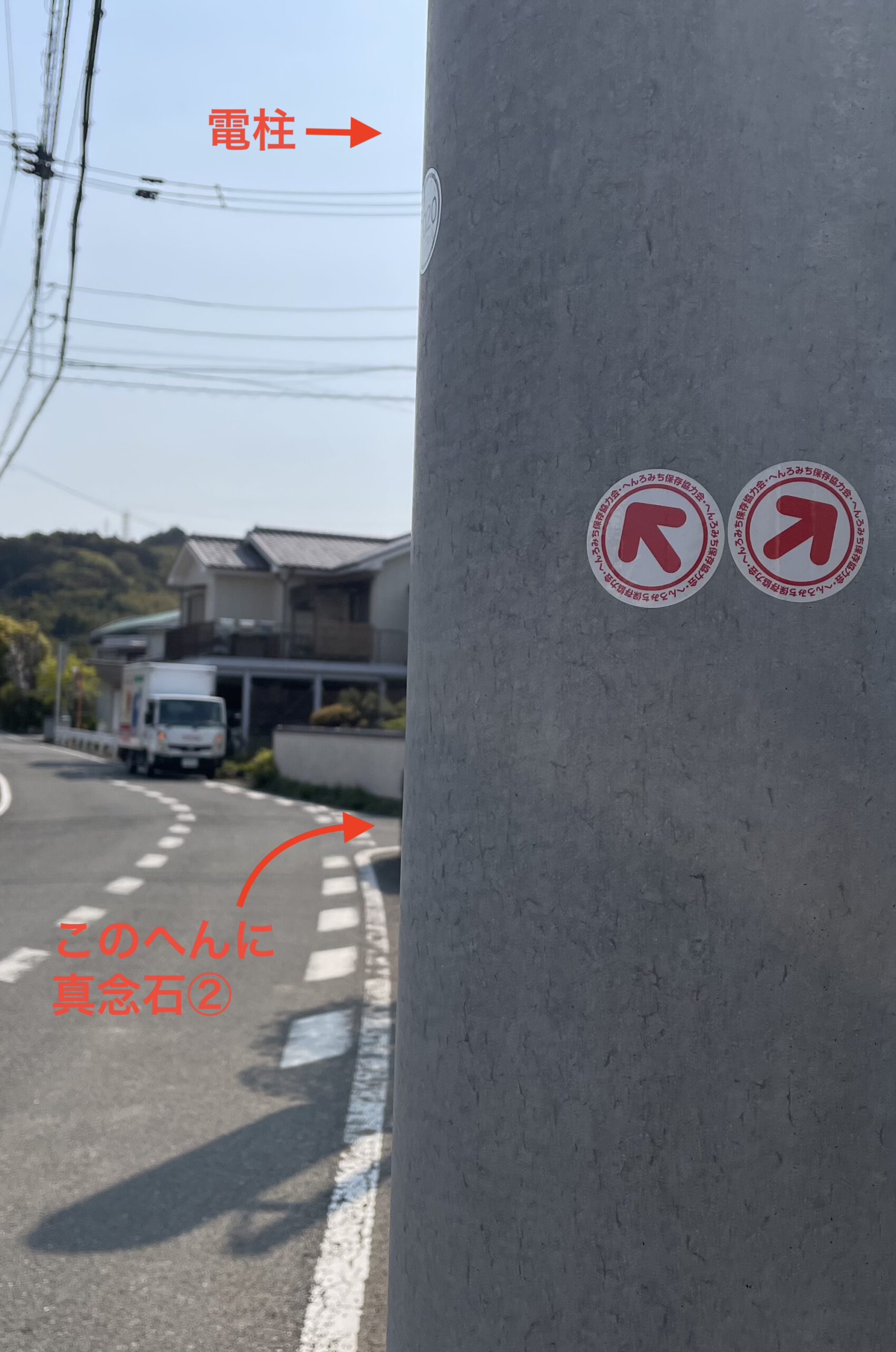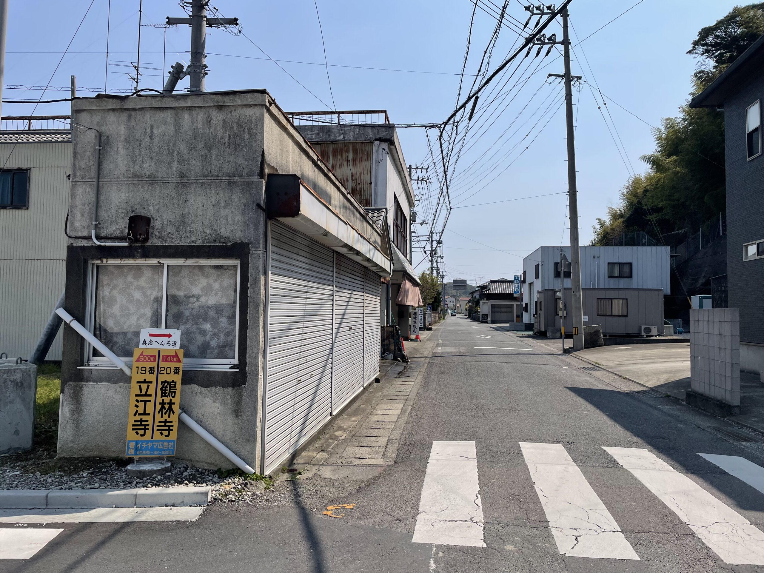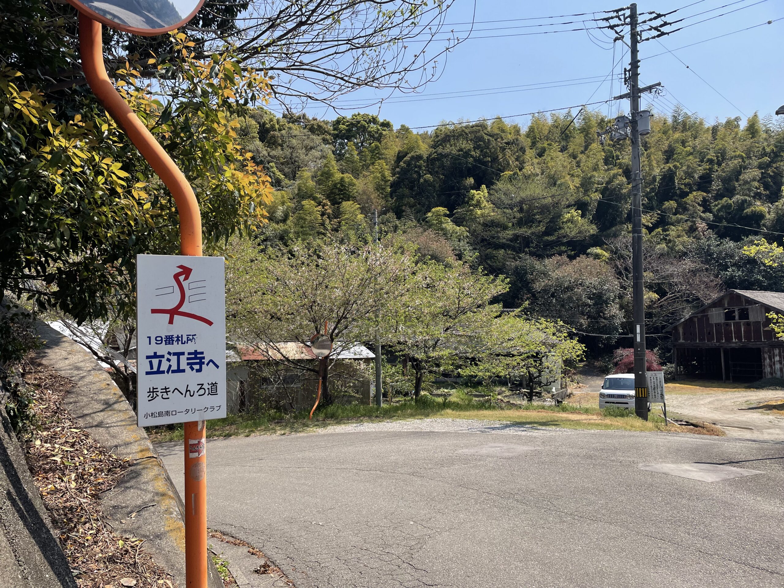 橋を渡ったあとは道しるべが若干分かりにくく、何度も地図(写真に撮っておいたものをめいっぱい拡大)とアプリを開いて進行方向を確認した。肝となる分岐や曲がり角にはシールが貼られているのだが、そのあとはふわっとしていて、なんとも心もとないのだ。こういう時に最も頼りにするのはカーブミラーである。四つ辻にカーブミラーを見かけたら、支柱にへんろシールが貼られていないかを目を皿のようにして探す。