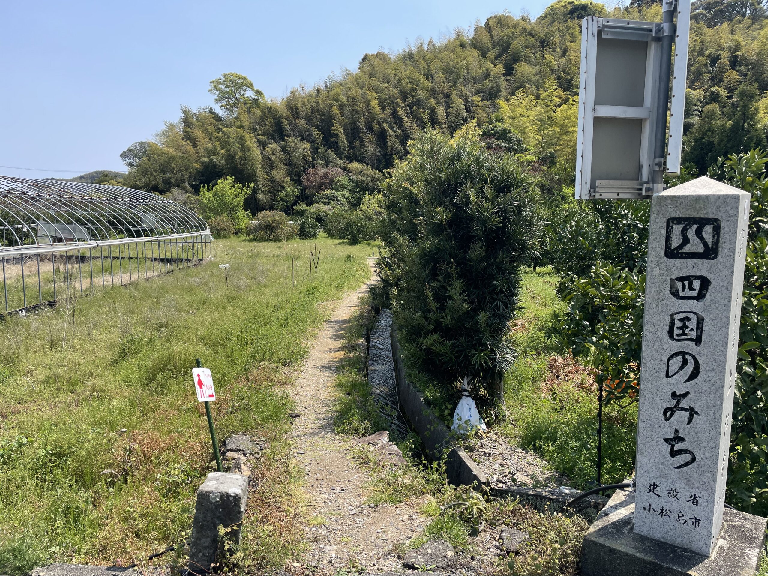 白鷺橋を渡ったら、先ほどの分岐を鶴林寺方面へ進む。立江寺を出てから15分ほどで「櫛渕真念道」への入口が現れた。赤い塗料が眩しいくらいの新しいへんろ札がたくさん立てられていて、とても分かりやすい。でかでかと書かれた「マムシに注意!!」の看板に慄きつつ足を踏み入れたが、地元の方の生活道でもあるらしく、民家と竹林、そしてみかん畑の間を縫いながら続く、とてものどかな雰囲気の道だった。