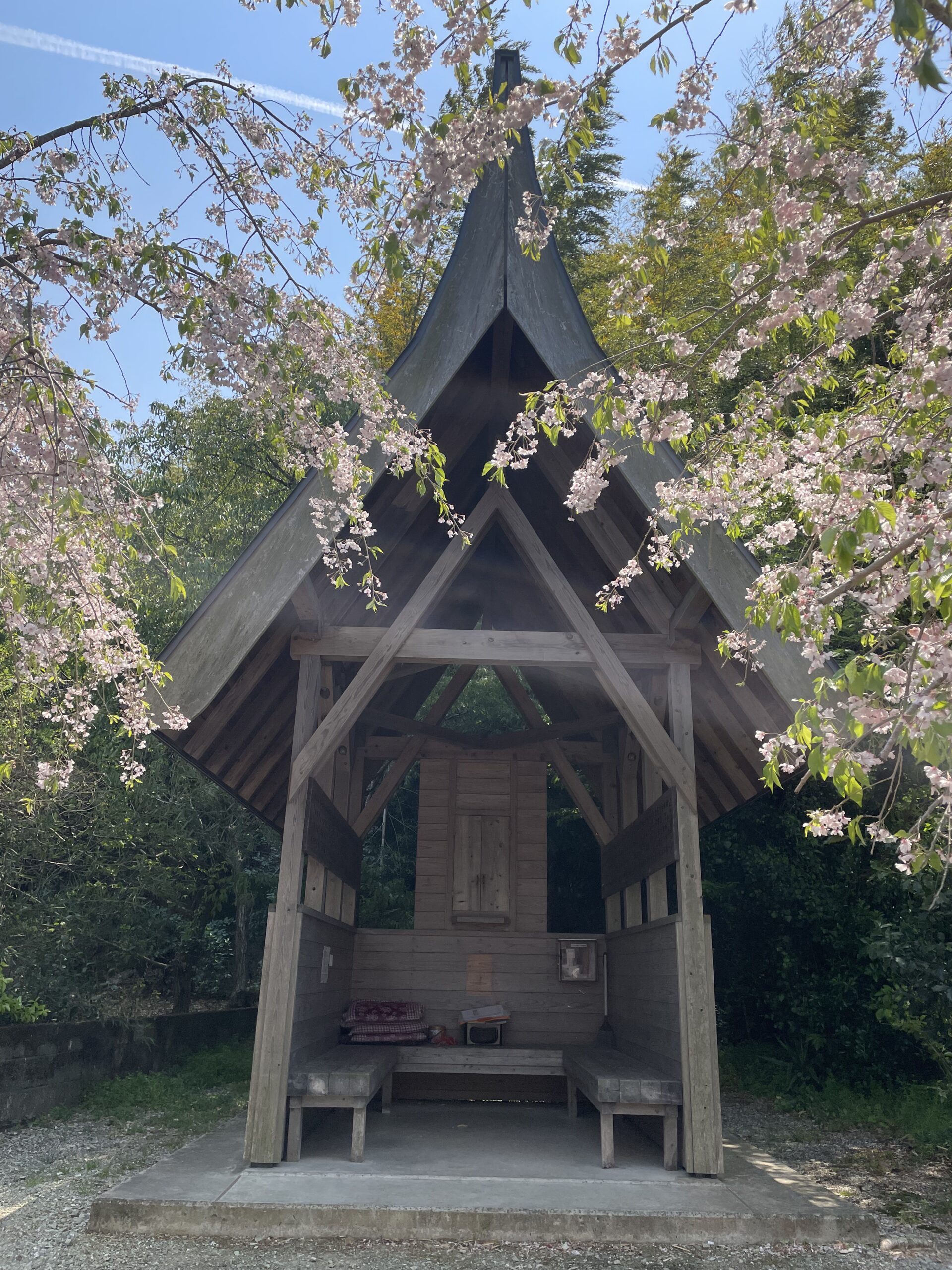 そのすぐ先に「お京塚」と刻まれた大きな石碑が出てきて、広い敷地の奥には桜に囲まれた立派なへんろ小屋があった。ここには次の立江寺に由来(因縁?)のある「お京」という女性を祀ったお堂(お京塚)があったが、老朽化の改装に伴い平成25年(2013年)にへんろ小屋として整備されたとのことだ。