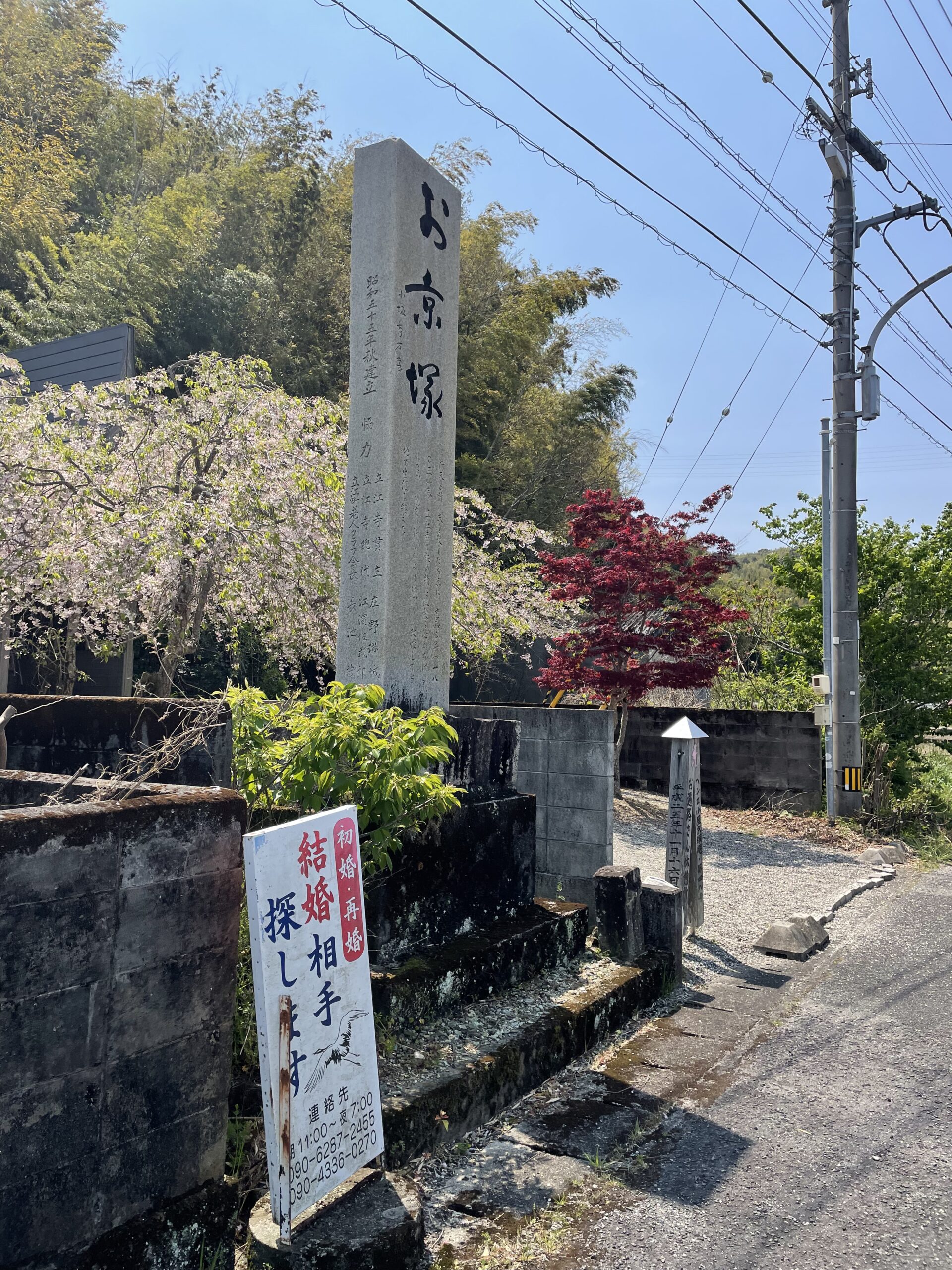 お京さんは江戸時代(1800年頃)の人で、不倫相手と共謀して自分の夫を殺害したのち、心中しきれず四国遍路を始めた。しかし立江寺でお参りしようとした際に仏罰が下ったため、ふたりは悔い改めて終生をここで隠棲したという。そんなエピソードをもつお京さんの最後の地に「結婚相手探します!」の看板が掲げられているのが物凄くシュールに思えるのだが、これは一体…。