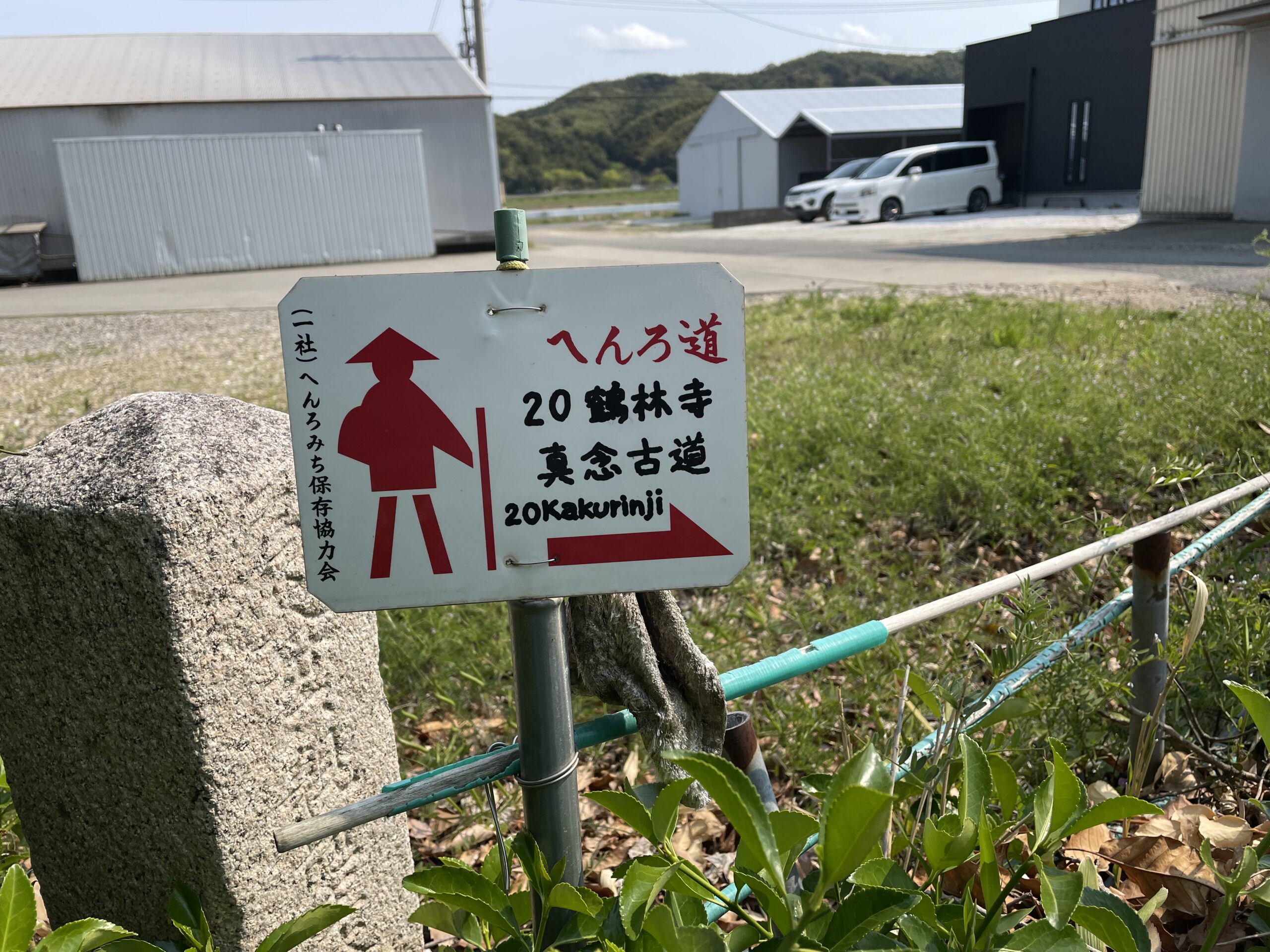 工事現場から先は1.5車線くらいの舗装路が続く。15分ほど歩くと、「櫛淵天満神社」の手前にひとつ目の真念さんの道しるべがあった。茂兵衛さん(明治〜大正)の道しるべよりも小ぶりで、石の色も白っぽい感じである。あとで知ったが、このひとつ目の道しるべは地面に固定されていなくて、手で抱えて持ち上げられるそうだ(笑)。その傍には再整備の際に立ててくれたと思われるへんろ札もあった。新旧さまざまな道しるべに助けられて、遍路たちは歩いていく。