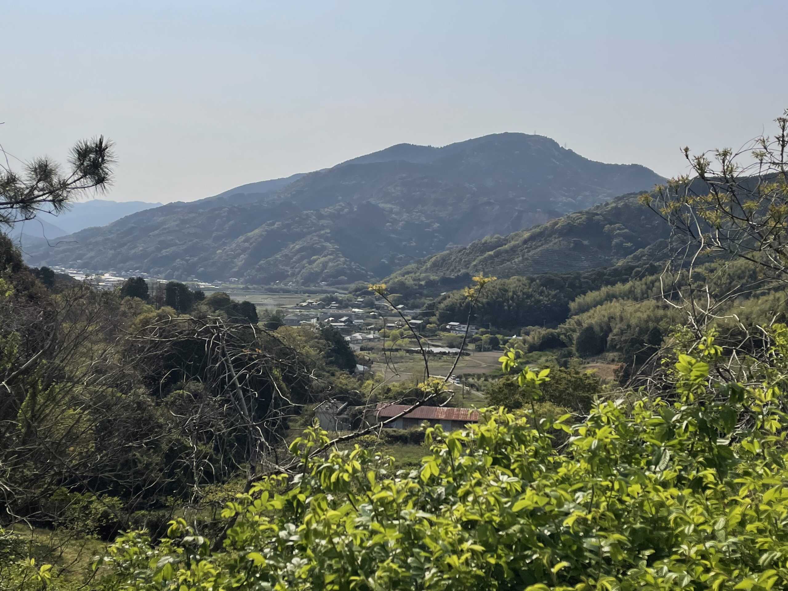 ふたつめのお地蔵さまを過ぎてすぐにため池があり、その先から再び竹林が始まった。恩山寺以降はほとんど竹の中だった今日の峠道、ラストスパートとなったこの竹山は始めのうちは緩やかな上りが続いていたが、コンクリート舗装から土道に変わった途端に傾斜が急になった。最後は頂上までまっすぐな1本道で、一面に降り積もった竹の葉っぱがスルスル滑って地味に脚の疲労に拍車をかけてくる。長い坂を登りきると突然竹林が終わり、視界が開けて、これから向かう勝浦町の家並みを眼下に望むことができた。