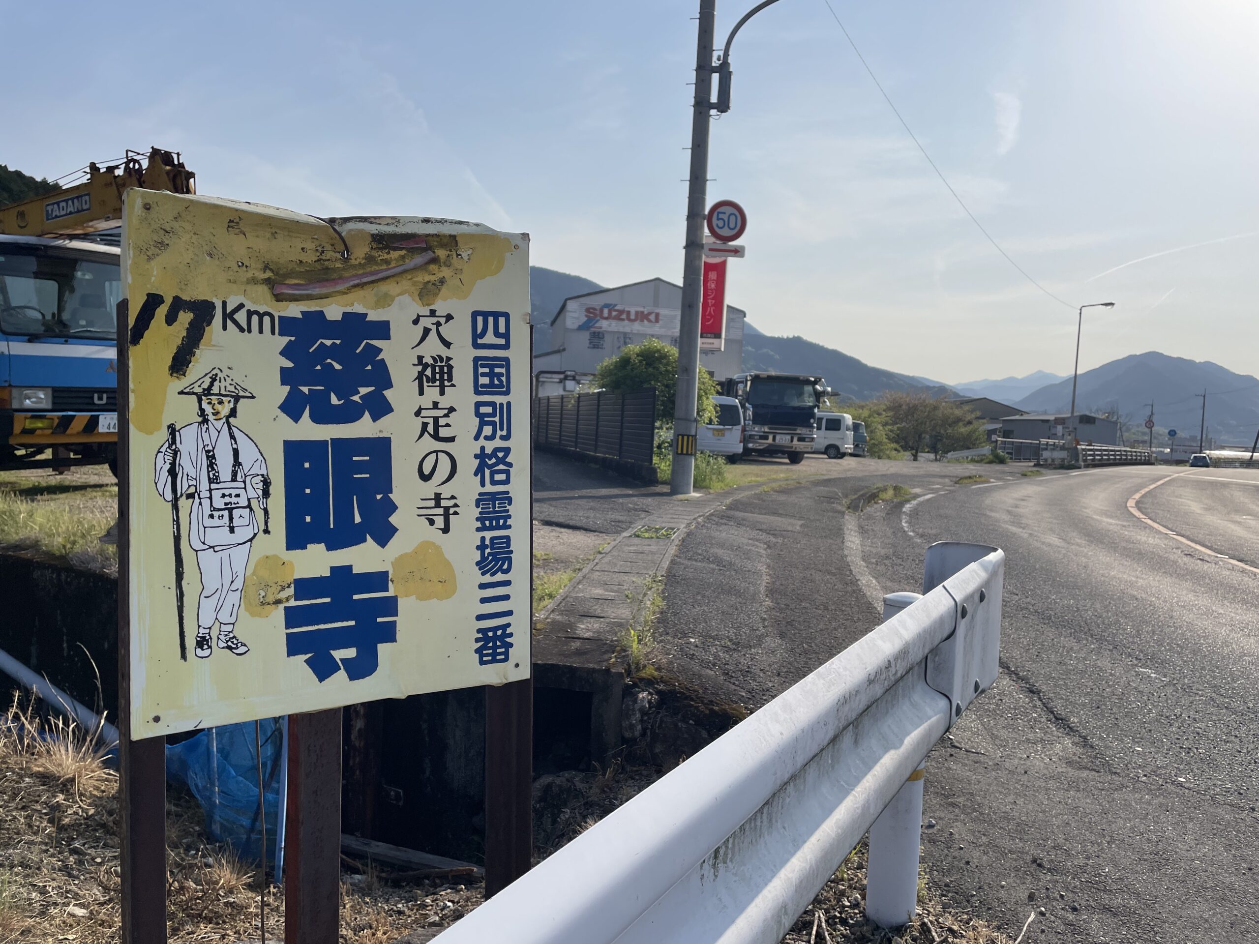 畑沿いの道もついに県道に合流してしまい、ラストの2kmちょっとは観念して交通量の多い車道の脇を歩く。無になりながら歩くこと30分、やっと道の駅の看板が見えてきた。その支柱の足元には、明日行く予定の別格3番霊場・慈眼寺の看板がひっそりと掲げられている。おお、珍しく別格の案内がある、と思って近寄ってみると、お遍路さんの絵がやたらリアルだった。「km」が印字で距離の数字が手書きなのが面白いが、どうしてこうなったのだろう。