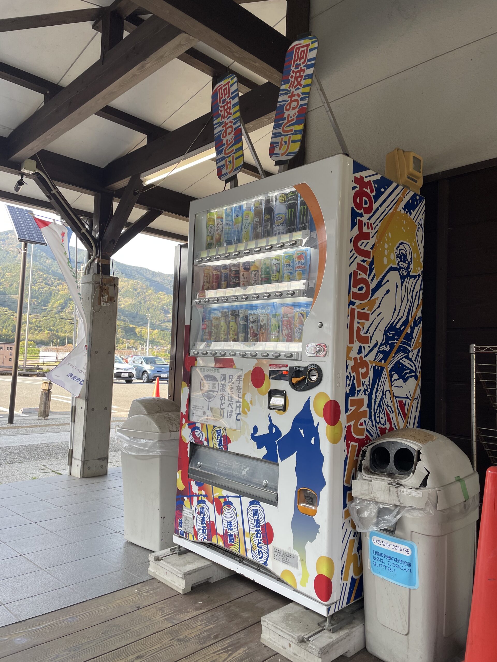 案内看板から10分ほどで、ようやく道の駅「ひなの里かつうら」に到着した。16:35、真念道を出てからジャスト1時間。まずは自販機に駆け寄って水分補給だ。午後ティーを一気飲み、糖分が干からびた体に沁みわたる。お宿に到着の旨を連絡をすると、お迎えはもうひとりのお遍路さんと合同でだいたい17時頃になるとのこと。お迎えを待つ間に道の駅を探索して、明日の分のお茶とおやつも確保した。