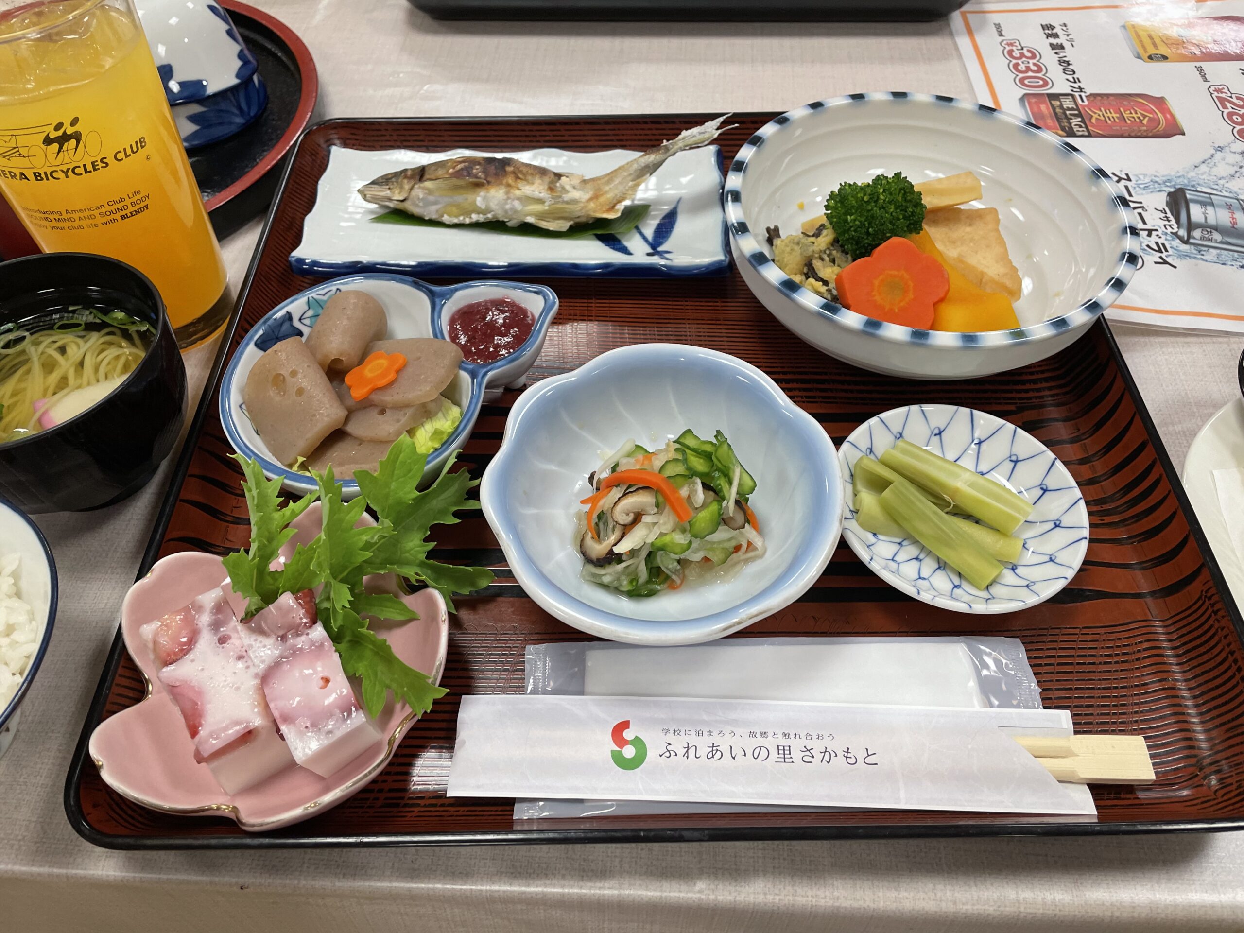 17:20、お宿に到着。「ふれあいの里さかもと」さんは、平成11年に閉校した坂本小学校をリノベーションした農村体験型宿泊施設である。もともと学校なのでホールや階段の造りはゆとりがあり、廊下の突きあたりに理科室っぽいものがあったりして間取りに懐かしさを感じる。案内してもらった部屋はもともとは職員室だったとのことだ。各部屋には地元で採れる柑橘類の名前を冠しているといい、プレートには「ゆこう」と書かれていた。