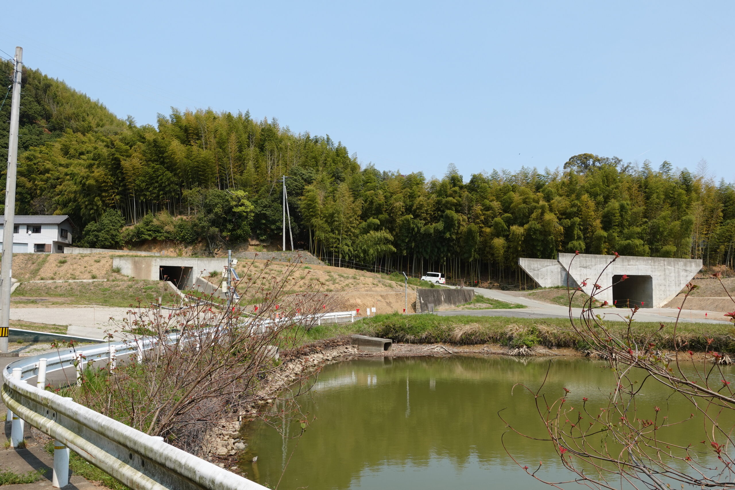 なだらかな小山をひとつ越えて下りてくると、道路の建設現場に行き当たった。今日はやたら道路工事が多いなあ、と思っていたのだが、道中の説明板によると徳島県南部〜高知県にかけて(まさにこれから歩いていく区間)は「高規格道路のミッシングリンク」と呼ばれているらしく、災害時に緊急車両の交通が確保できない恐れがあるため、複線化・多重化を行っている最中のようだ。だから工事名が「国土強靭化対策工事」だったのか。