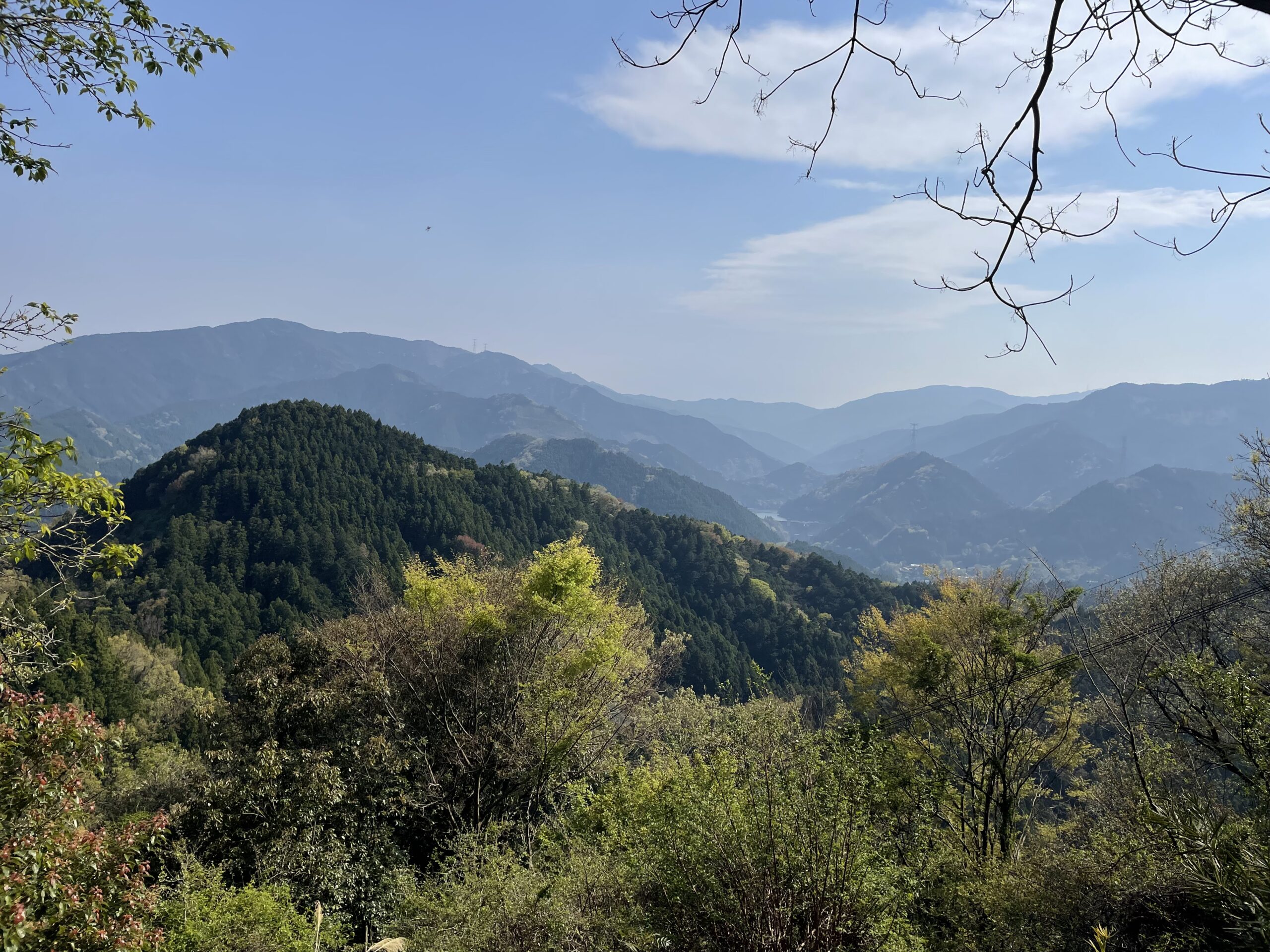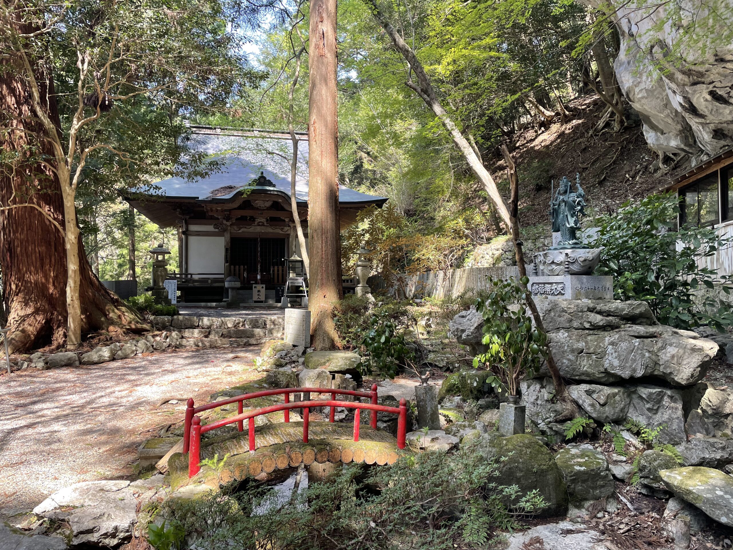 お参りと修行を無事終えてすっかりお腹が空いたので、境内のベンチコーナーでお昼ごはんを食べることにした。お宿で作ってもらったおにぎりセットをほおばる。お先達さんがくれたおやつももりもり。昼下がり、お参りにちょうどよい時間帯というのもあってか、何組か参拝客があった。もちろん車でのお参りで、ここまで歩いてくるという酔狂はあまりいないようだ。何気なく視線を上げると、大師堂の向こうにさっき修行をした行場が見えた。