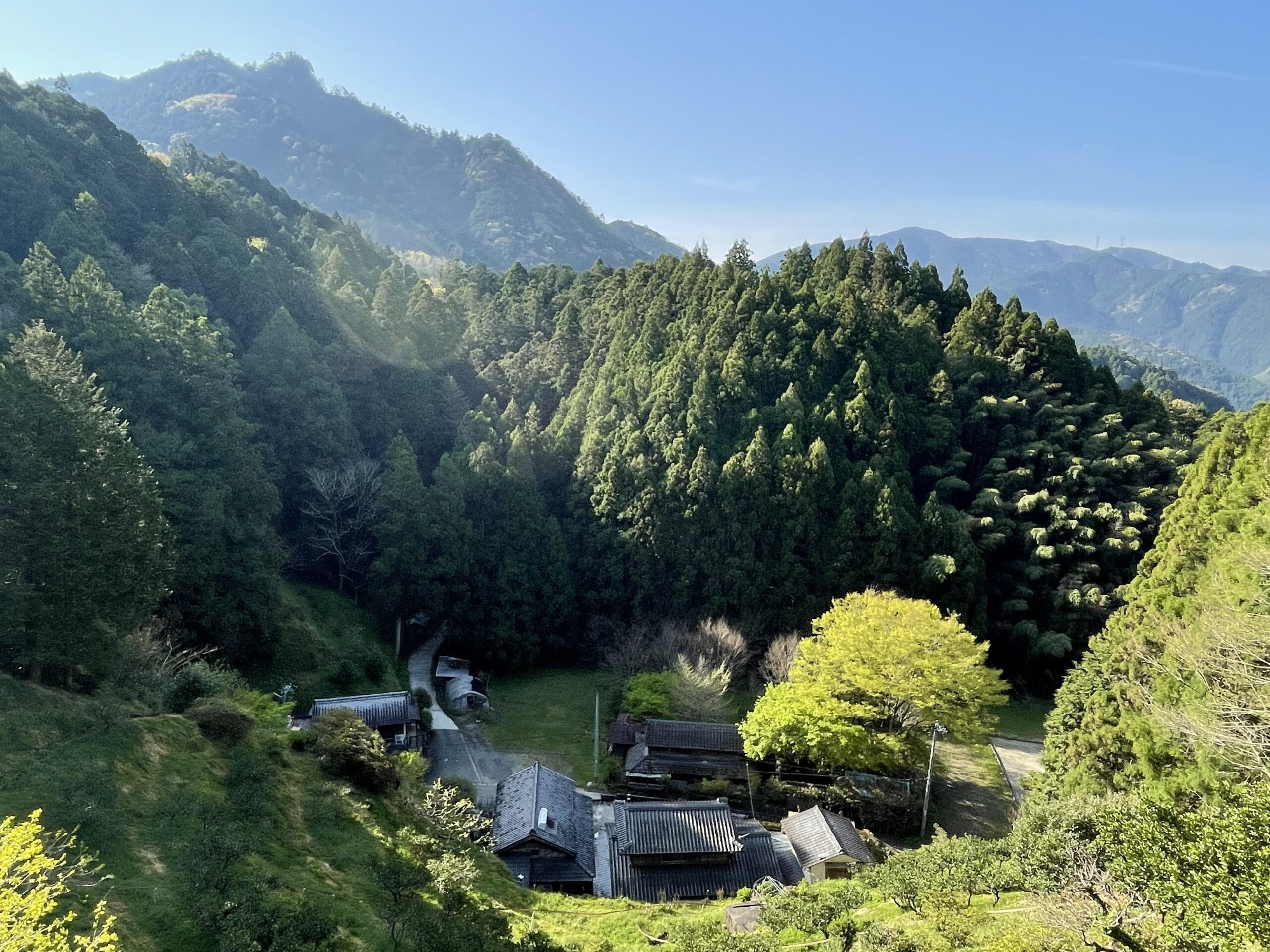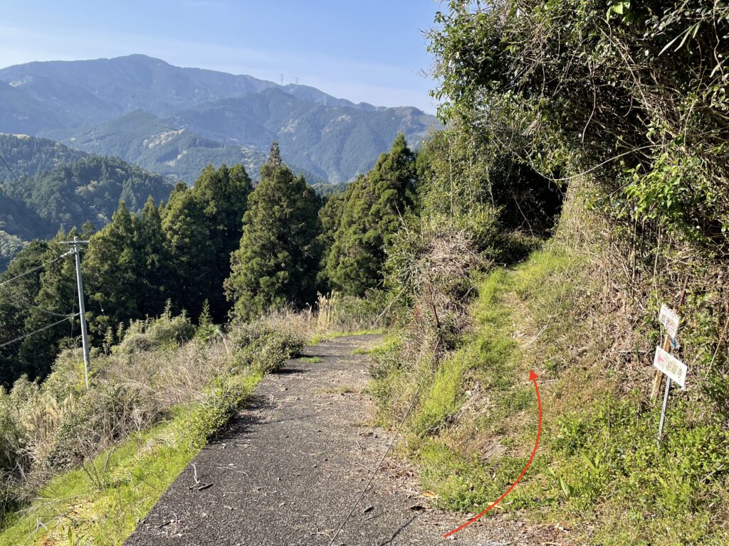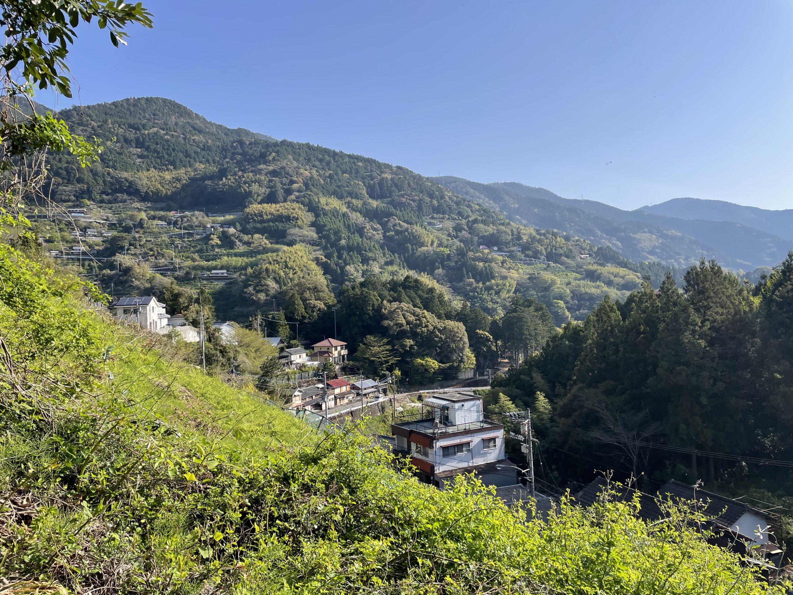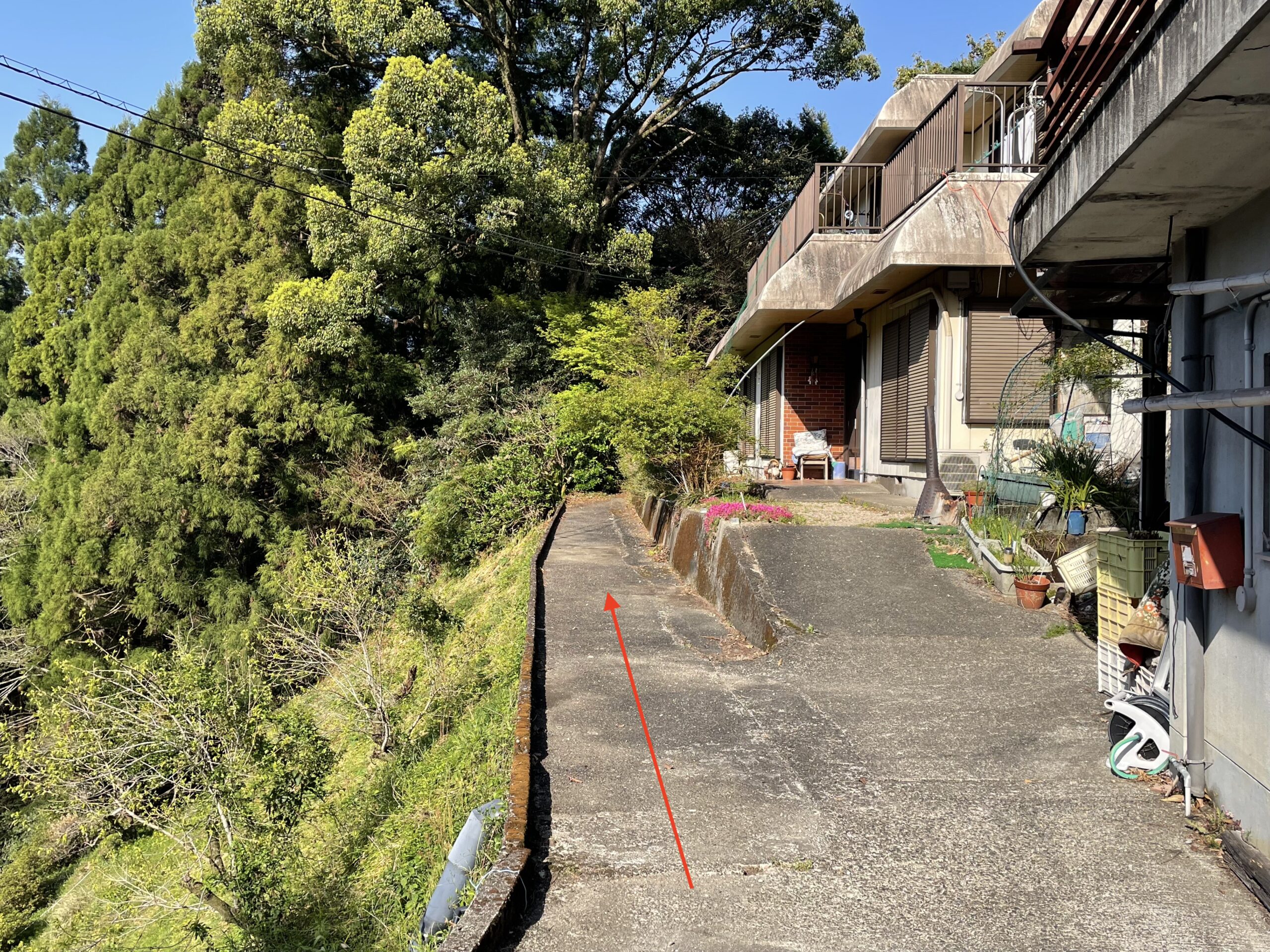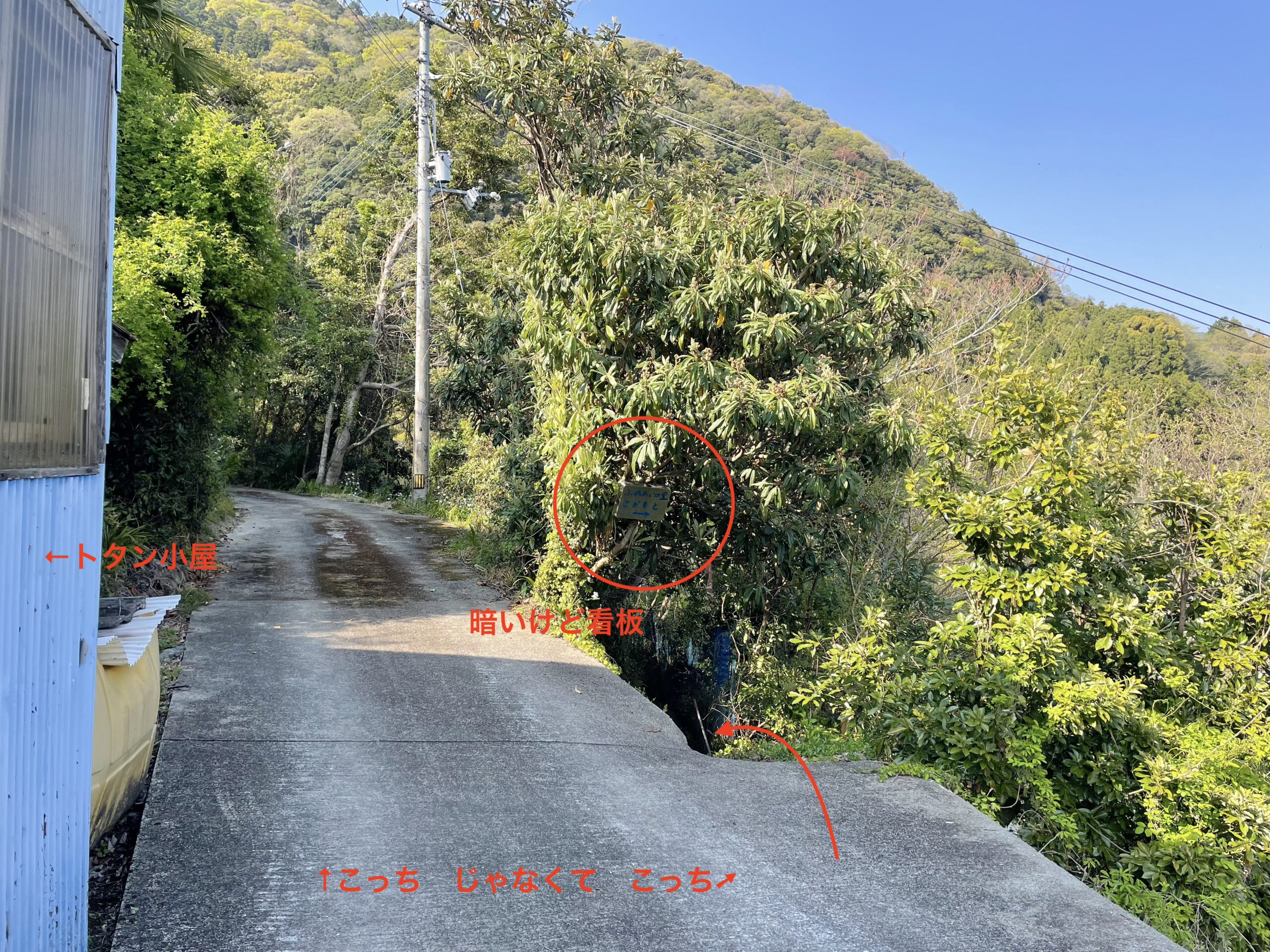 くねくねした細いコンクリート道を進んでいくと、民家が何軒かあった。目の前の斜面はほぼ垂直に落ちていて、下の家の屋根が遠く小さく見える。四国に来てもう何回も思ったことだが、すごいところに住んでる…。ご近所さんを訪ねるだけでも大変そうだ。あと、自宅から車で出かける時に必ずこの細いカーブ道をバックしないといけないと考えるとどきどきする。