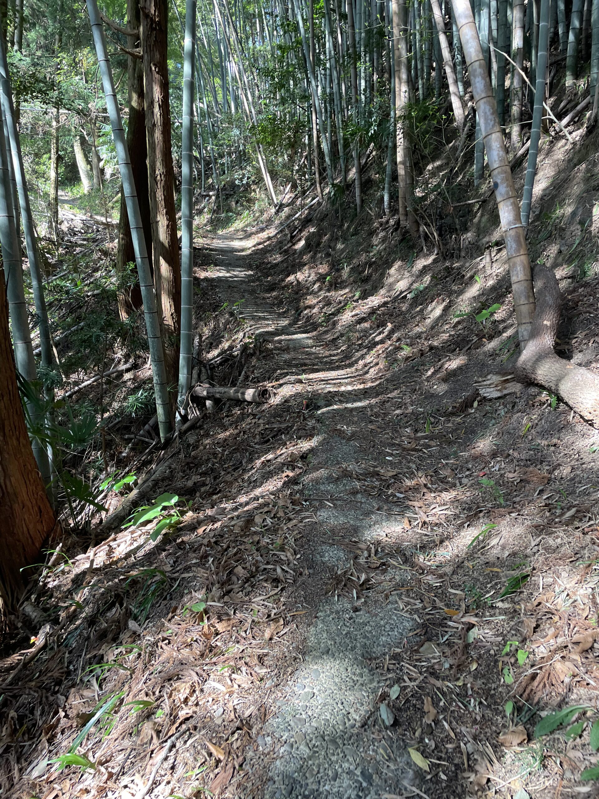 広域農道を5分ほど進むと脇道への分岐が出てきて、また山道になった。人里を離れてきて竹は姿を消し、杉林が続く。山頂へのラストスパートといった感じで、ふっかふかの杉の落ち葉を踏みながら基本的にはひたすら登りだった。