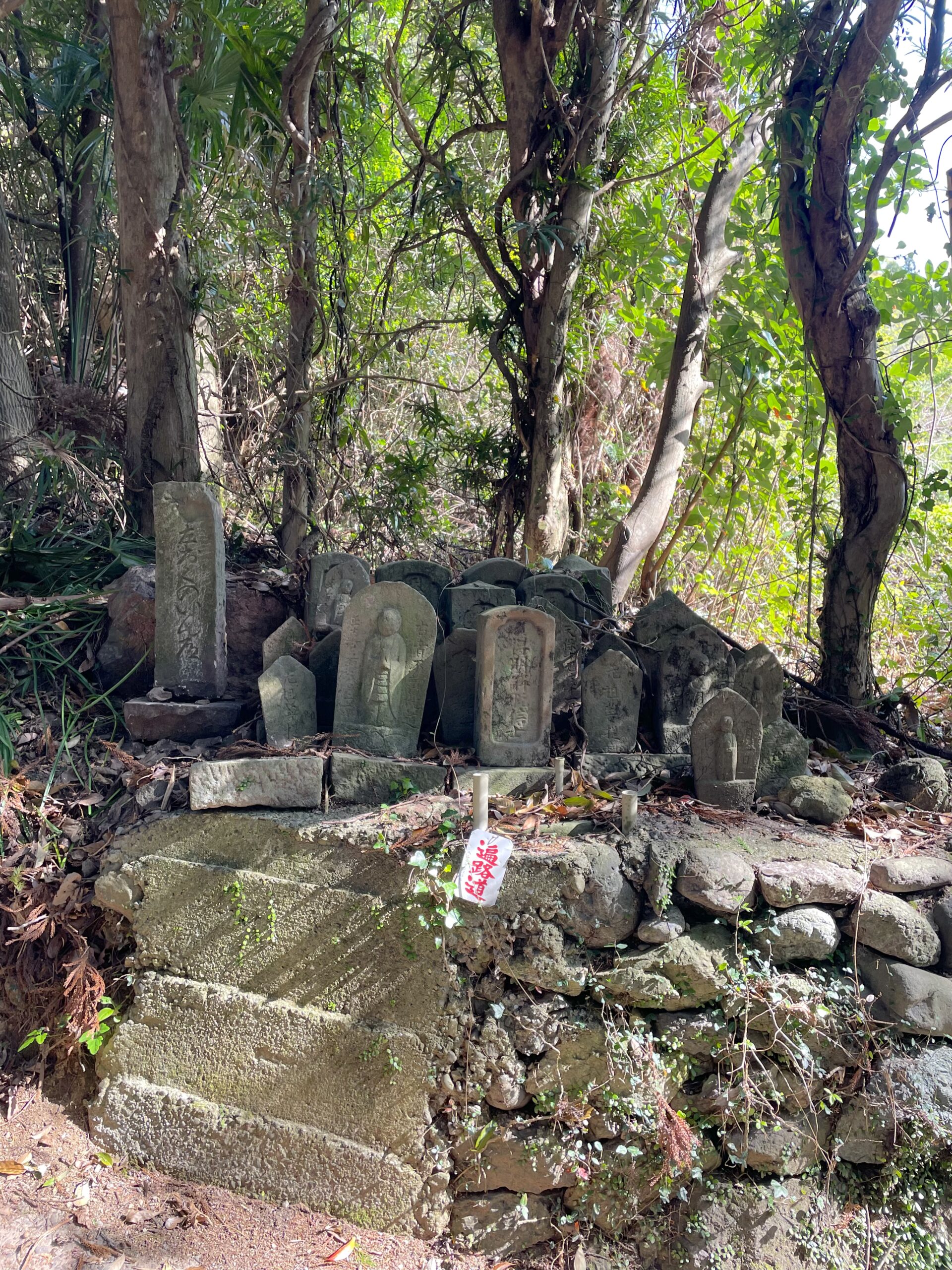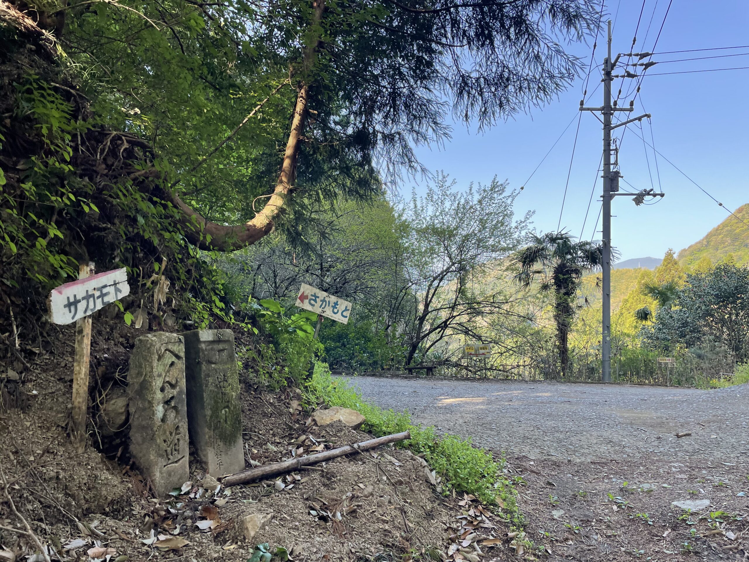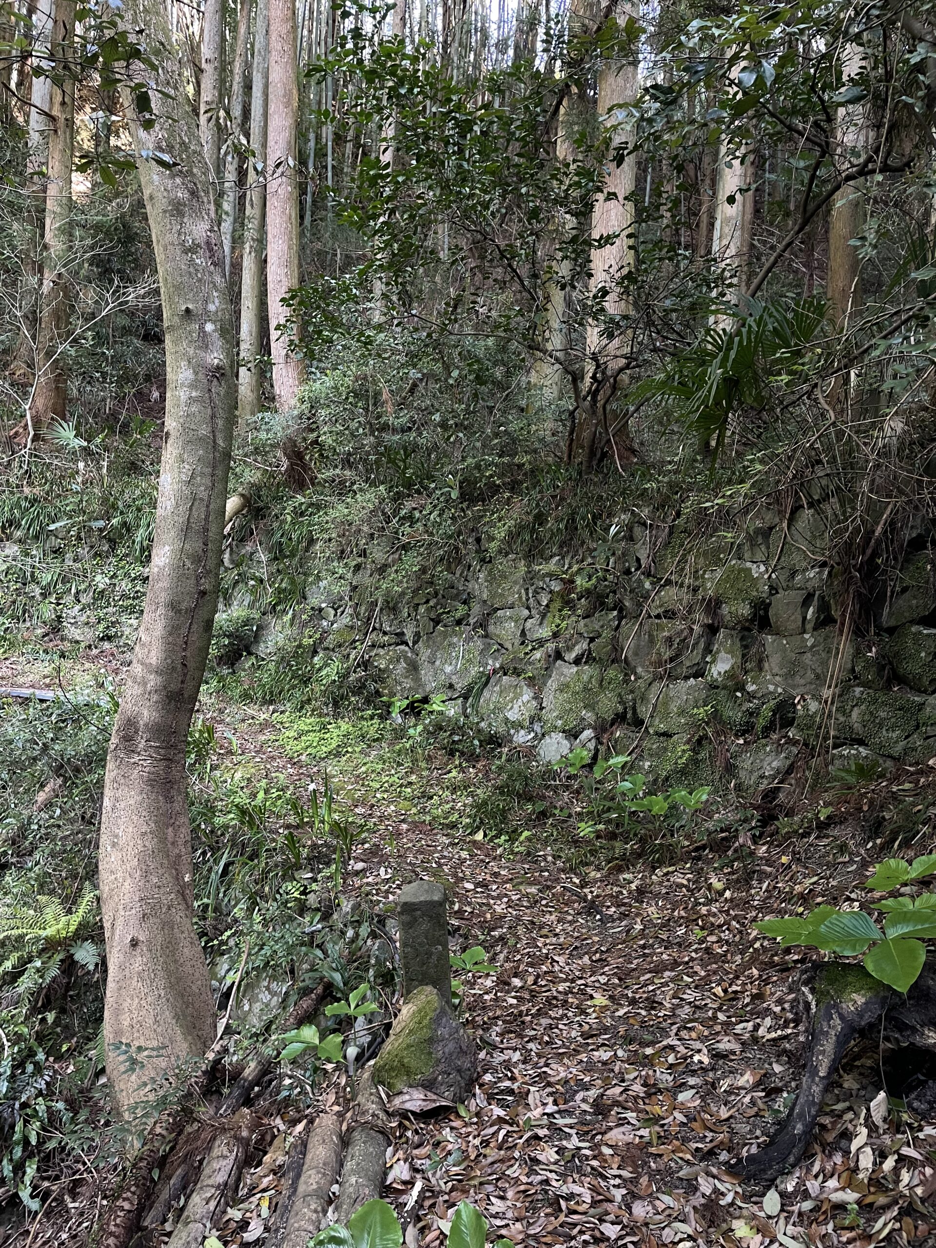 家の前を通らせてもらって、その脇からまた山道になった。おへんろでなければ通常は絶対に突入しないような、「人んちの裏」だ。その奥には倒壊しかかっている家や水場の跡のようなもの、年代を感じる石垣などもあり、昔はさらに上の方まで人が住んでいたのだなあ…とまた気が遠くなる。