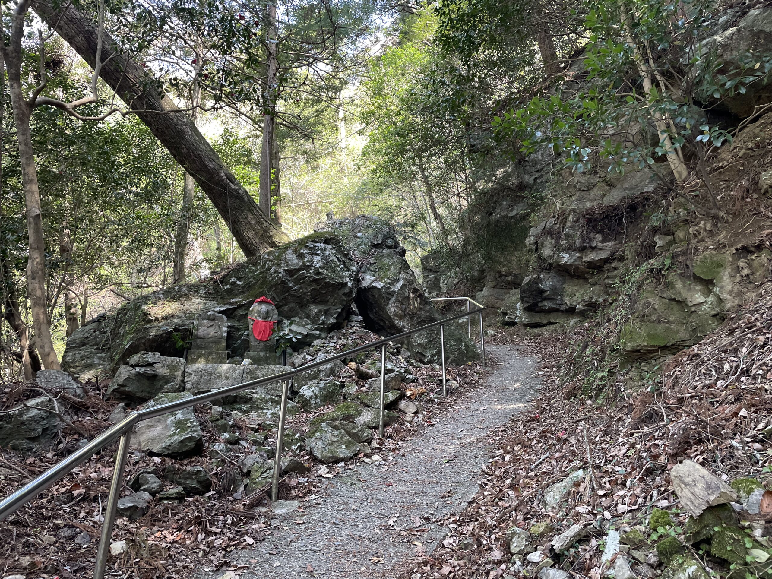 30分ほどで、行きに山道から車道へ上がってきたところまで戻ってきた。お宿へ帰る「確認ポイント②」だ。灌頂ヶ滝に行くため、いったんそこを通り過ぎてさらに車道を下っていく。途中に「拝所」と書かれた看板とお地蔵さまがあり、ここから対岸に灌頂ヶ滝が望めると書かれていたので振り返ってみたが、木が生い茂っていて滝の姿は見えなかった。「確認ポイント」から滝までは20分ほど下ることになり、帰りはこれを上るのか…とちょっとだけゲンナリする。(余談だが、前述の「慈眼寺・旧参道」はこのお地蔵さまの背後から登っていくらしい。)