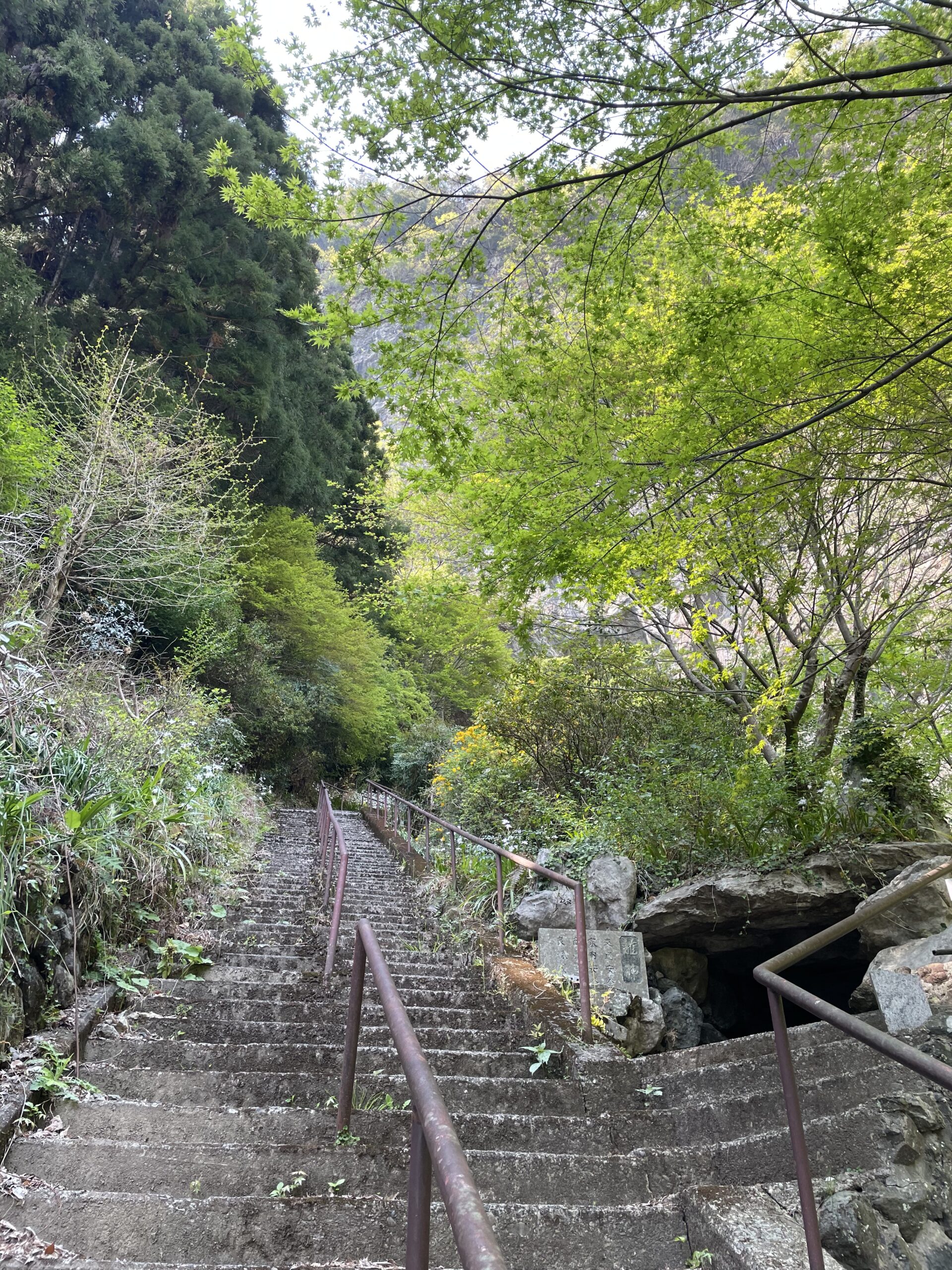 道沿いに建つ大きな「潅頂之瀧」の石碑、その横からは切り立った岩壁に向かってまっすぐな階段が伸びていた。上の方は吸い込まれるように森の中に消えていてどうなっているのか見えない。そういえば、さっきお地蔵さまのところから滝の方を見た時、木々の梢の上に断崖の先っちょが少しだけ顔を覗かせていた。あれが滝のてっぺんだったのか…。