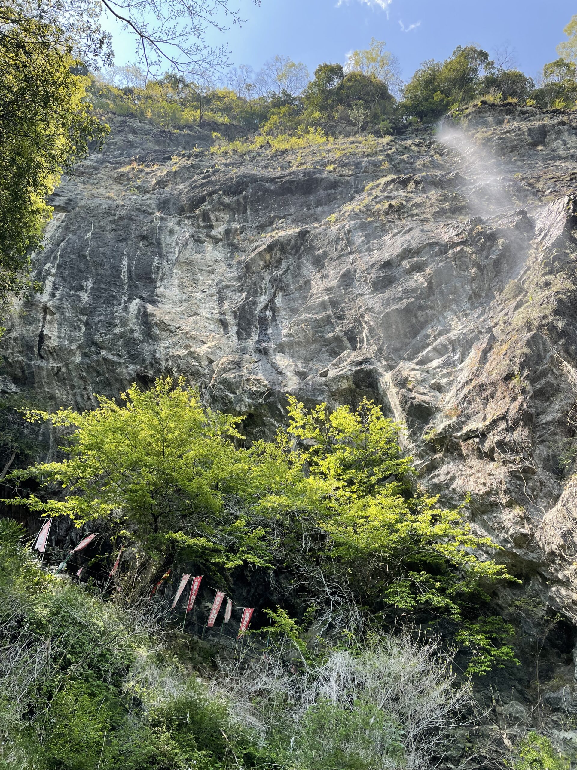 ここまで来たら行くしかない、と階段に足をかける。滝への参道ということで、道中には龍神さまの祠や蛇を祀った祠、不動明王が次々と現れる。途中で滝壺の方へ下りていく階段があり、そこから滝を見上げると岩肌全体を覆うように水が伝い流れている様子が見えてきた。地元の人が口を揃えて「今は水が少ないからねえ」と言う通り、細い糸のような水が途中で霧になって表面をふわっと漂うような感じだったが、それがヴェールのように見えてきれいだった。