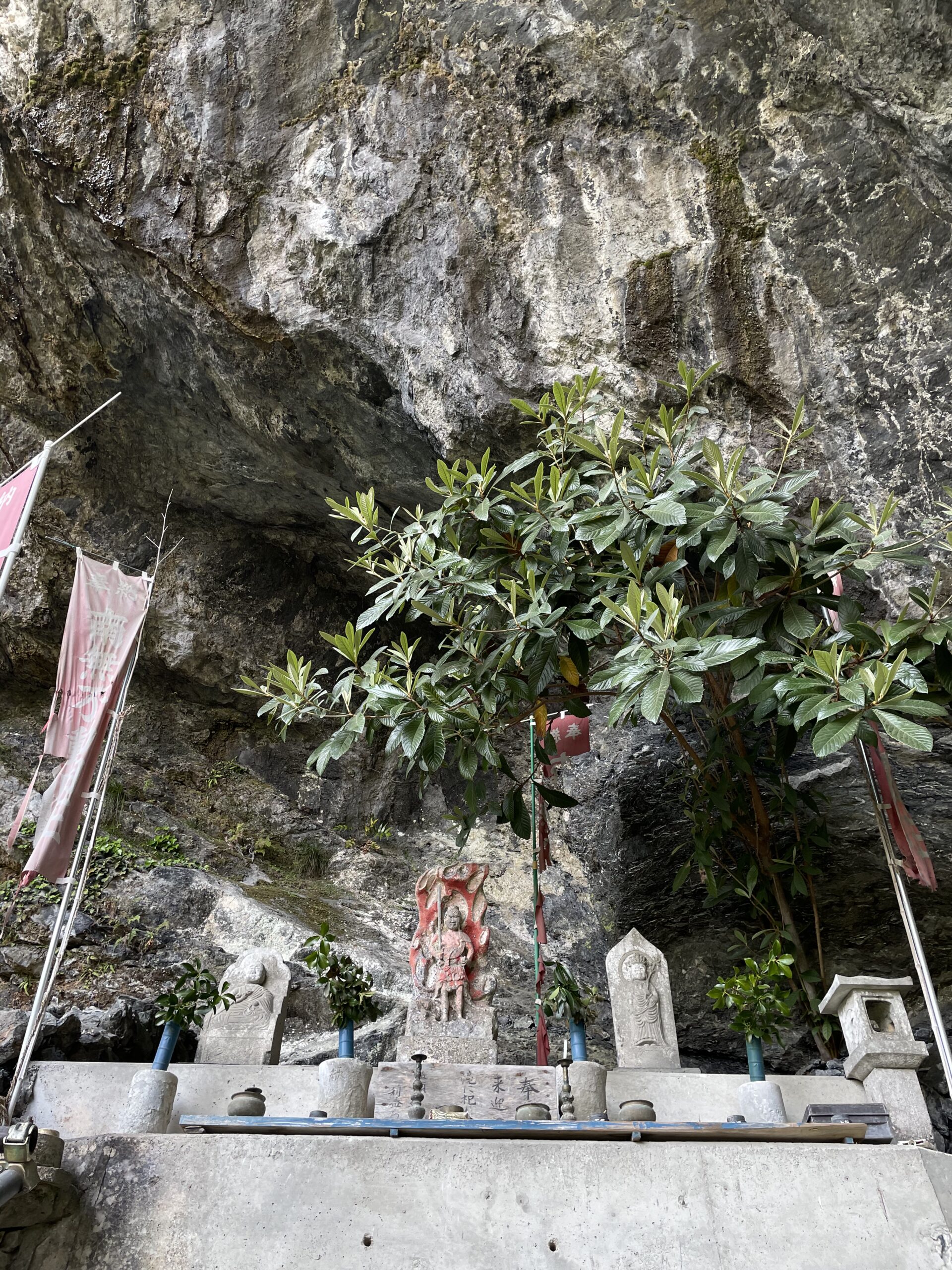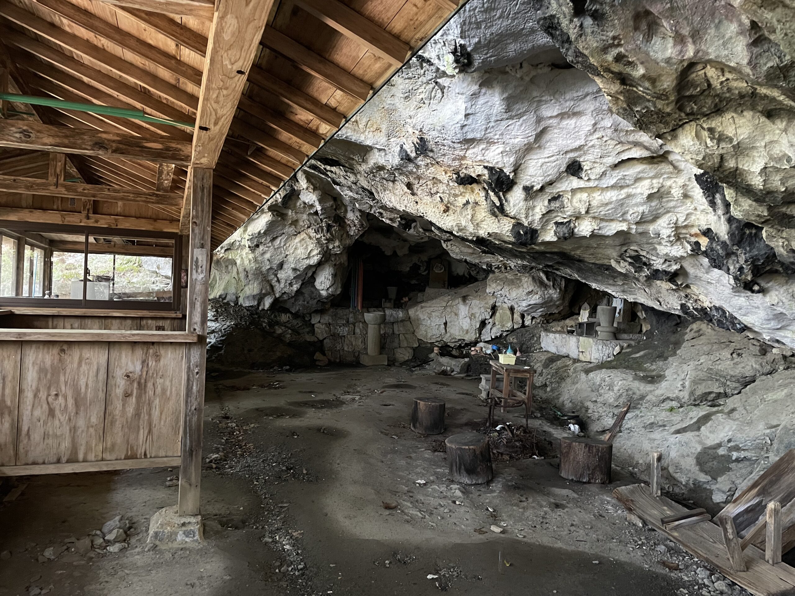そこからまたしばらく人間知恵の輪みたいになりながら進んで、ようやく最奥の空間にたどりついた。無我夢中で、もはやどうやって来たのやら。この洞窟は弘法大師の霊験によって発見されたとされているが、よくこの通り道と洞が分かったものだ。「わずか100mほどの長さ」と書かれていたが、十分である。洞窟の奥は人が10人くらい?は立てそうな広さがあり、天井も高く天然の祭壇のようになっていて、少し見上げるような高さのところに弘法大師の坐像が彫り込まれていた。大師の前には円形の燭台があり(シャンパンタワーみたいなやつ)、そこに献灯用に持ってきた蝋燭を捧げてお先達さんと一緒に般若心経を奉納する(いつも「勤行次第」を見ながら唱えるのでちょっと飛んでしまった)。