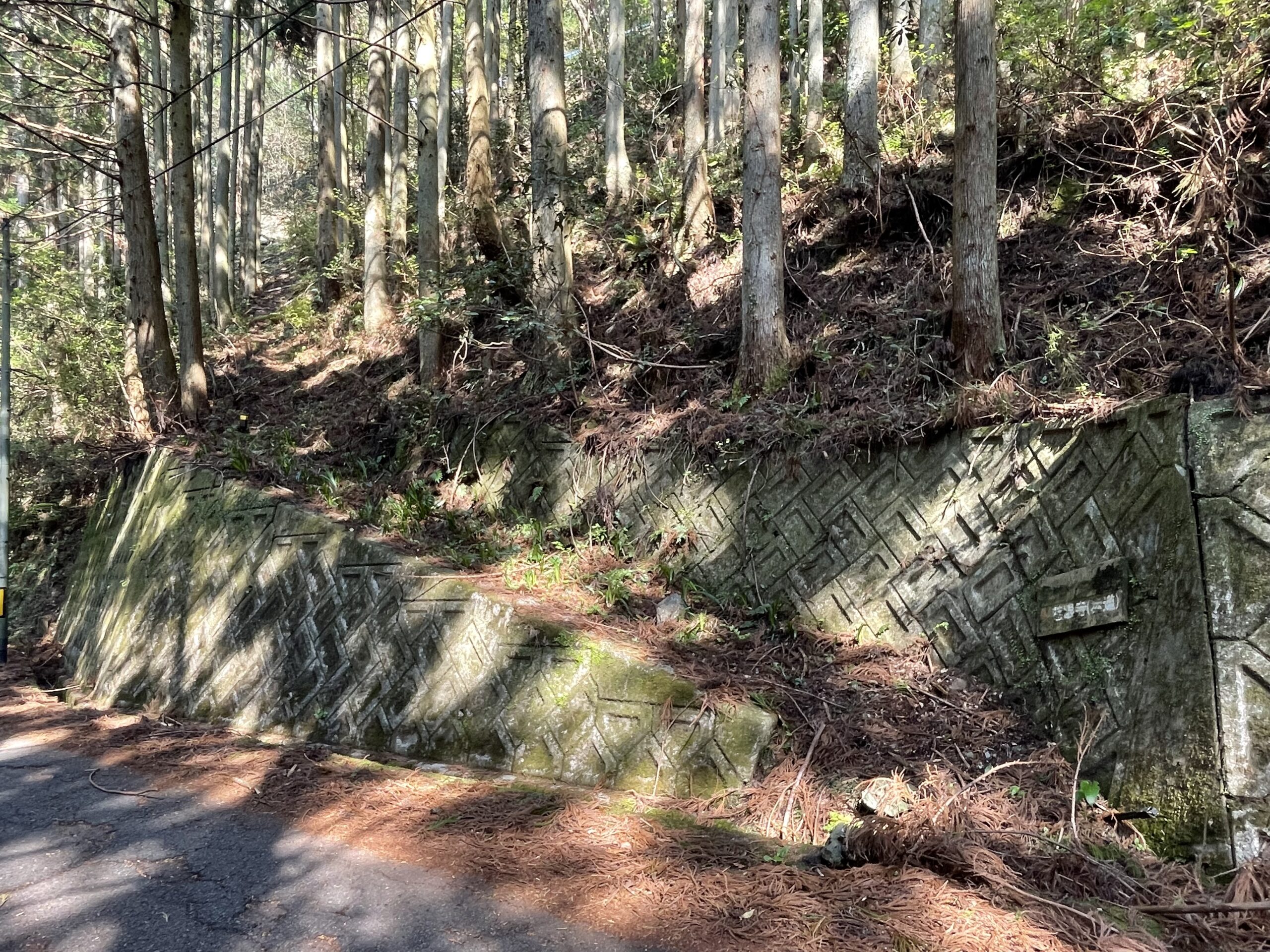14:45、灌頂ヶ滝を出発した。ここから車道を下り続けて「雄淵・雌淵」と呼ばれる滝を経由する道もあるらしいが、ずっと舗装路なうえ距離も少し長そうなので、「確認ポイント②」まで戻って行きと同じ山道を戻ることにした。さっき下ってきた坂道を分岐まで上り返す。途中で遊歩道のような看板を見つけた(行きは気づかなかった)。苔むして字がほとんど見えないが、「上勝町いやしのみち 県道(歩道)」と書かれている。看板しかり、その道?っぽいものもなかなかの雰囲気を醸しだしている。この道、生きてるのだろうか?くわばら…と思いつつ通り過ぎた。