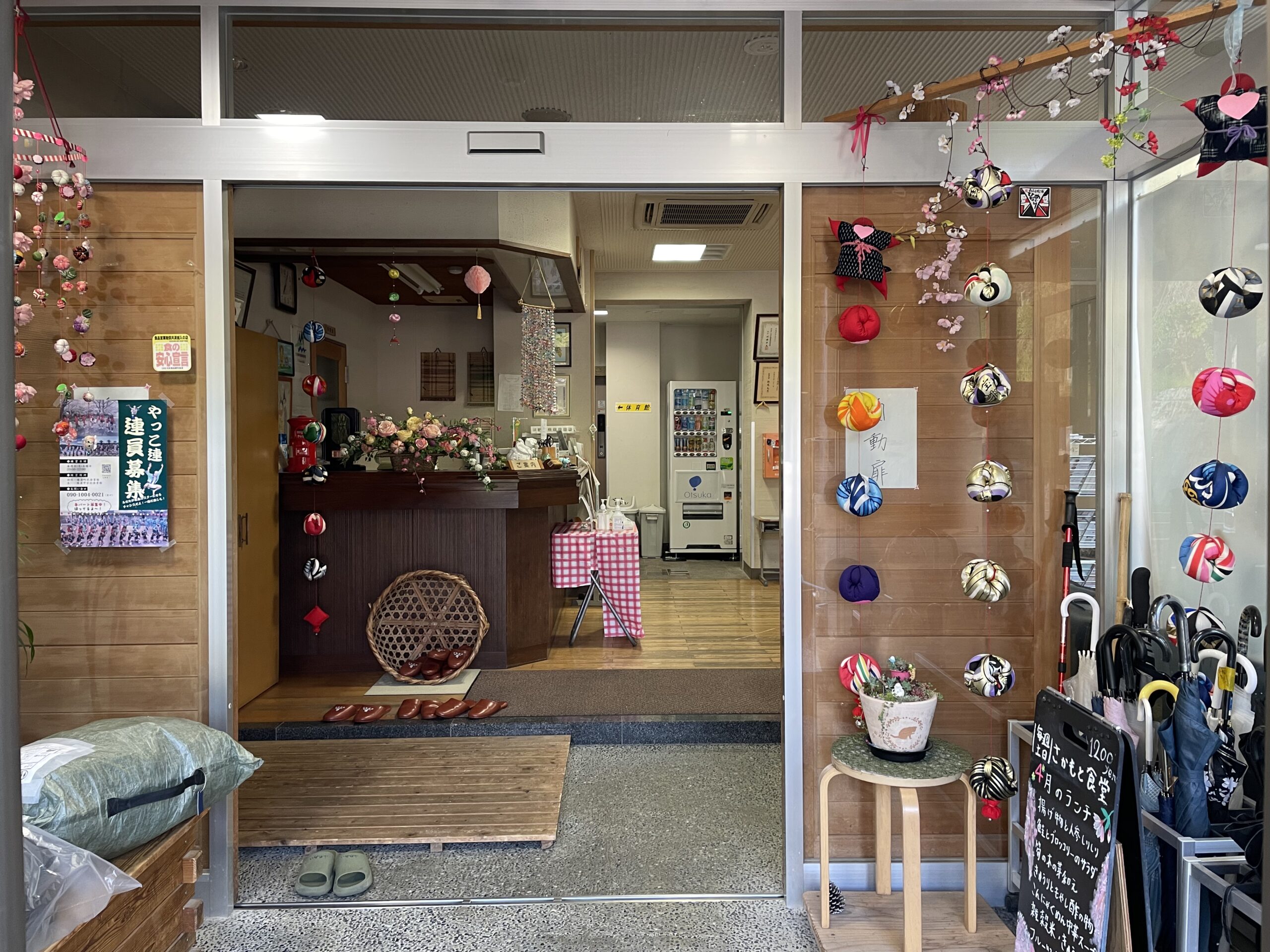 お宿に戻る前に、その隣にあった「坂本八幡神社」に寄ってみることにした。山奥の鎮守社なのでひっそりしているのかと思いきや、手水や絵馬掛け、休憩所?などが赤を基調とした飾りでかわいく装飾されていて、とても華やかな雰囲気だ。この神社は道の駅「ひなの里かつうら」の「ビッグひな祭り」に合わせた「さかもとおひな巡り」のメイン会場でもあるらしく、長い階段にずらっとお雛様が並べられた壮観な様子が名物のようで検索するとかわいい写真がいっぱい出てきた。勝浦町は地域全体でふるさとを盛り上げようという雰囲気がとてもよく伝わってくる。