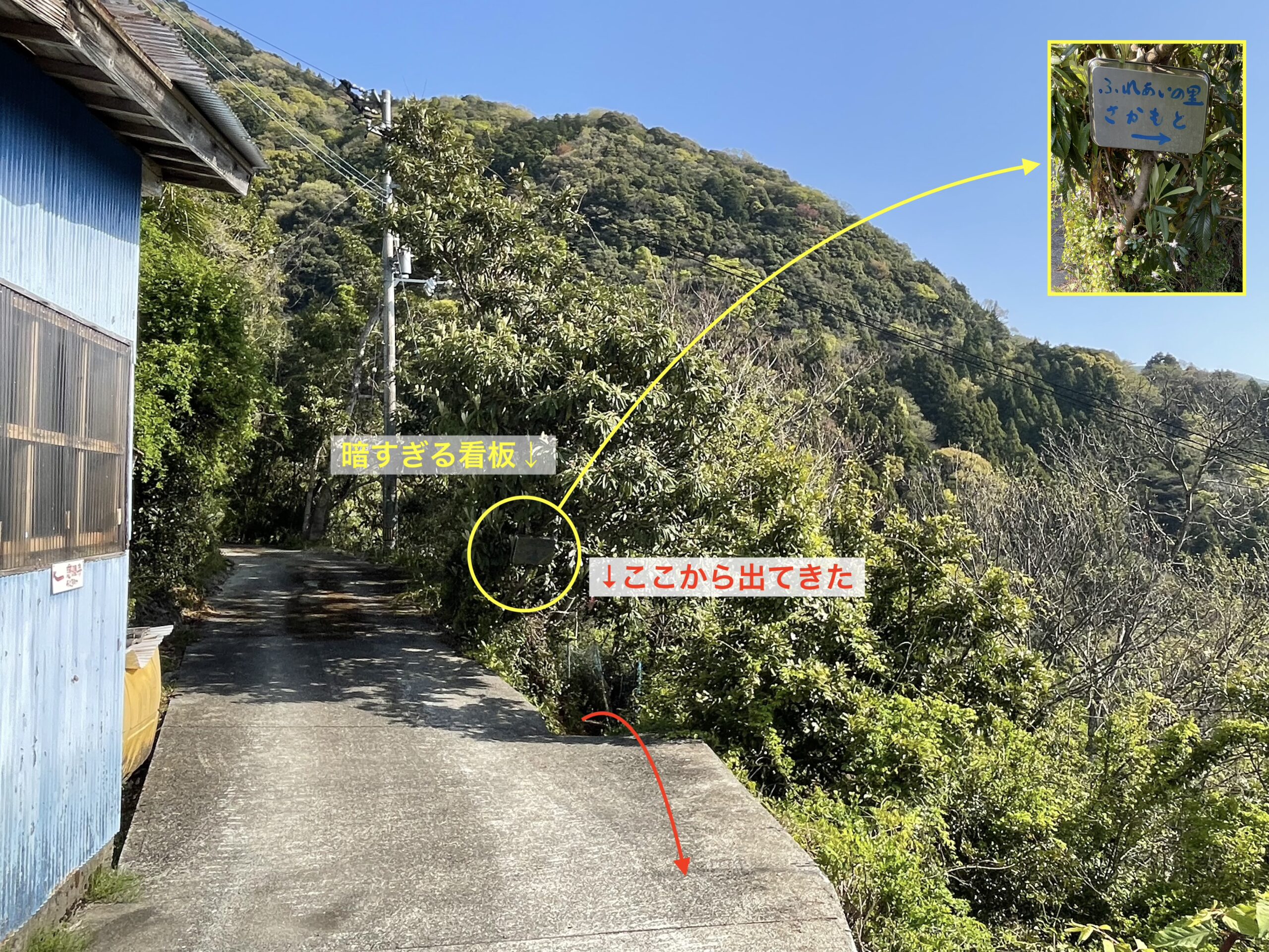 言われた通りに振り返ってみると、たった今そこから出てきたはずなのに「あれ、どこから来たんだっけ?」となるほどの、なんというか「茂み」というか「穴」がそこにあった。「ふれあいの里 さかもと→」と書かれた大きめの看板もかかっているのだが、それすらも鬱蒼とした木陰が黒い影を落としていてこちら側からはよく見えない(存在を知っていて覗きにいっているから分かるという感じ)。確かに、日の傾いた午後にここに戻ってきたら道を見失うかもしれない。教えておいてもらってよかった。