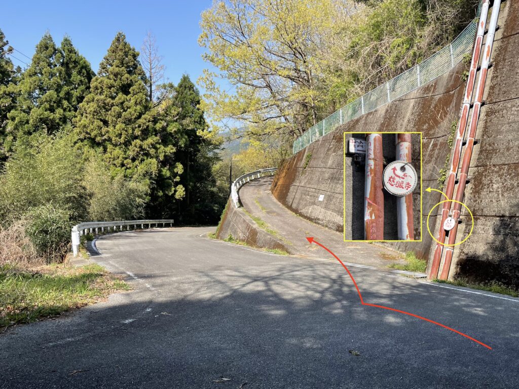 「かせ山」への道と別れてしばらくは舗装路を進む。時々現れる分岐には行きは「慈眼寺」、帰りは「さかもと」への矢印が丁寧に設置されているので、迷う心配はなさそうだ。道中には古いへんろ石や丁石もあり、ここが古来から四国巡拝の道となっていた様子が伺えた。別格二十霊場会は昭和になってから結成されたものだが、慈眼寺には昔から遍路が訪れていたということだろうか。真念さんが『四國邊路道指南みちしるべ』で八十八箇所霊場を定めた時に札所から外れてしまったのだろうか?