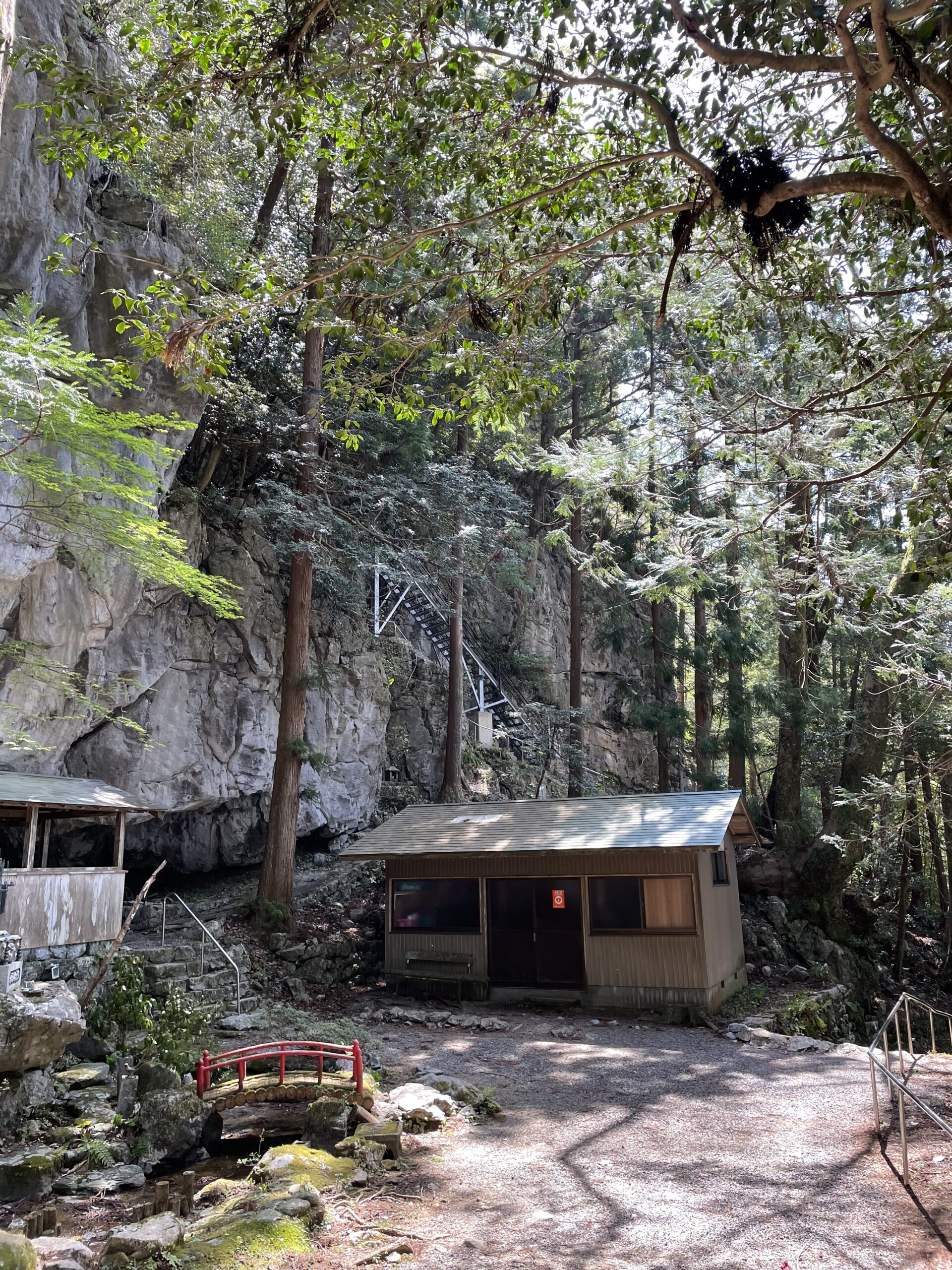 さらに登っていくと階段は右に折れ、荒々しい岩肌が覆いかぶさるように迫ってくる。岩がせり出したその下、滝を裏から見るような窪みに赤い炎をまとった不動明王が祀られていた。周囲は少し開けていて丸太なども置いてあり休憩スペースになっているが、滝のしぶきがけっこう降ってくる。今はちょっと冷たいが、夏は天然のミストシャワーで気持ちいいかもしれない。さらにもう少し上にお堂があって、それが本堂のようだった。一応手すりが付けられているが、えーとこれはロッククライミングかな?