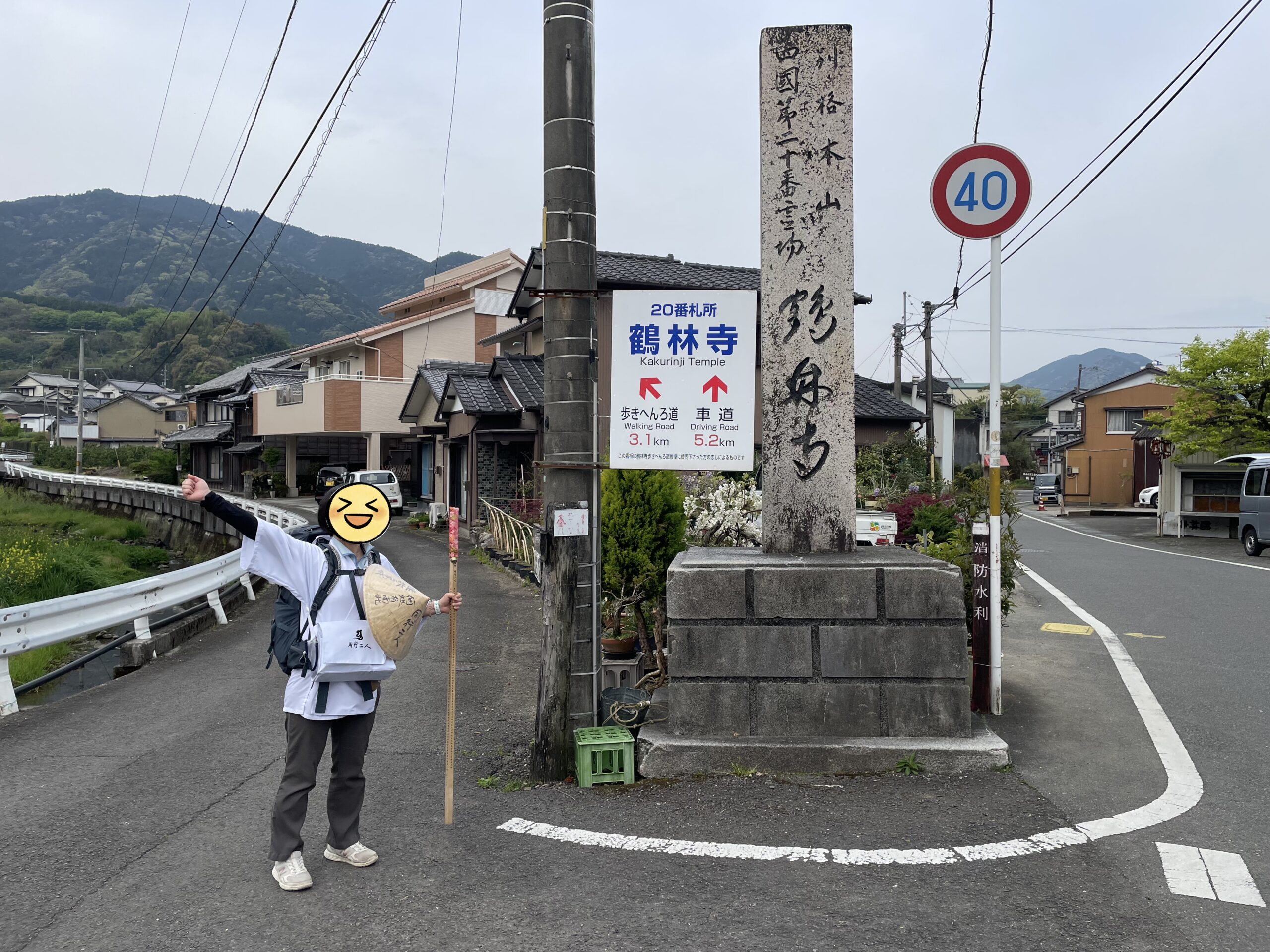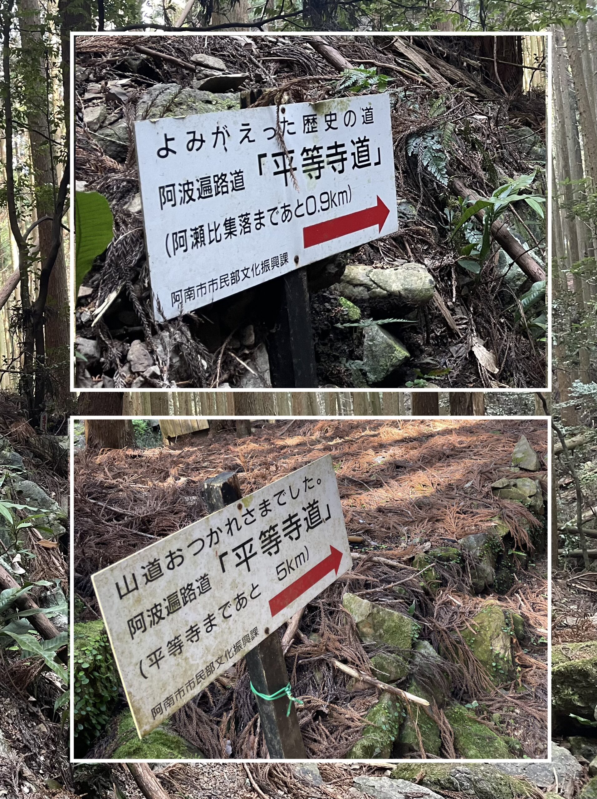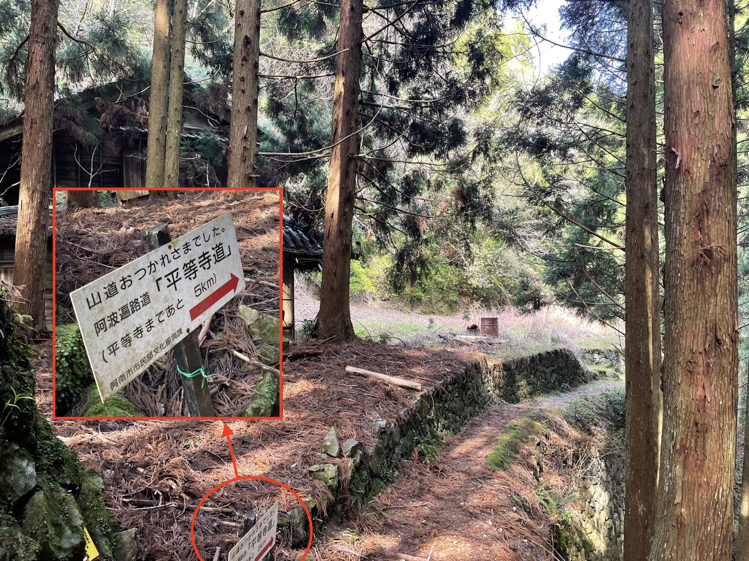 「山道おつかれさまでした 平等寺まであと5km」