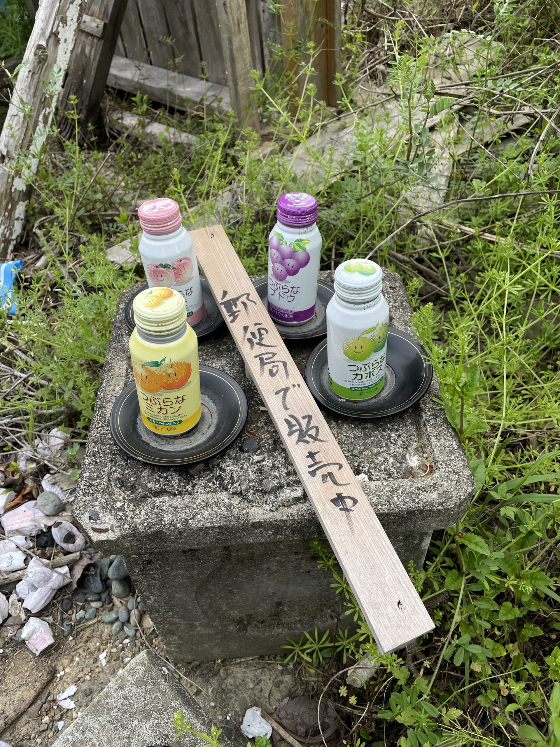 途中で飲み物の展示があった。ミカンにカボス、ぶどう、もも。郵便局で販売中と書いてくれてあるが、最寄りの郵便局はどこなのだろう。道の駅「ひなの里かつうら」を後にすると、郵便局どころかコンビニもないエリアが何十kmも続くのである。(このあとの道のりでメンタルを削られまくって疲れ果て、このジュースのことはすっかり忘れていたのだが、約2ヶ月後に金比羅山の郵便局でお接待していただき思い出すことになる。)