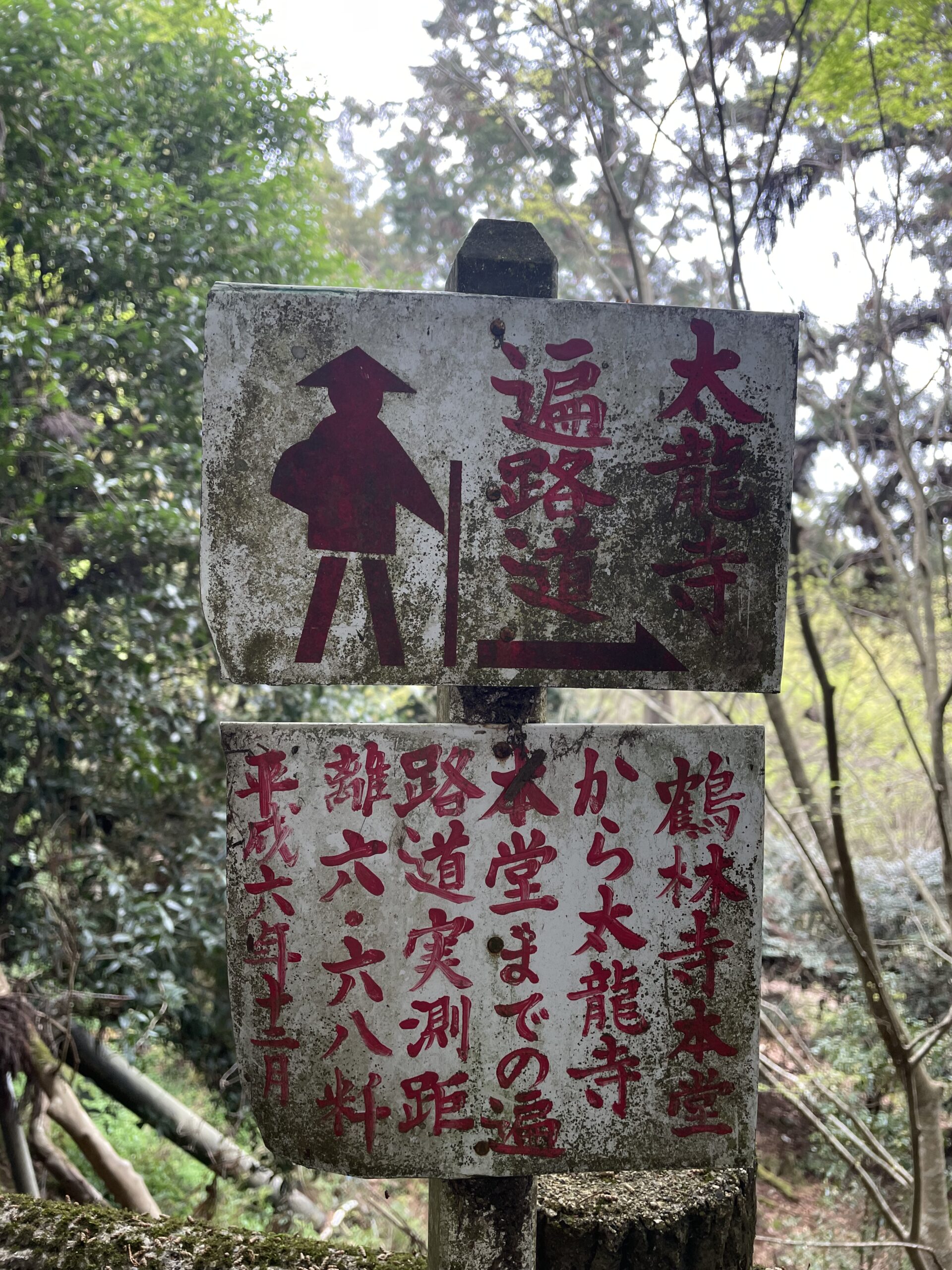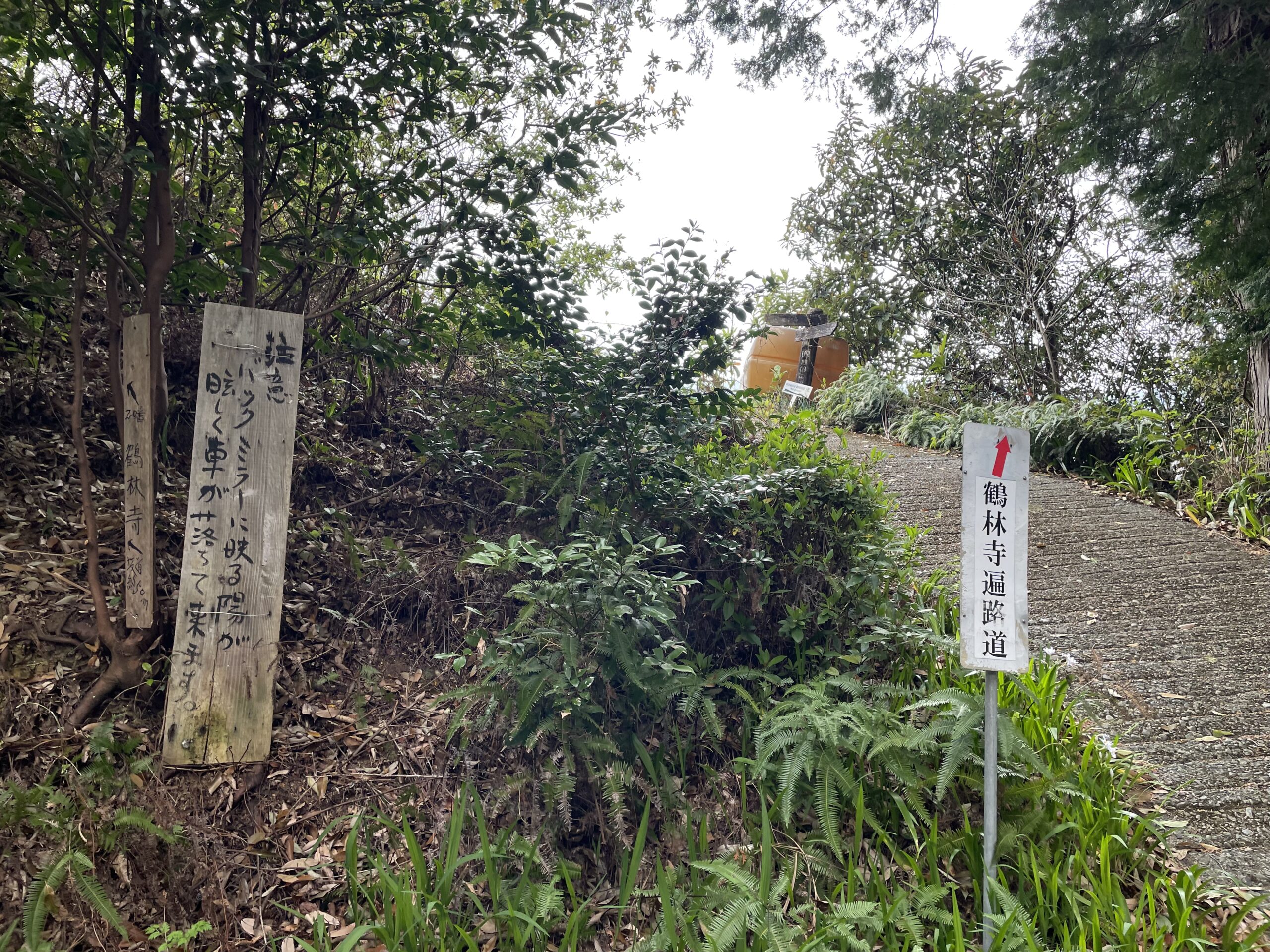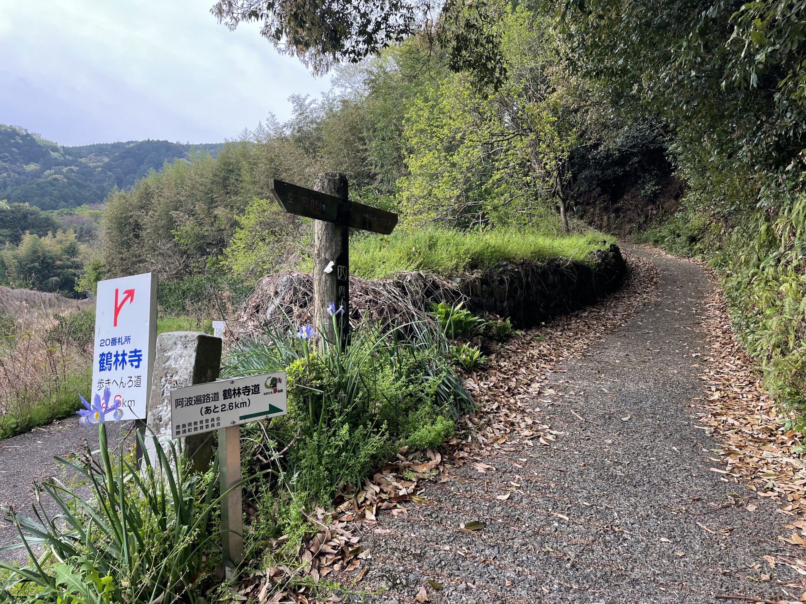 鶴林寺への遍路道は案内がもりもりあった。おなじみのへんろ札、「四国のみち」の矢印、ロータリークラブの看板、そして木の板に手書きで書かれた味のある道案内など。分岐を間違えた場合、「ここは遍路道ではありません」とお知らせまでしてくれる。「過疎高齢化によりゴミ拾いをする者もいないので、お持ち帰りください」といった切実なものもあった。歩き遍路のために道を維持してくれることがどんなに大変なことか。「鶴林寺道」は、地元の方の長年の保全活動が評価され、遍路道で初めて国の史跡に指定された道なのである(2010/平成22年指定)。