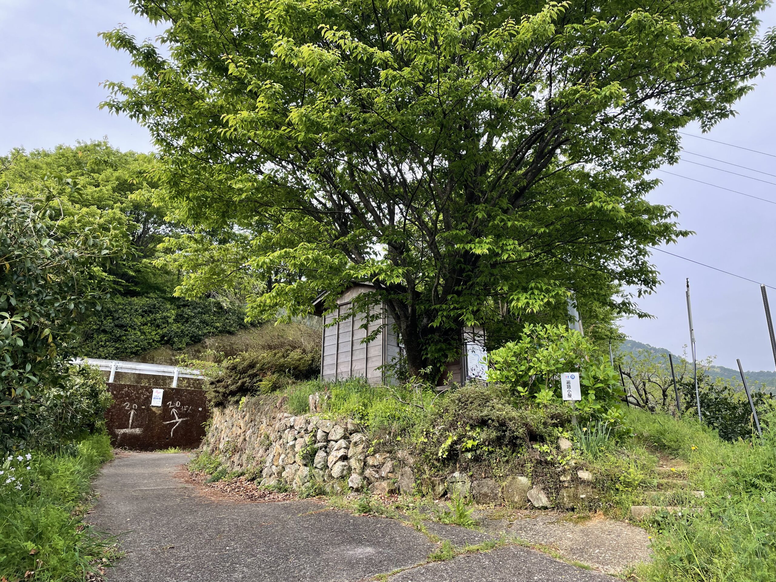 引き続きコンクリート舗装路を上っていくと、仁王門っぽい形をした休憩所とトイレ(工事現場にある感じのもの)があった。まだ歩き出して20分も経っていなかったので、休憩は取らずそのまま進むことにする。ここで迷う人が多いらしく、奥の壁には大きく道順が刻まれていた(車道に出たあと、ちょっとジグザグする)。この休憩所はかつては立派な茅葺き屋根だったらしいが、残念ながら撤去されてしまったのか、ツルンとした簡素な屋根になっていた。