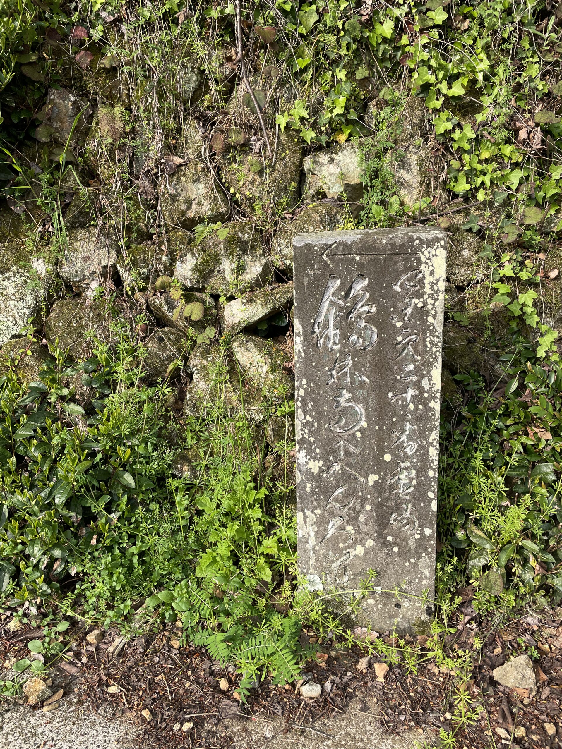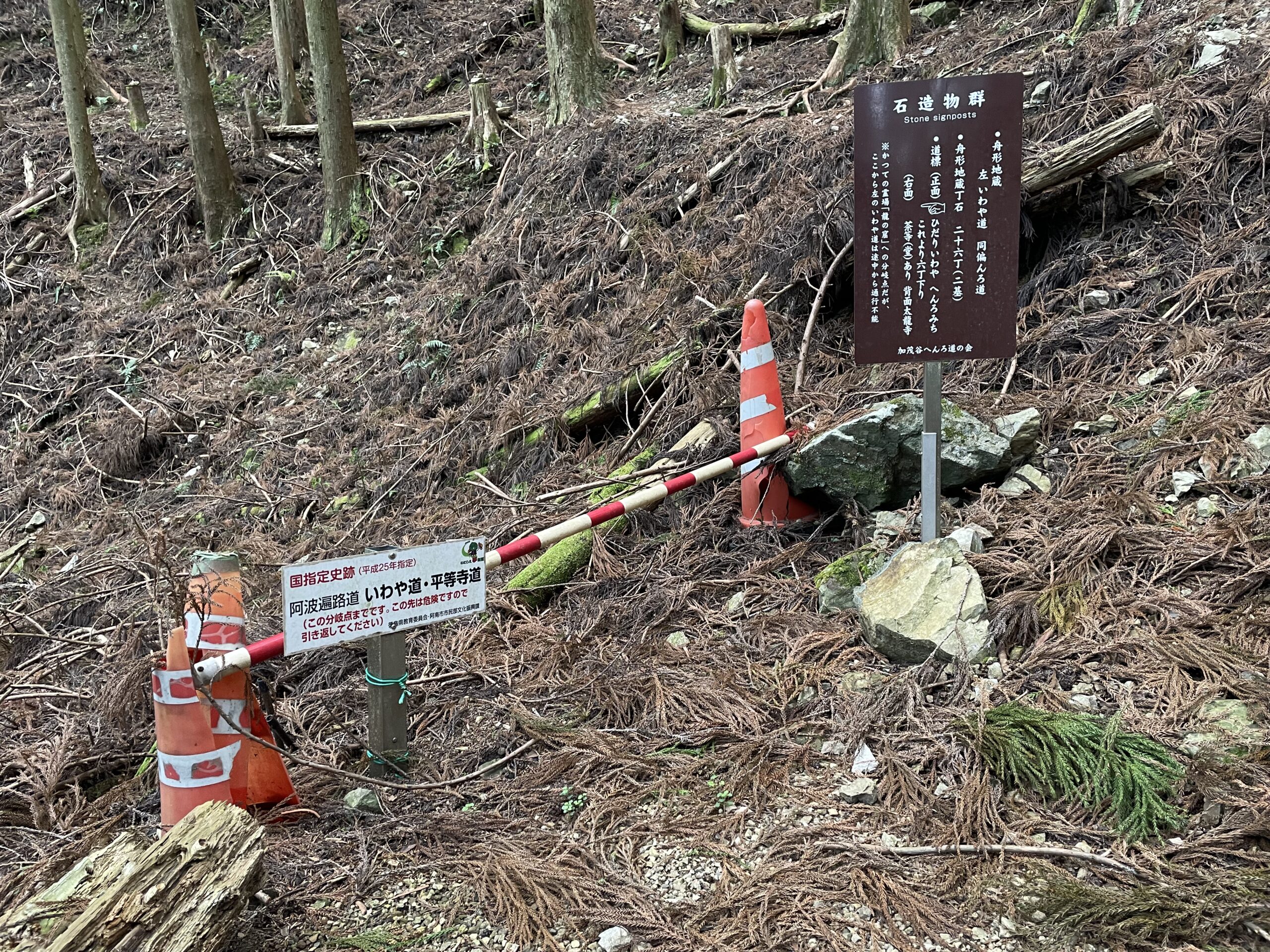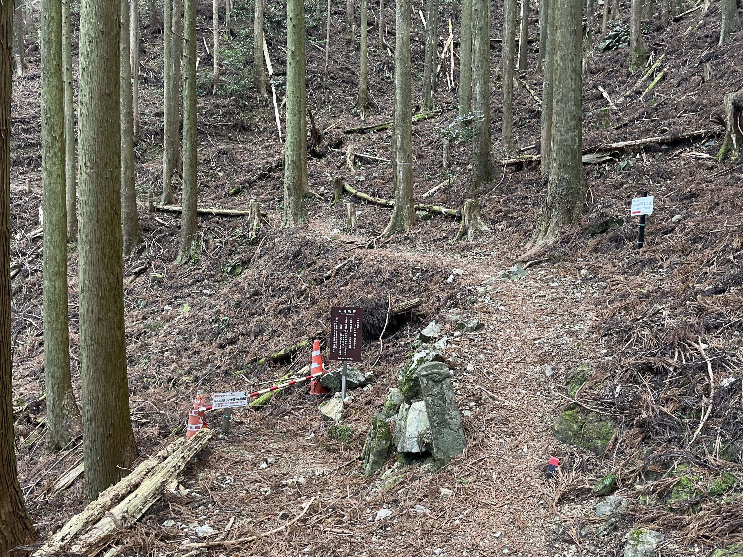 14:30、「平等寺道」への分岐まで来た。「いわや道」はその名の表すとおり、かつては「龍の窟」と呼ばれる霊場(空海が修行したとされる)に繋がっていたのだが、長年のうちにその窟は消失してしまい所在が分からなくなった。そのため、「平等寺道」と交わる地点から先の「いわや道」も消滅しており、立ち入り禁止となっている。かつて多くの人々がこれを見て進路をとったであろう道しるべだけがそこに残されていた。