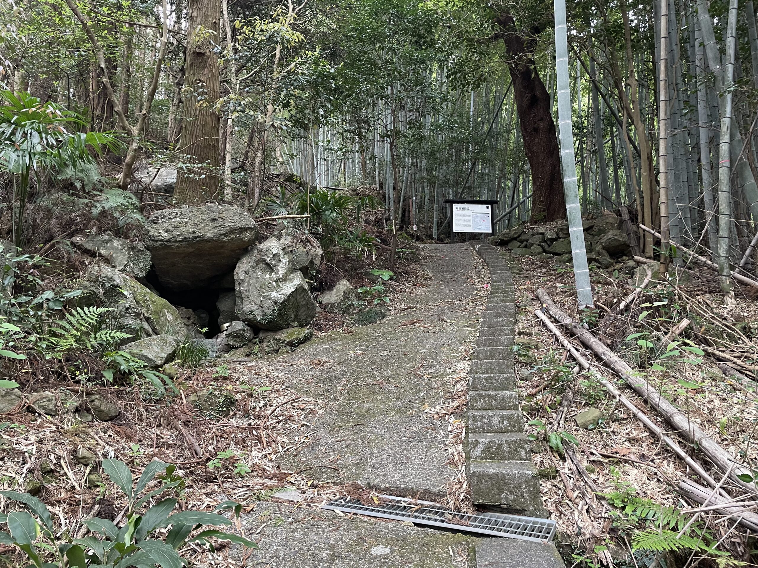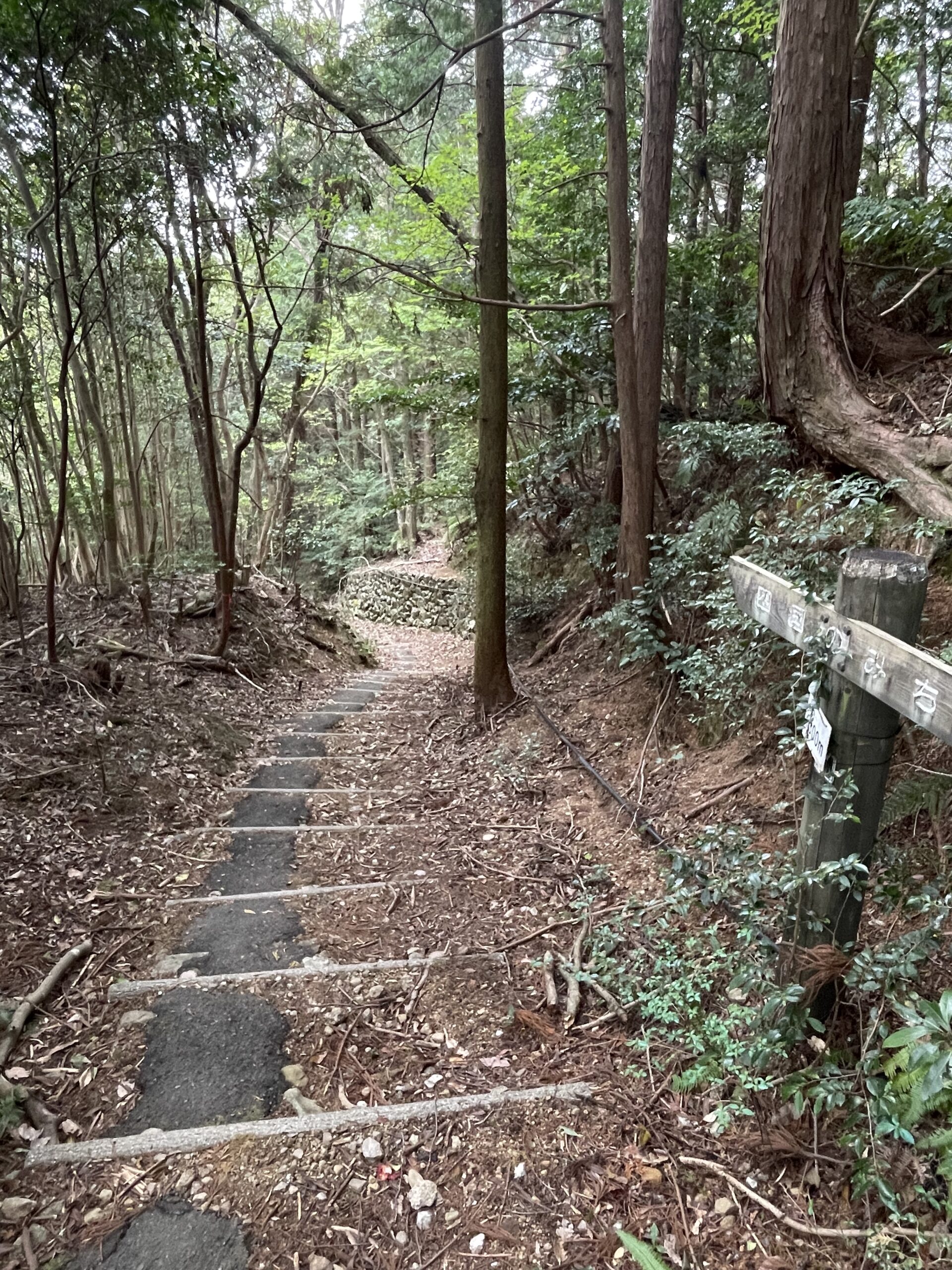 登り口から30分、完全に車の通れない幅の歩き道に入った。ここから竹林になり、古道の雰囲気満点だ。最初の100mほどの登り道は、コンクリートで舗装された急坂の脇に階段も付けてくれているバリアフリー登山道(?)になっている。初めて見る形式だ(この後もあんまり見なかった気がする)。どっちが楽か試してみたが、登りなら階段のほうがマシかな…?