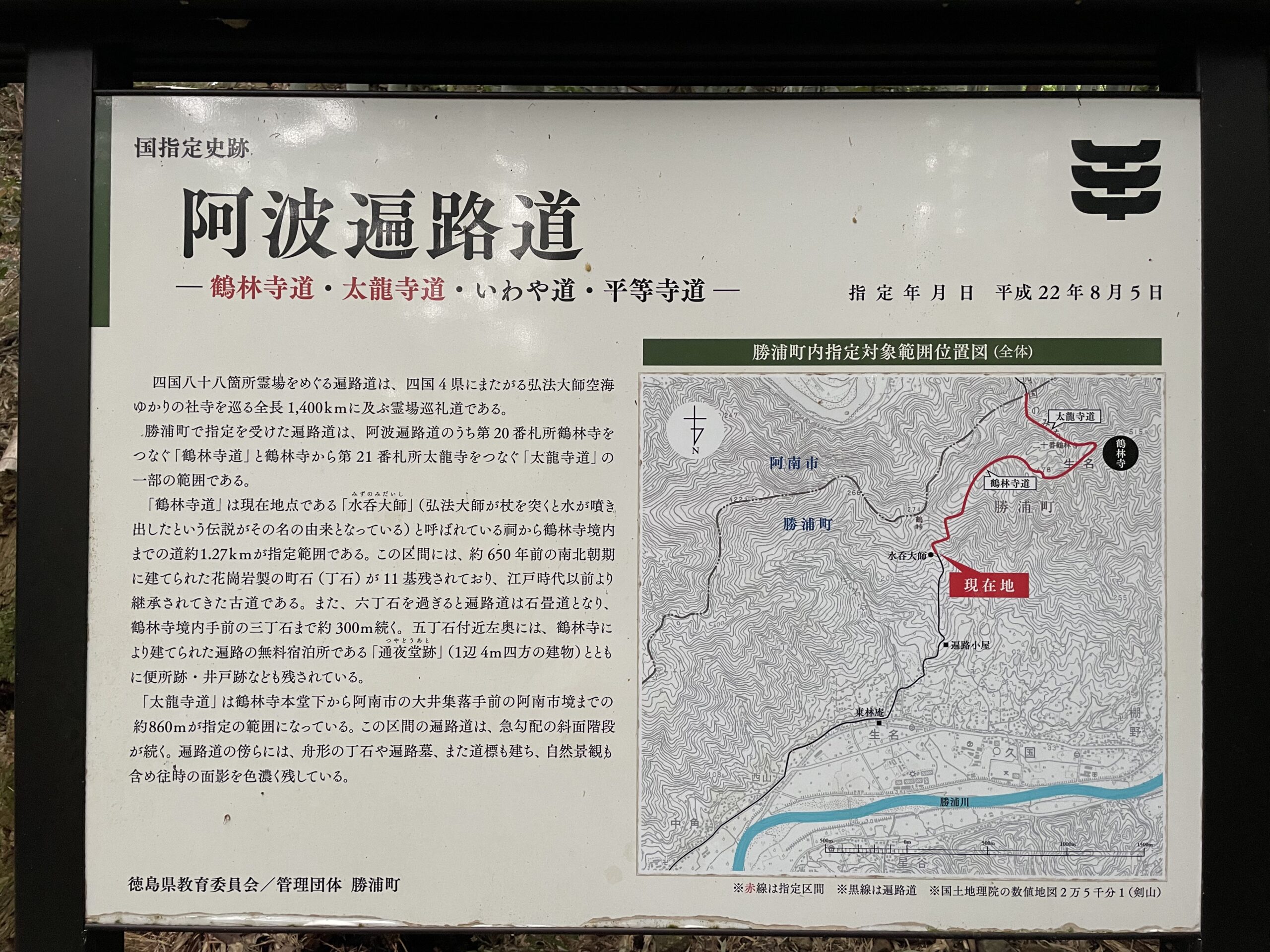 ここには「水呑大師」の祠がある。弘法大師が杖を突くと水が湧き出し、渇水の時にも枯れたことがないという水脈で(弘法大師あるある)、階段を登りだしてすぐに柄杓が置かれた水飲み場があった。補給ポイントのない今日のルートでは貴重な水源である。祠は水飲み場からさらに少し登ったところにあり、その前は小さな休憩スペースになっていて、「阿波遍路道」の説明板が設置されていた。前述の国の史跡「鶴林寺道」はこの「水呑大師」から鶴林寺の境内までの約1.3kmを差すようだ。