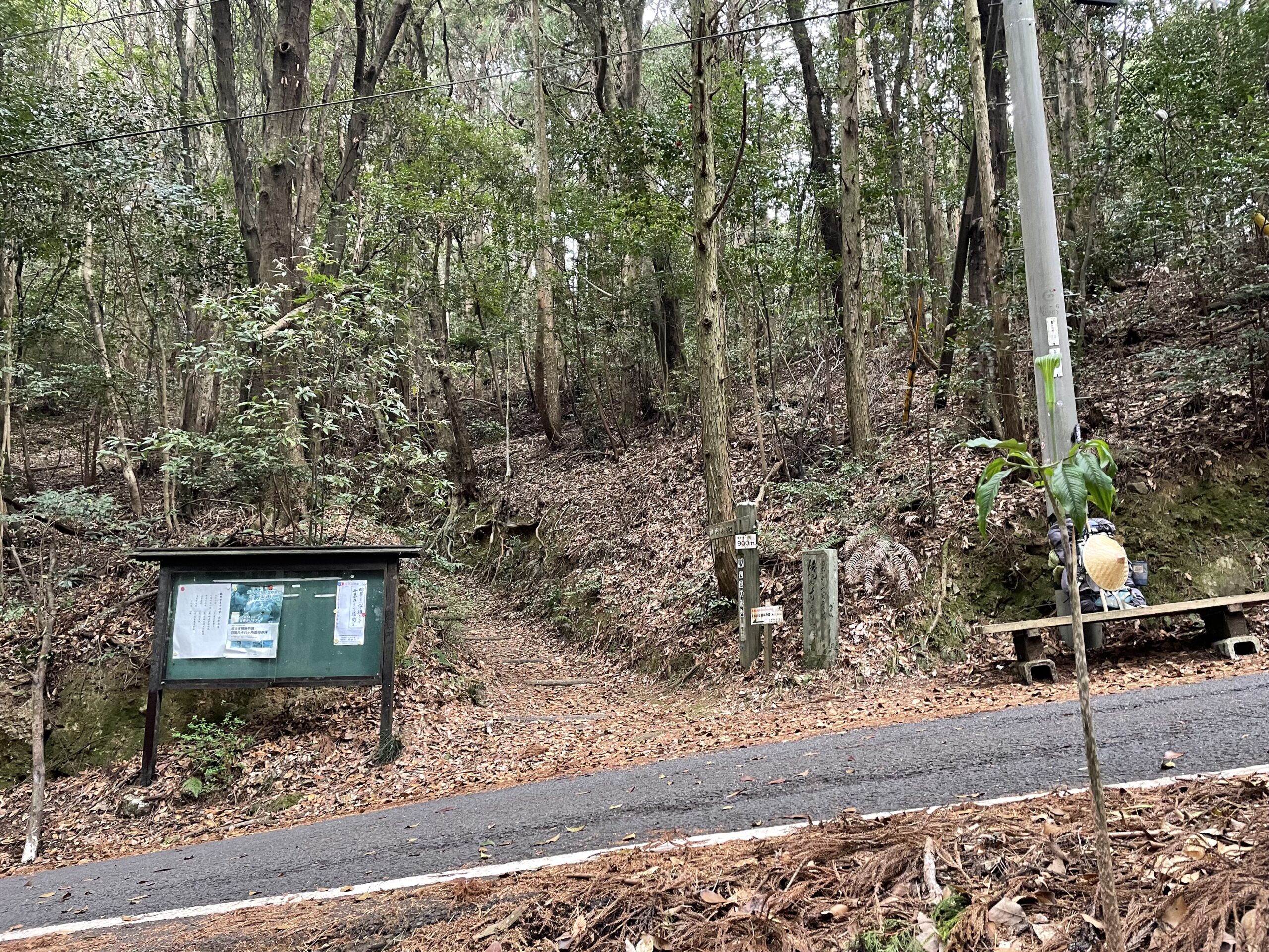 水呑大師からひたすら登ること約20分、車道と交差した。不思議なことに、脇のベンチにザックだけがどーんと置いてある。今日始めての他のお遍路さんの気配だ。近くに誰かテントでも張っているのかと思ったが、そうでもなさそうだった。なんだろう?