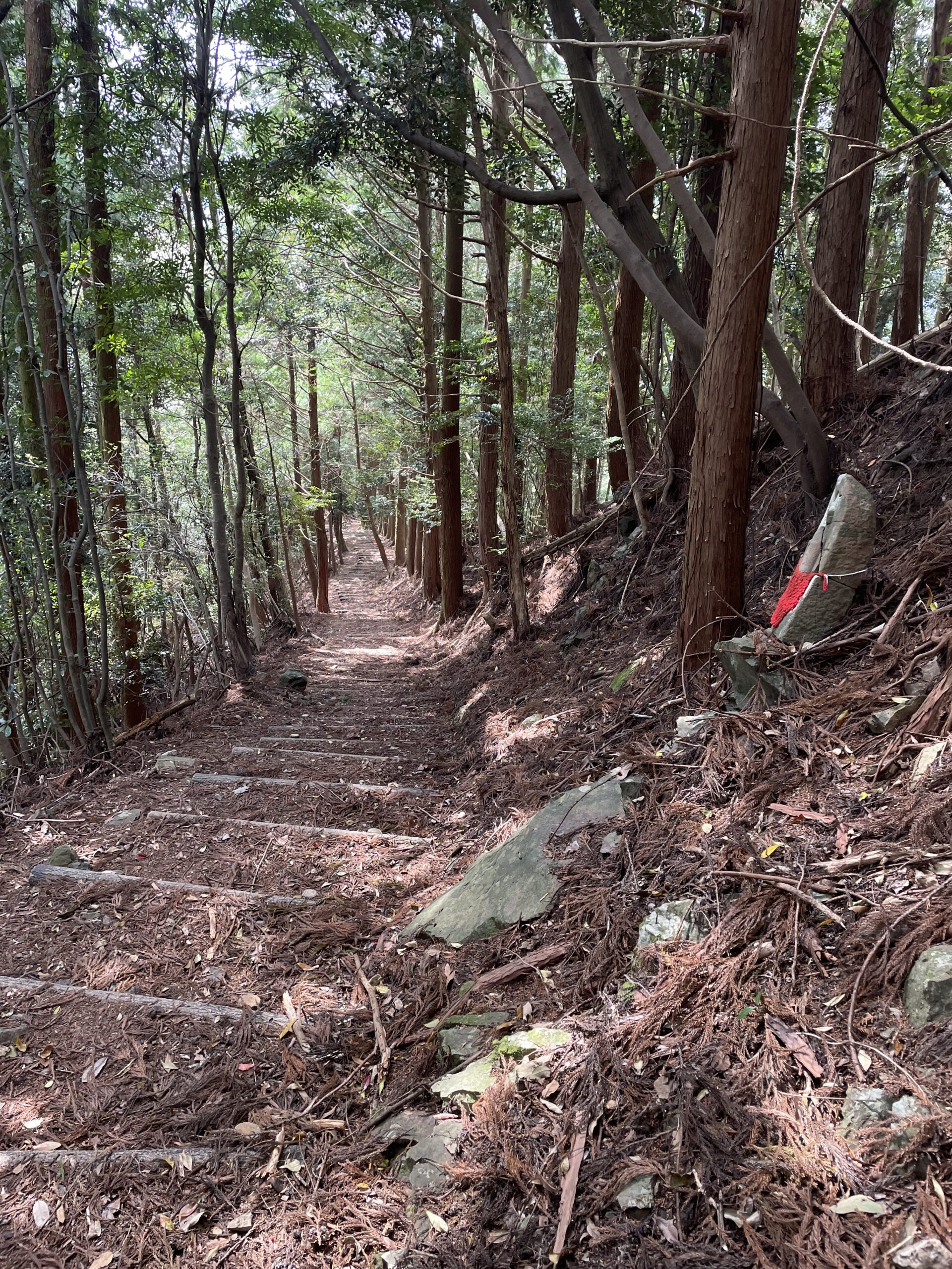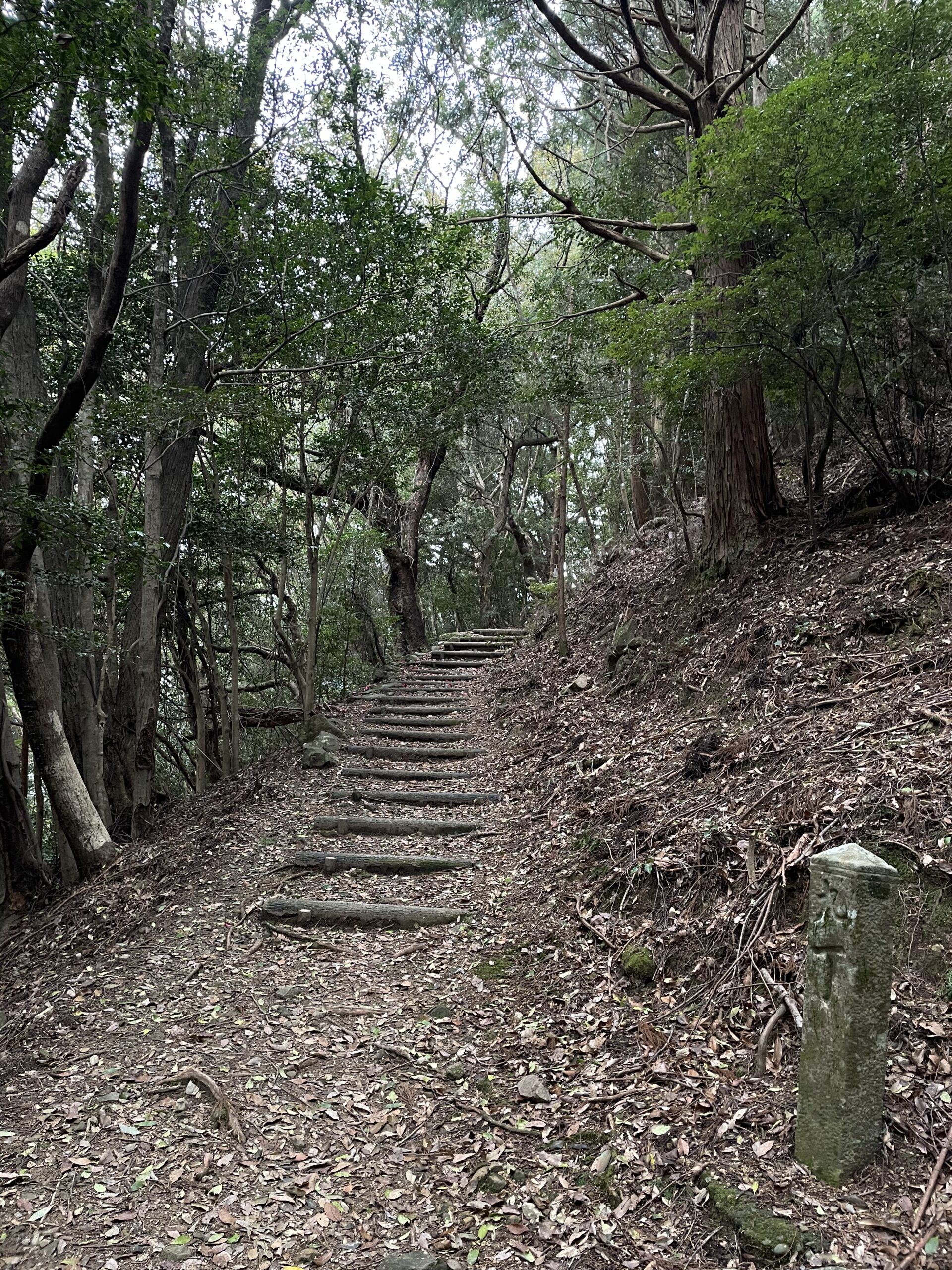 道は川から次第に離れていき、11:45、階段ゾーンが始まった。「へんろ転がし・太龍寺ver.」の開始である。そして、これが想像以上にきつかった。ここから約40分間、山門に着くまでひたすら階段。あまりにも景色が変わらなさ過ぎて、写真もほとんど撮っていないくらい、階段。鶴林寺道には所々緩やかな部分もあったのに対し、こちらは見上げるような角度の階段が延々と続いた。金剛杖を頼りに、ただただ、ただ一段一段を刻んでいく…。これが、修行か…。