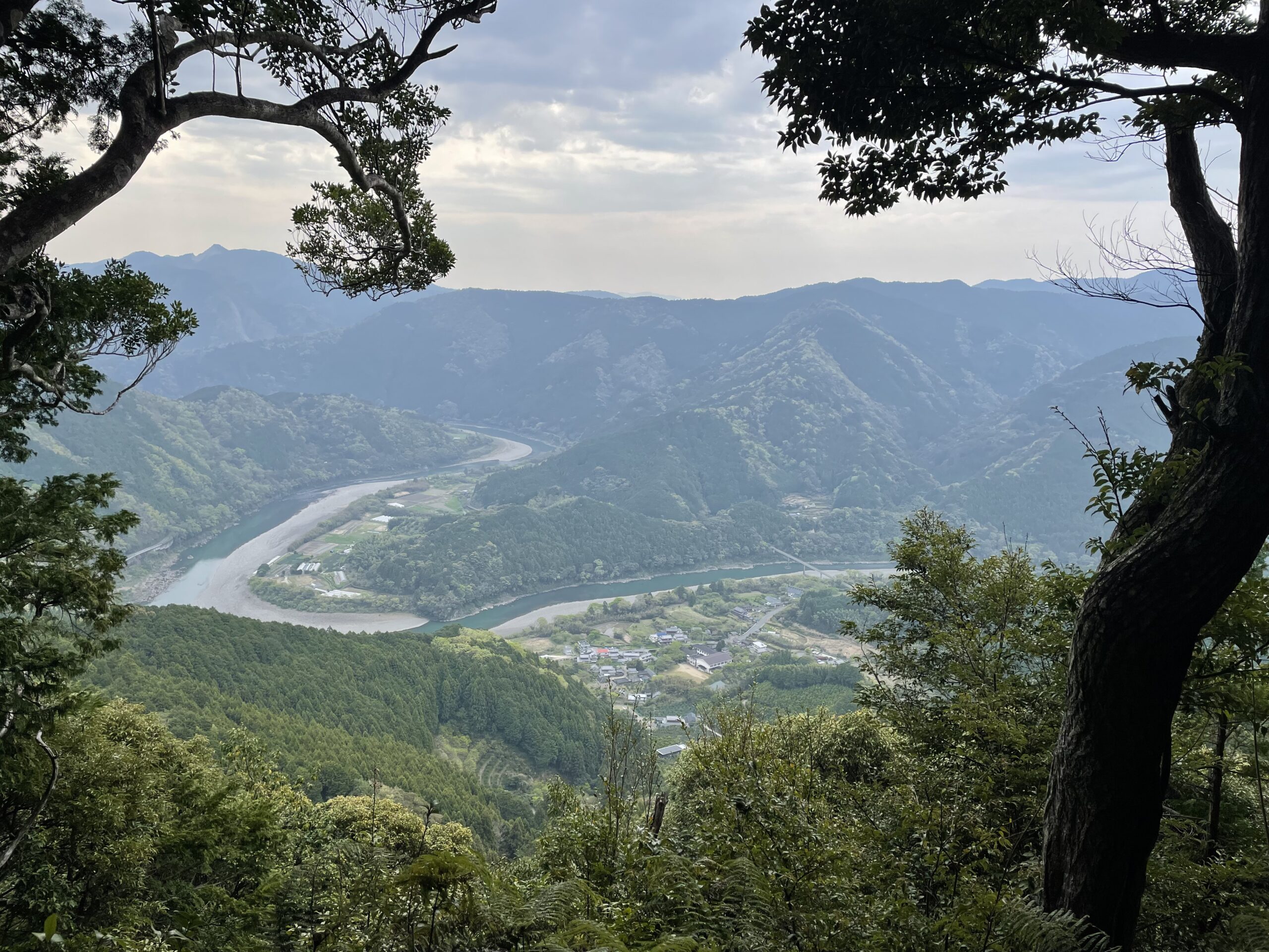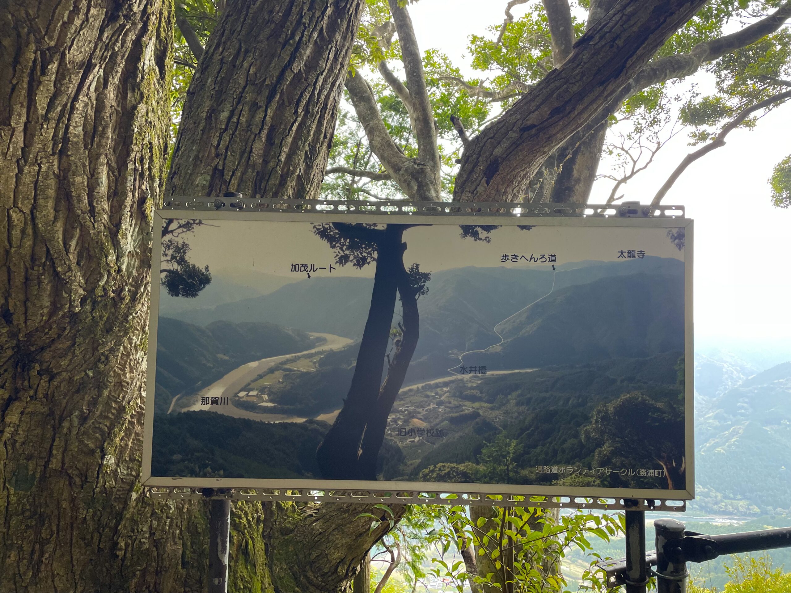 登っても登っても終わりの見えない階段をヒーハー言いながら辿っていると、ふいに木立が途切れて景色が見渡せるようになっていた。ベンチもある。わー川が見える、と思って近づいてみると手前に何やら看板が。その宣うことには、”ここから太龍寺までのへんろ道を紹介するよ!下に川が見えるよね。そこの橋を渡った向こうの山の、一番てっぺんが太龍寺です♪ふぁいとー”