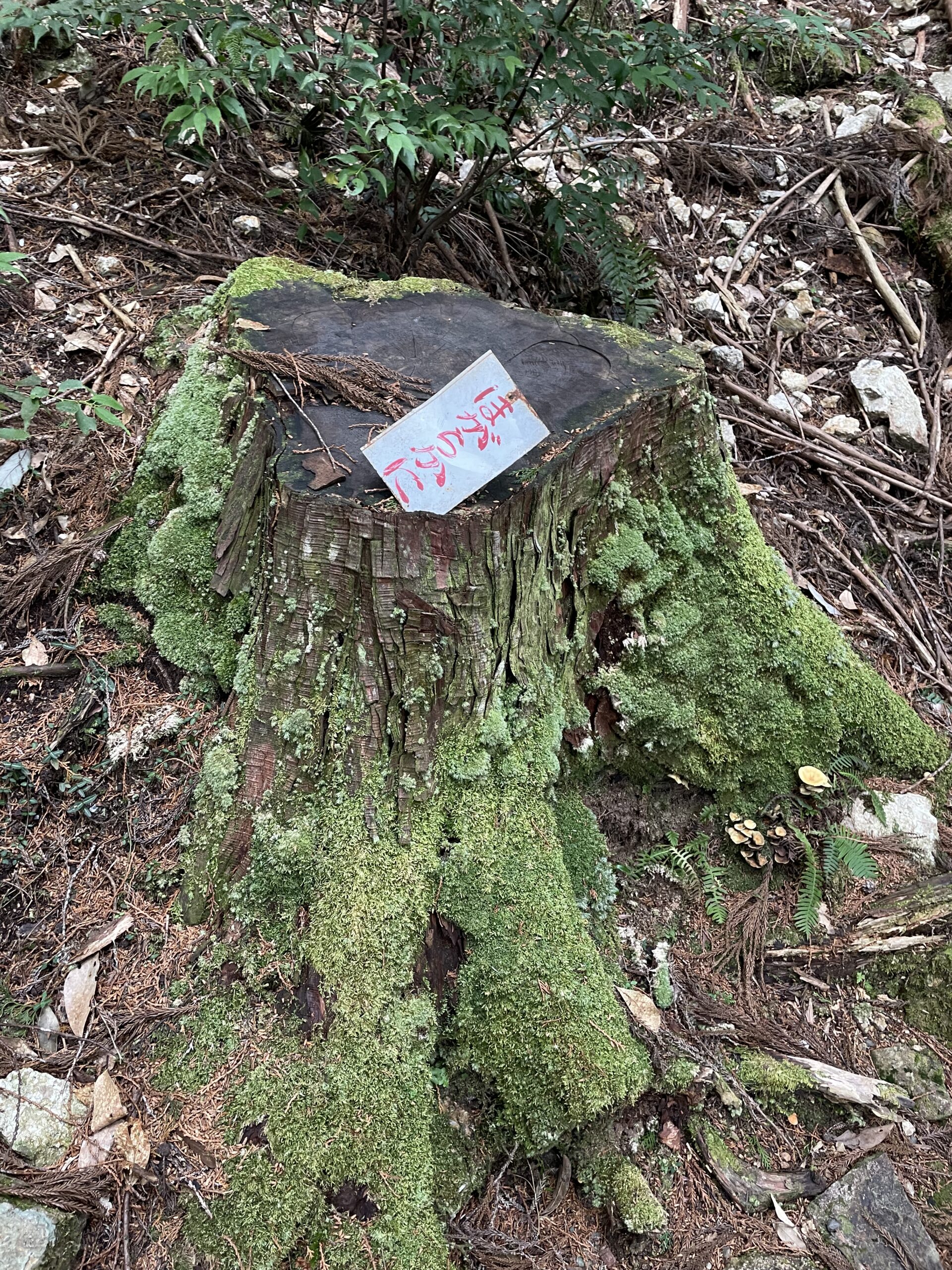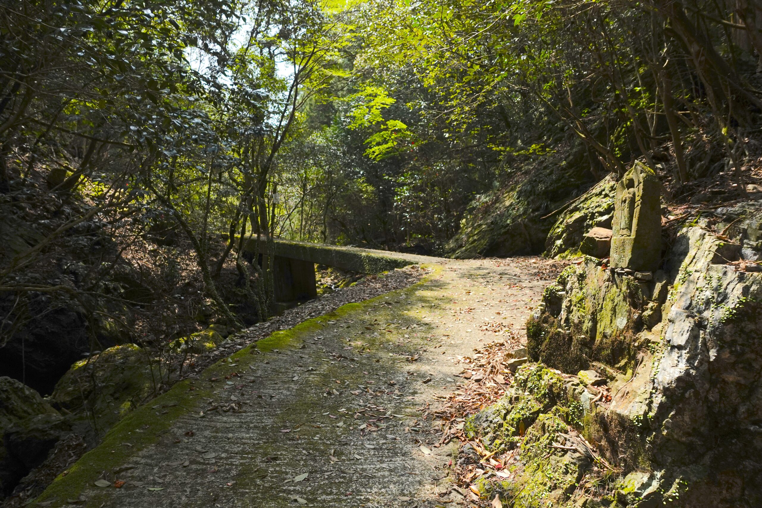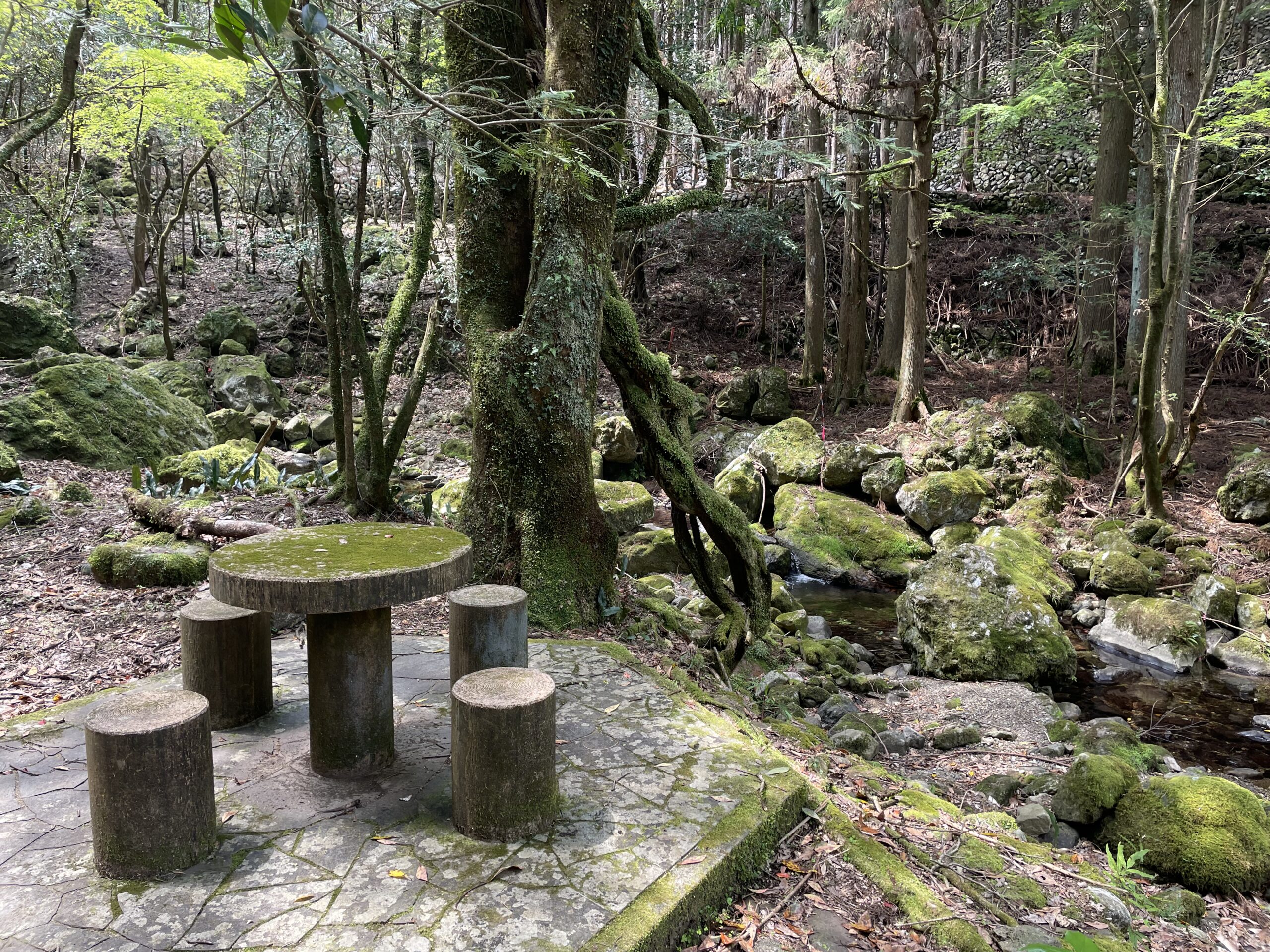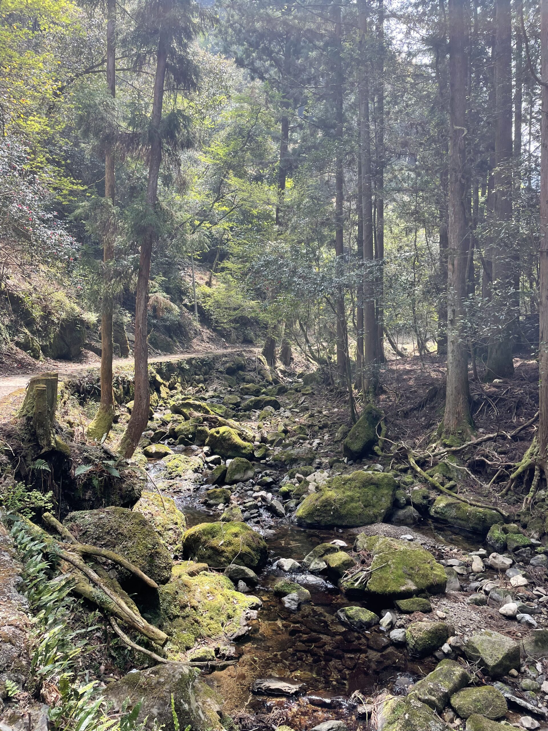 11:35、休憩所を出発した。しばらくは清流に沿って木漏れ日の中を歩く快適な道が続く。太古の昔から(おそらく昭和初期くらいまでは)集落があったからなのか、そういうつもりで見るとこの一帯は他のところよりも平らに開けていて石垣もたくさん残されていた。いかにも家が建っていたと思われる更地もある。川幅が広くて流れも緩やかなので住みやすかったんだろうな。…今は鳥の声しかしない。