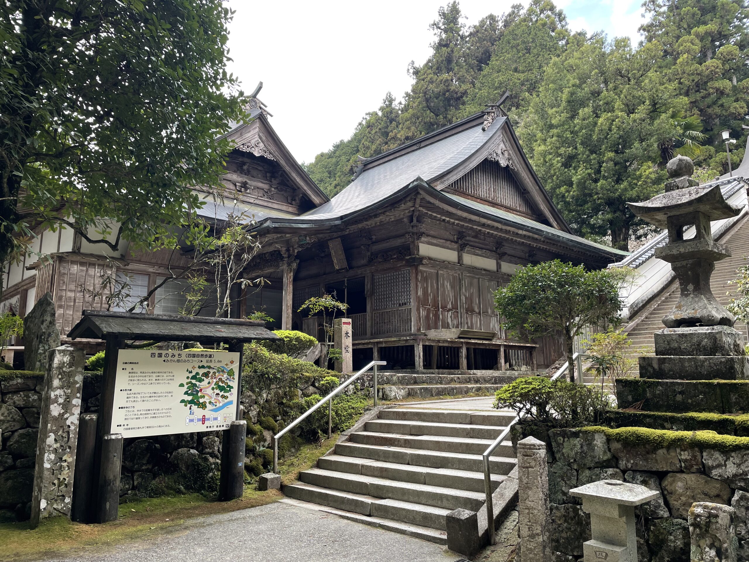 山門から堂宇までは少し距離があり、しばらく歩くと正面に「四国のみち」の看板と、茂兵衛さんの巨大な石柱が見えてくる。手水舎は簡素な作りで、「やましたさん」の柄杓は見当たらなかった。何となく予想した通り本堂に向けては長い階段が伸びていて、最後のひとふんばりと100段くらいありそうなそれを登る。