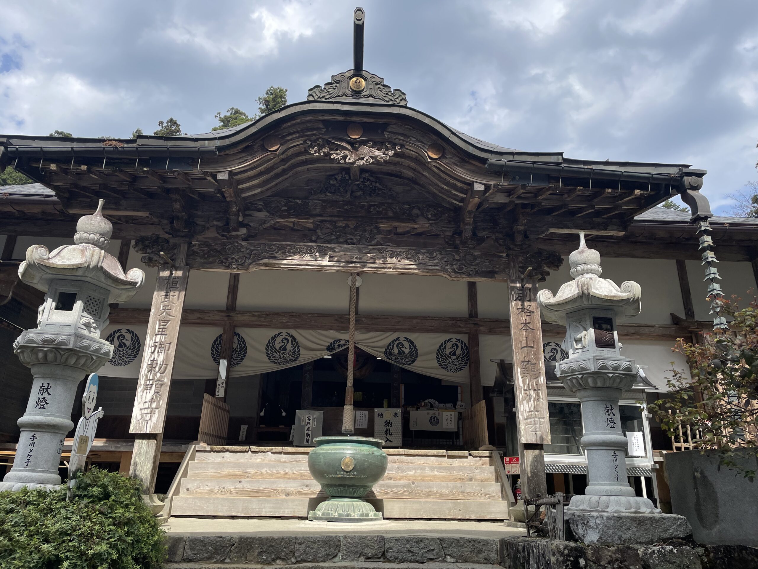 仁王門と同様、本堂にも阿吽の鶴が配されていた。香炉のお線香は3人分。参拝者は少なく、静謐な山寺の空気が境内に満ちていた。本堂の脇にはこれまで見たこともないキラキラお目々の小僧さん。トレードマーク(?)の虚ろな瞳に誰かが命を吹き込んだようだが、ちょっと瞳孔が開きすぎてやいないだろうか。
