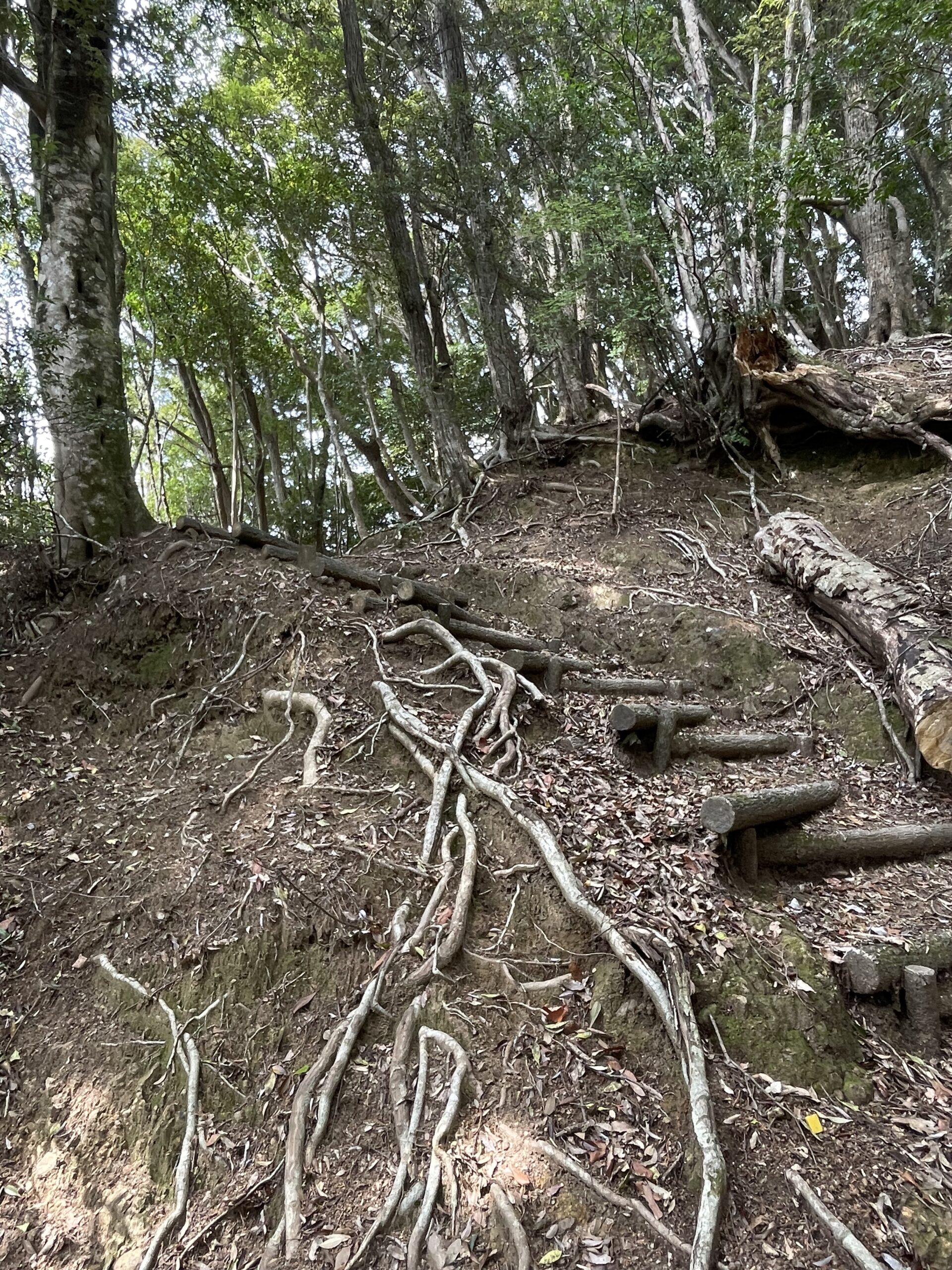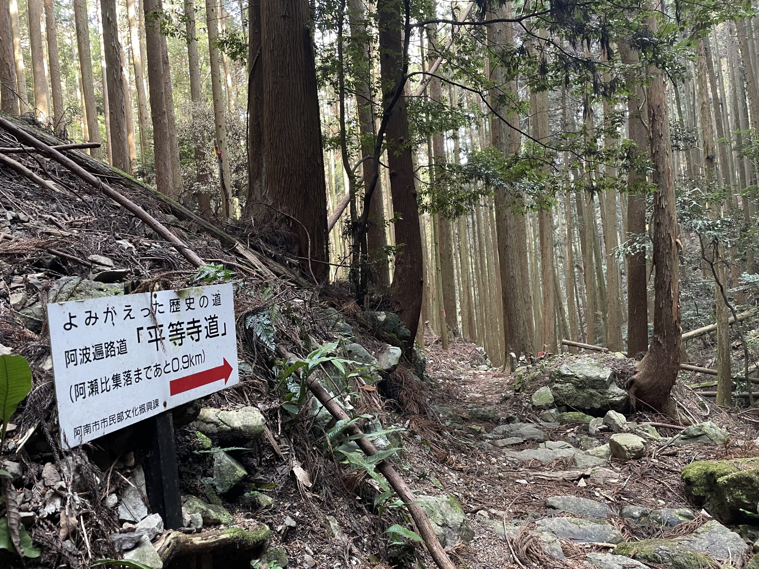 「平等寺道、阿瀬比集落まで2.5km」の看板を横目に、再び足早に歩き始める。この「平等寺道」が大変だった。さっきまであんなに快適な「高速道路」だったのに、全体的に道が谷側に傾斜していてロープを掴んでいないと足を滑らせて谷底に落ちてしまいそうだ。木の根っこも随所に剥き出しになっている。慎重にいきたいところだが、タイムリミットも気になる。ここまで半分(2.5km)を30分で来れたのに、残り半分が2時間半ってどういうことだ?もっと凄いのが来るってこと??焦る気持ちと足元へのセルフ注意喚起がまぜこぜになって、あとから考えると「歩き遍路ハイ」とも言えるものすごい集中力でかっ飛ばしていた。