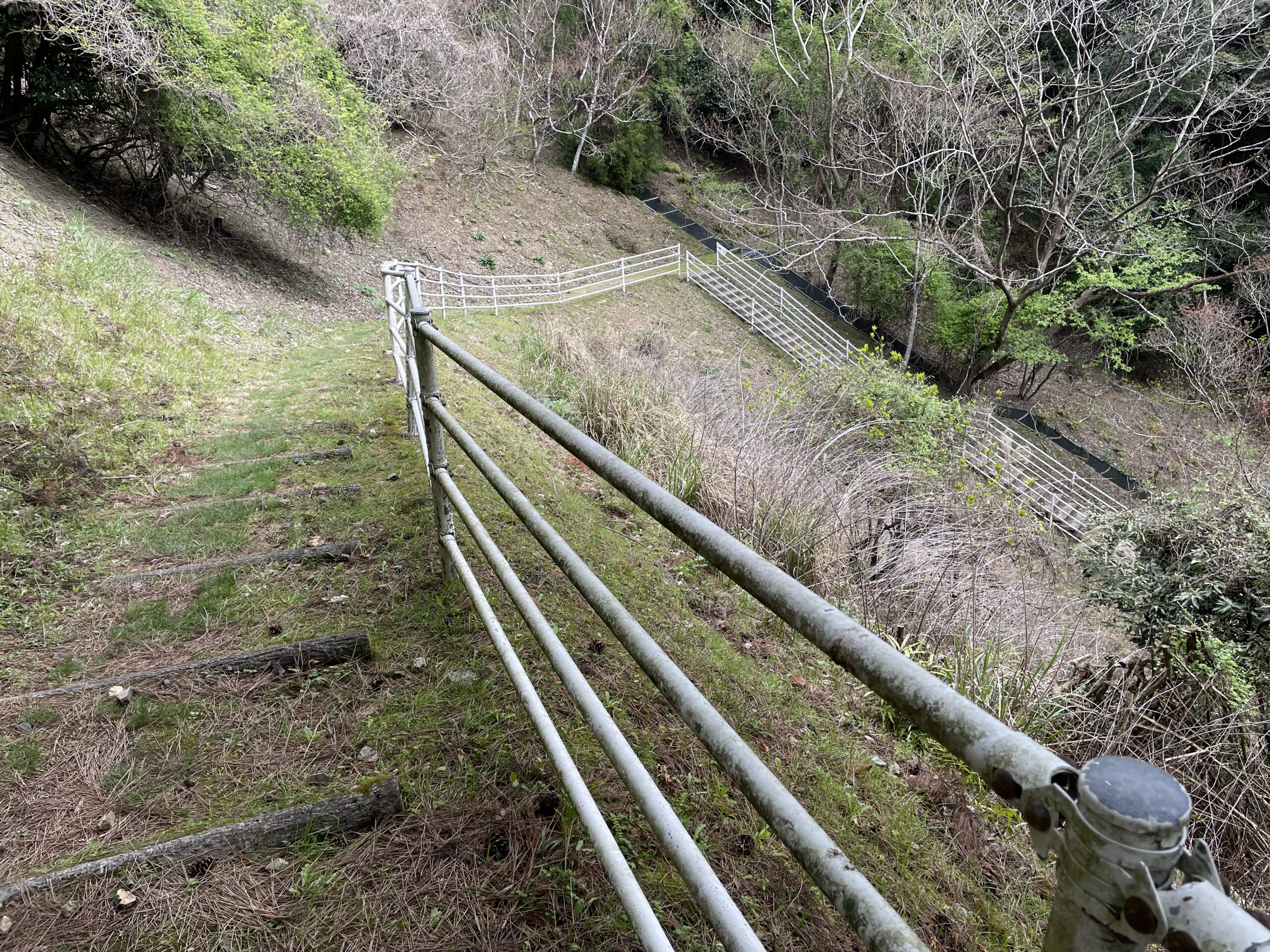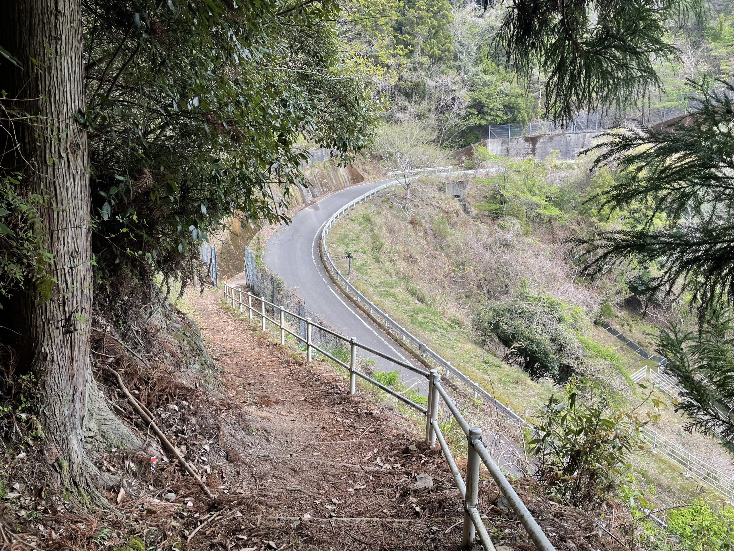 30分ほどで車道へと下りてきた。階段のふもとにはこれから登る人のためにと杖がたくさん用意されていたが、果てしない階段が顕わに見えている分、こっちから登る方が気持ち的に嫌だなあ。逆打ちのお遍路さんは大変だ。やれやれ、ここからはしばらく道路かなっと思って振り返るとすぐ先に歩き道に誘導する案内があって、がくり…。下りる方も串刺しか。