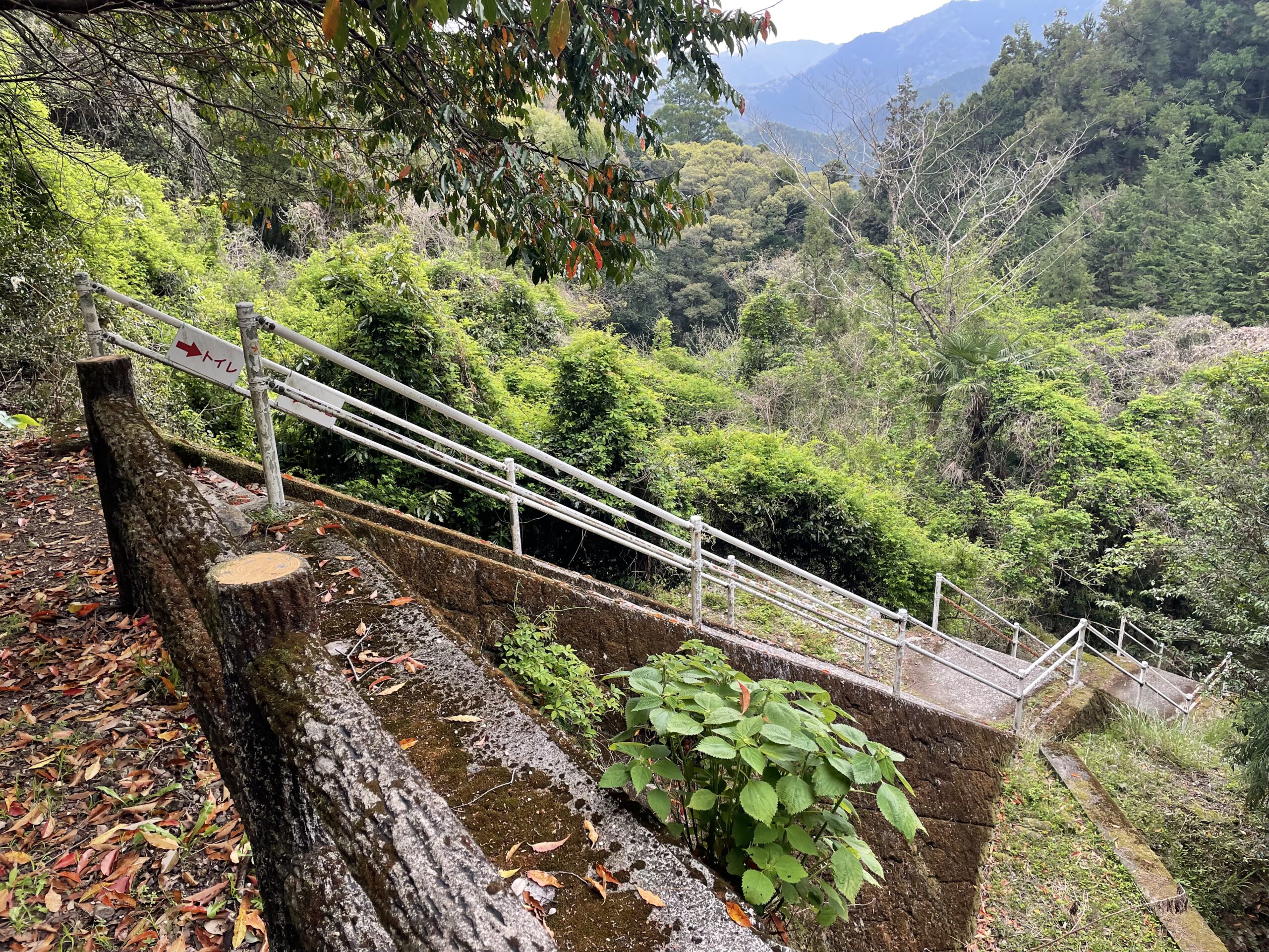 この分岐には「←太龍寺 5.3km/↑太龍寺ロープウェイ山麓駅 7.9km」とでかでかと書かれた石柱が建っていた。アスファルト道を直進すれば、魅惑のロープウェイが待っている…。いやいや、もちろん歩き道を行きますとも。と左手に進路をとった途端、谷底かという急勾配で下り続けている階段が見えて腰を抜かした。そうだった、まだ川を渡るところまで来ていなかった。「ガっと下る」は、まだ続いていたのだ。