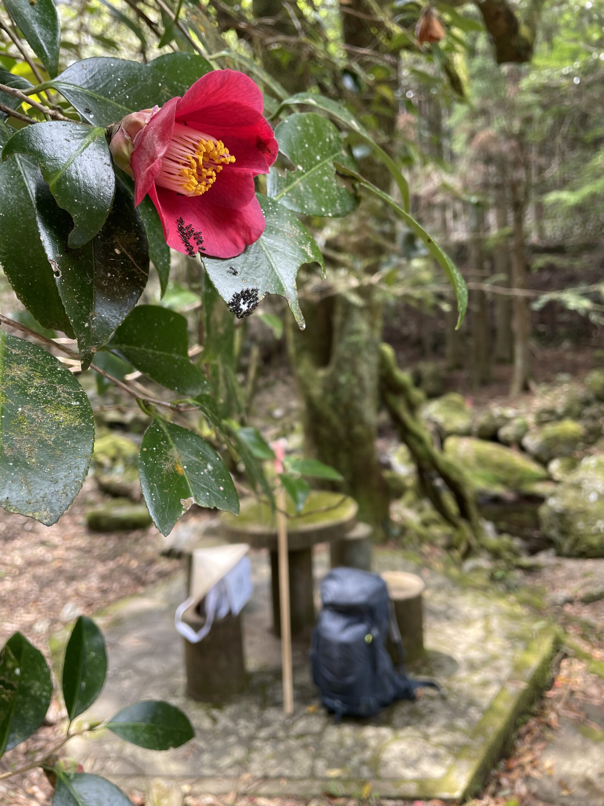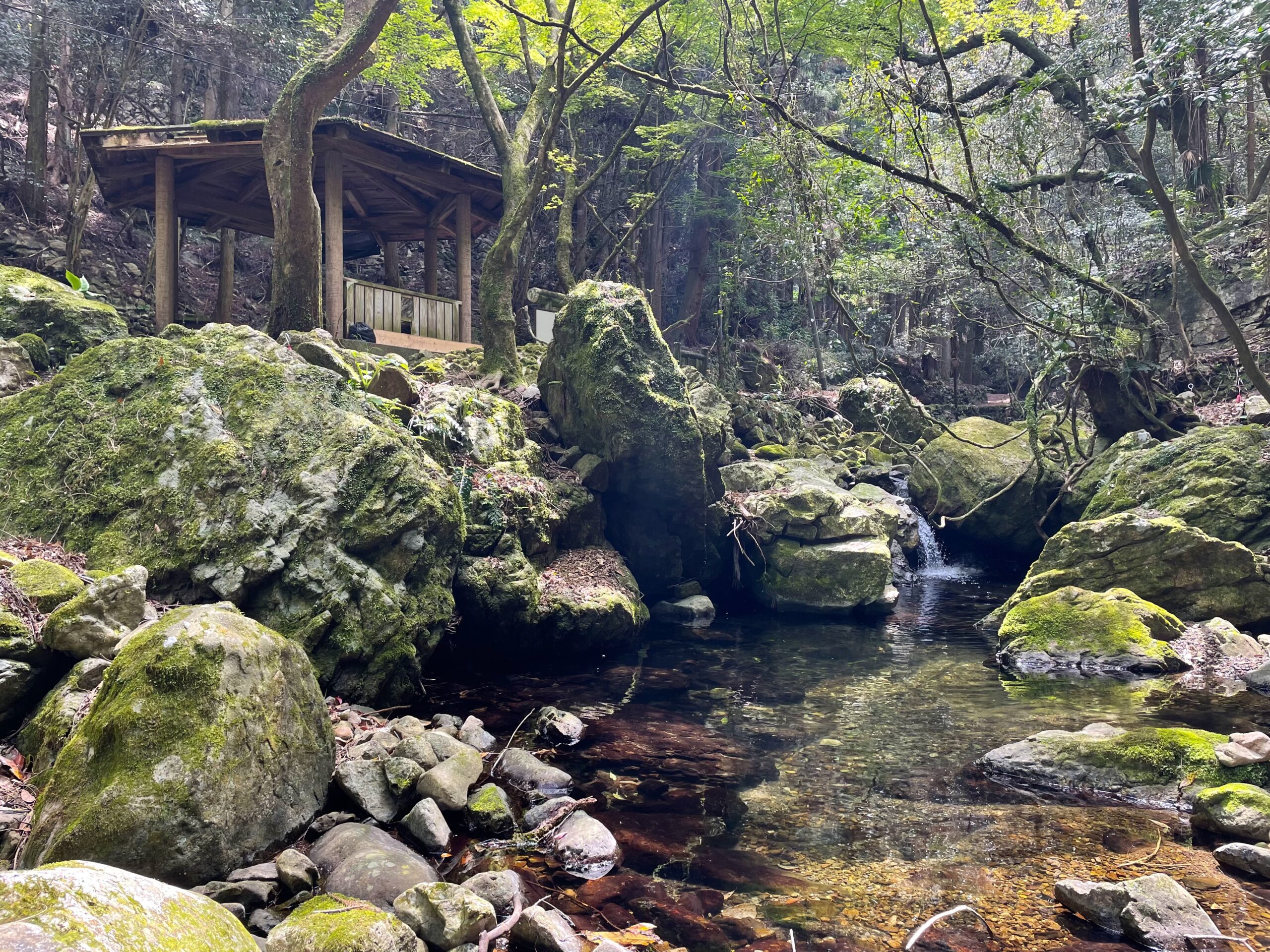 11:15(登り口から25分)、清流の脇に休憩所が見えた。わー素敵!とテンションがあがり、ここでお昼休憩にしよう、といそいそと荷物を下ろす。ピクニック気分でおにぎりをひとつパクリ。まだ時間が早いから、もうひとつは太龍寺で食べようかな(※結論から言うとそんな余裕はなかった)。おやつのさつま芋を食べていると、カナダおじちゃんが手を振りながら通り過ぎていった。こちらも手を振って見送る。