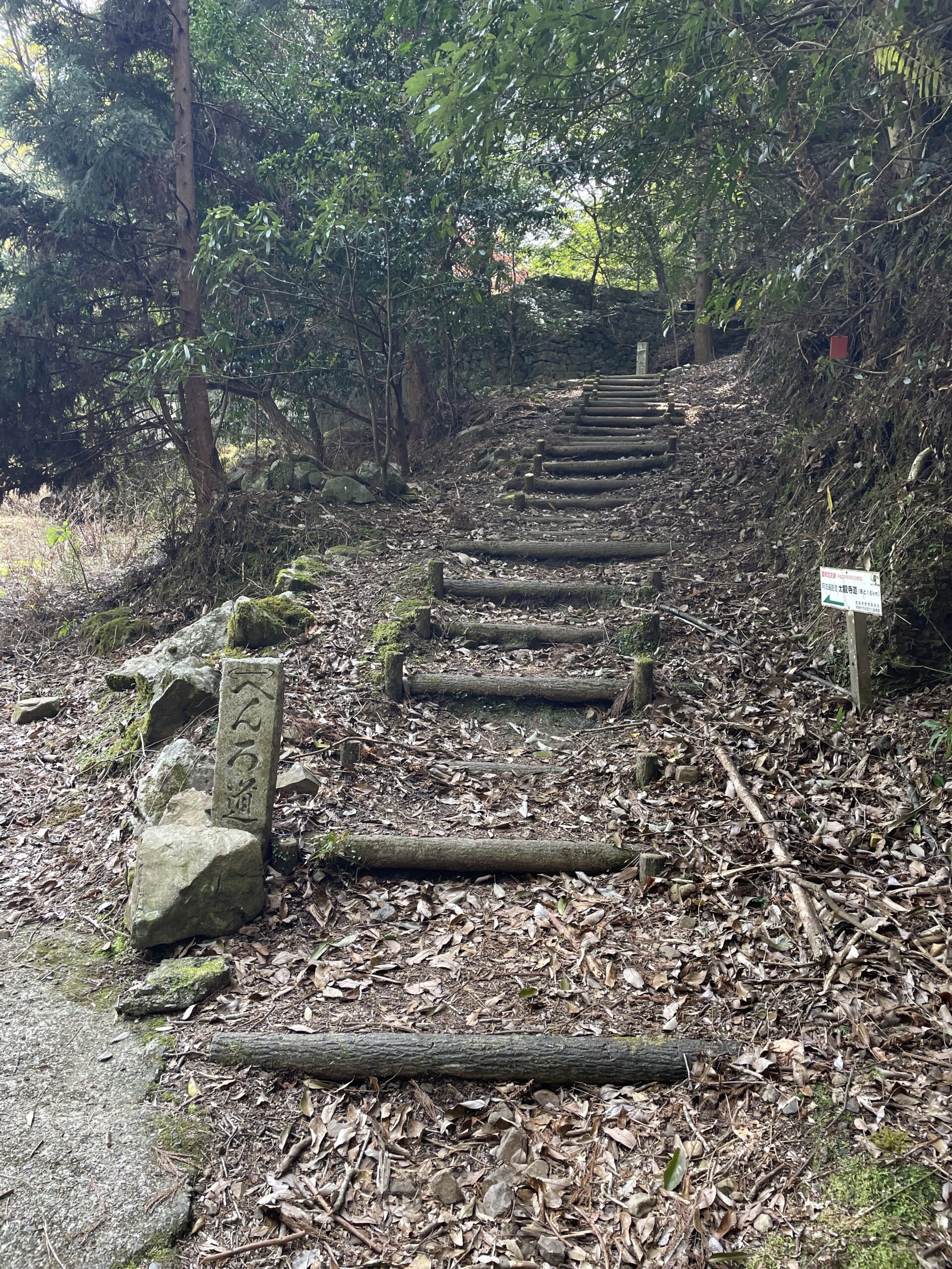 水井橋を渡ってほどなくして、太龍寺への登り口に着いた。「太龍寺道」は鶴林寺の境内を下りるところ(「崖」笑)から始まるが、ここからが登りパートの開始である。説明板のところに「あなん遍路史跡めぐり」というパンフレットがあり、荷物になるので紙のものはあまりもらわないようにしているのだが、写真入りの詳しい説明があり面白そうだったので、あとでゆっくり読もうと一部もらってみた。