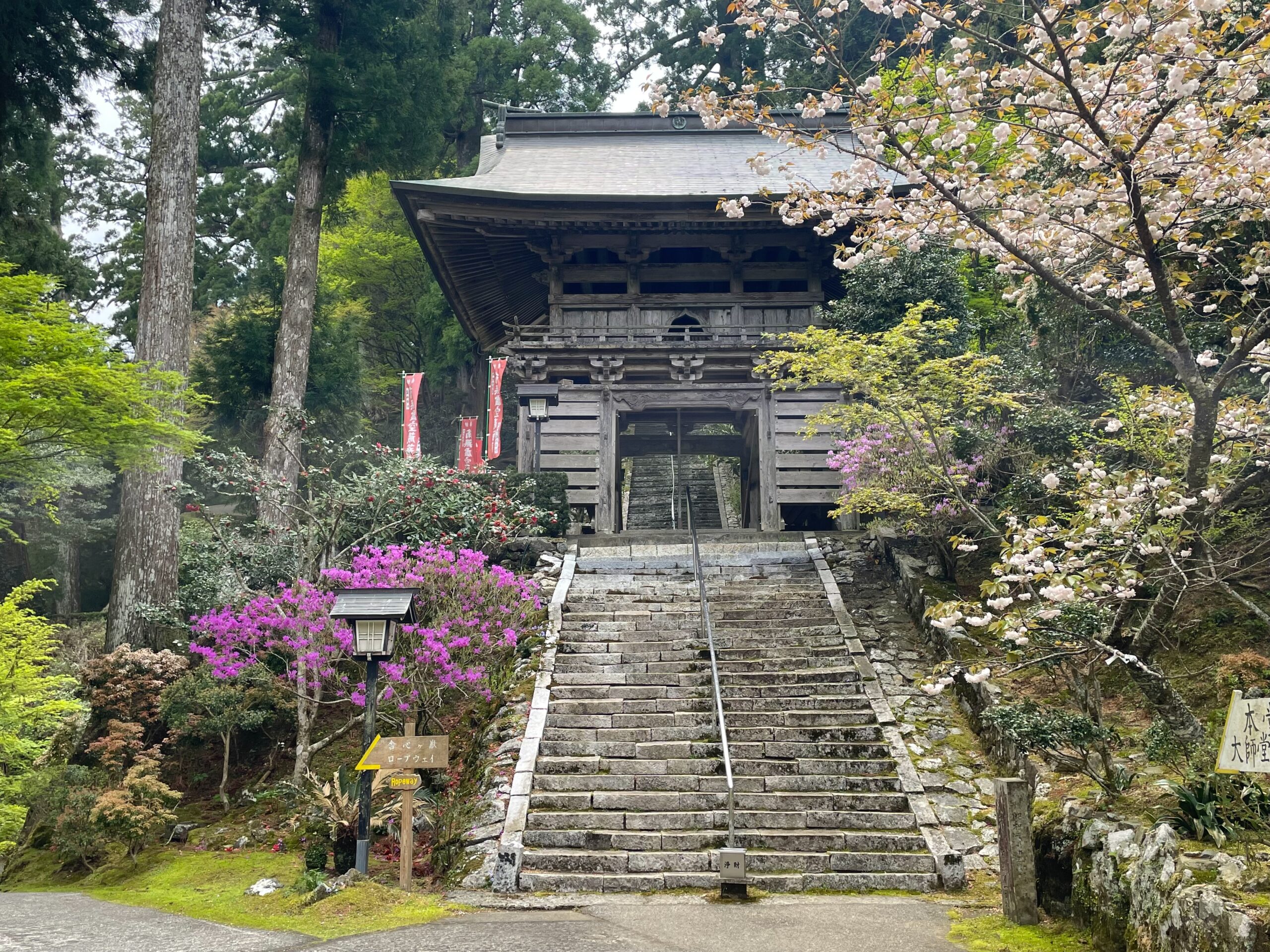 階段の上に屋根が見えたので、「ついに本堂か!」と思いきや、今度は鐘楼門だった。しかしこれがまた趣のある建物で、シャクナゲ、椿、八重桜と色とりどりの花々に囲まれて佇むその姿にため息が出た。ひとしきり鐘楼門フィーバー(写真撮影)をしたあと、階段を上って鐘を撞く。比較的小さめの鐘だったのだが、意外に重い音がした。その先にもまだ階段が続き、休憩所にザックを置かずにそのまま背負ってきてしまったのを少し後悔。ただ、一昨日の方がふくらはぎがキンキンに張って痛かった気がする。昨日の慈眼寺参拝(距離短め)を挟んだことで、ほどよいクールダウンになっているようだ。