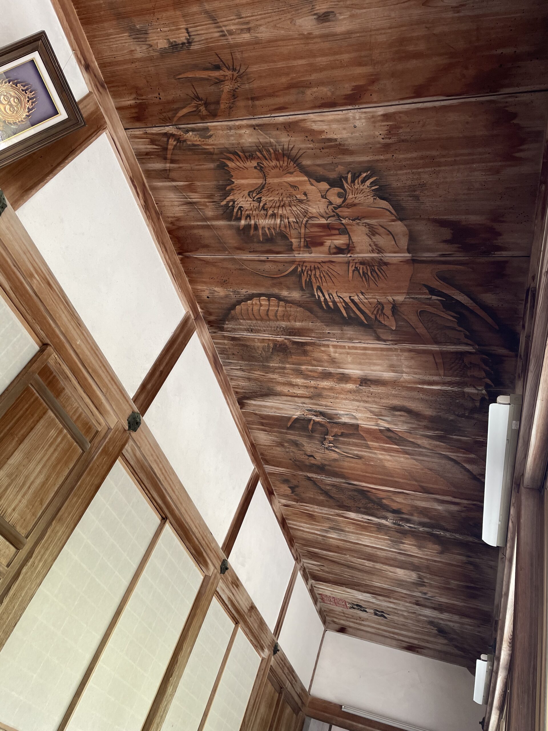 納経のあと、「龍天井」を覗きに行った。法要のあと持仏堂にはまだお坊さんたちが何人かおられたが、「どうぞ見てください」と気さくに案内してくれる。外廊下の天井を見上げてみると、こちらをぎろりと見つめてくる龍の姿があった。明治期の高知の画家・竹村松嶺が描いたもので、どの方向から見ても目が合う不思議な瞳をしているという。