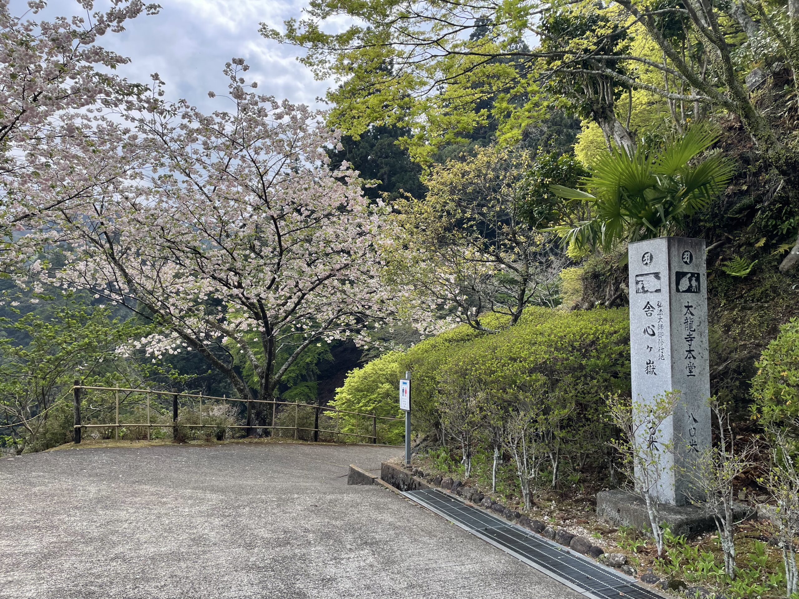 先ほどのロープウェイ山麓駅への分岐も結局この県道に繋がっていたらしく、ロープウェイの案内も書かれていた。全てのお遍路さんへ、ここから太龍寺までは約3km90分、ロープウェイの最終出発時刻は17時です、荒天時には運休の可能性あり、と英語で。うん、外国のお遍路さんが増えているのは知ってるけど、ぜひ日本語でも書いておいてほしいな…。あと、17時のロープウェイに間に合っても納経できないし、もっと言うと帰れないけどな。うん。