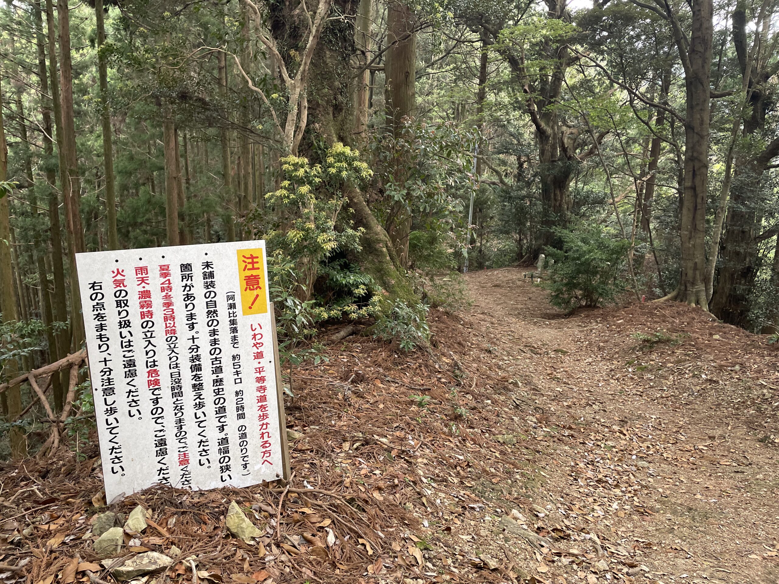 そこからしばらく進むと「いわや道」と「持福院道」との分岐が現れた。左の道は行く手に大きな看板が置いてあるのが見え、一瞬「通行止めか?」と思ってまっすぐ平坦な方へ進みたくなるが、「いわや道」は黄色い矢印の通り左へ下りていく。看板に近づいていくと、「阿瀬比集落まで約5km、3時間の道のりです。午後2時以降の立入はおやめください」と書かれていた。おいおい、さっき言ってたことと違くないか?しかも後から釣り上げて来ないでくれ。時間を確認すると、図ったかのように14:00ぴったりだった。
