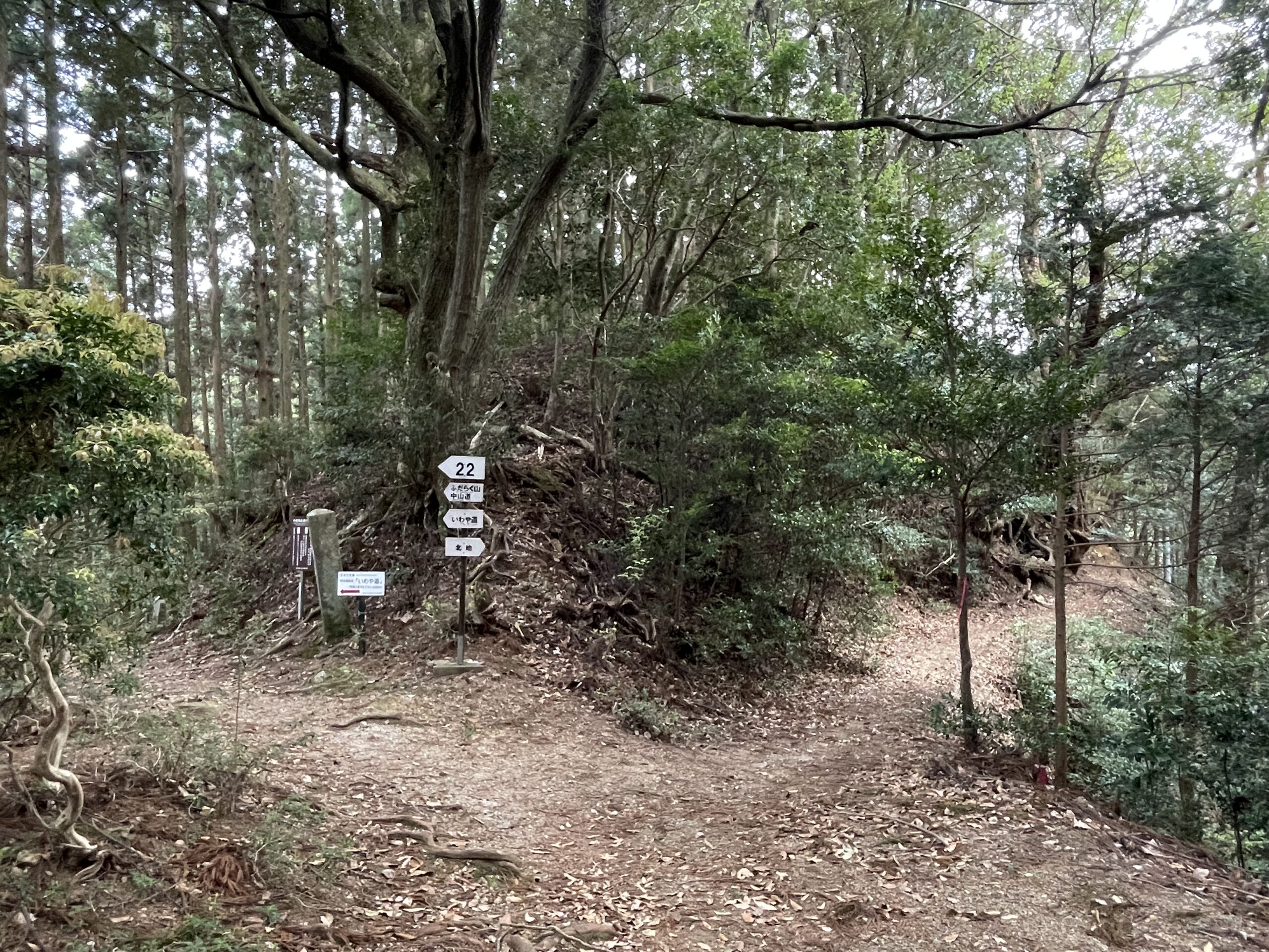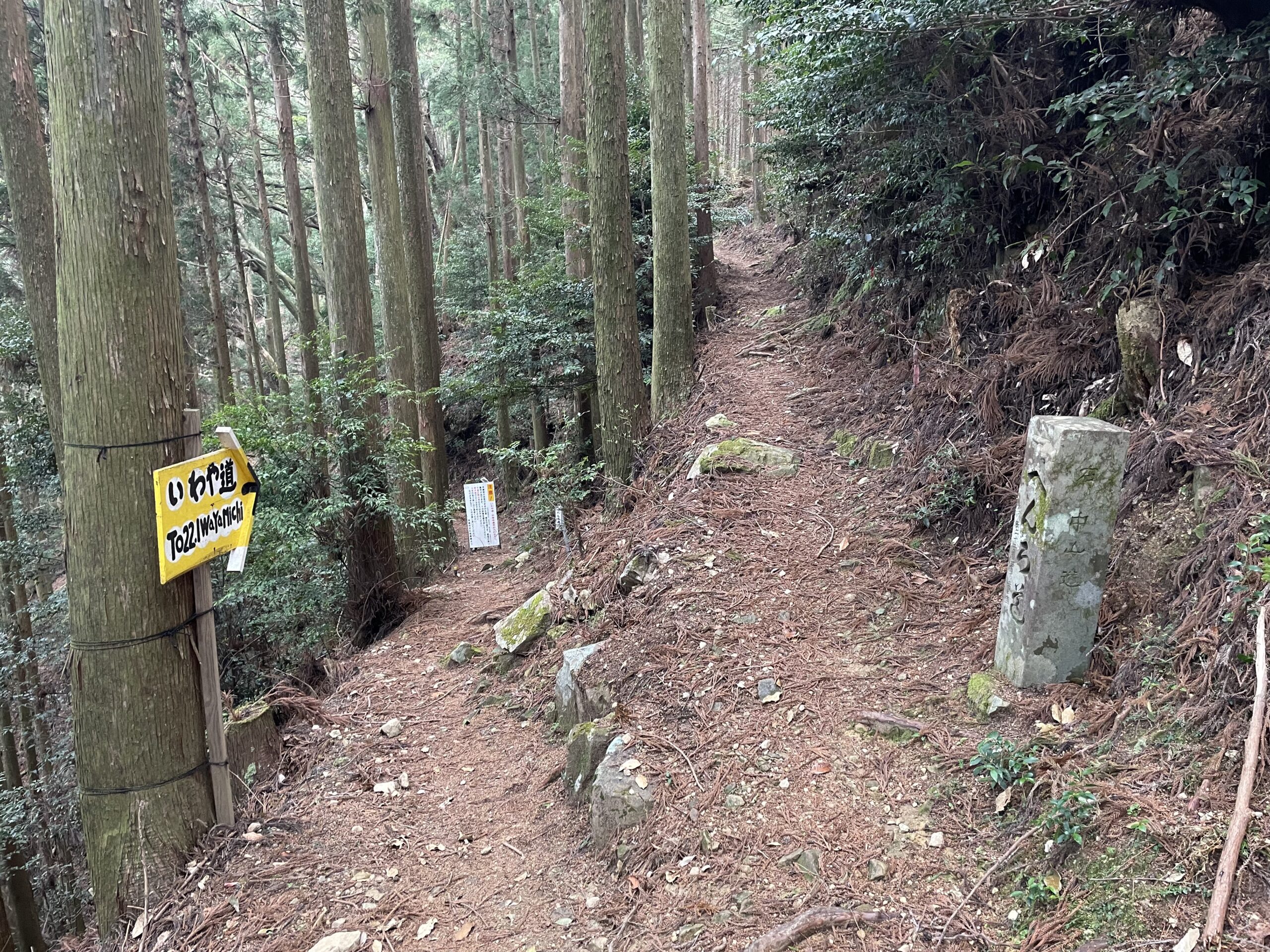 心もち急ぎ足で看板の先へ足を踏み入れる。「いわや道」は舎心ヶ嶽から「平等寺道」に交わるまでの約2.5kmの区間、たまーに岩場があるが基本的には落ち葉が降り積もった平坦な下りで、ふかふかしてとても歩きやすかった。焼山寺でも時々平らな尾根筋があって、えっちらおっちら登ってきたあとにこういう道になるとビックリするくらいスタスタと歩けて距離が稼げる気がしたものだが、こういう道を自分は「高速道路」と呼んでいた。よし、どんどん進んで時間を巻くぞ。杉林の中を飛脚のように爆速で駆け抜ける。